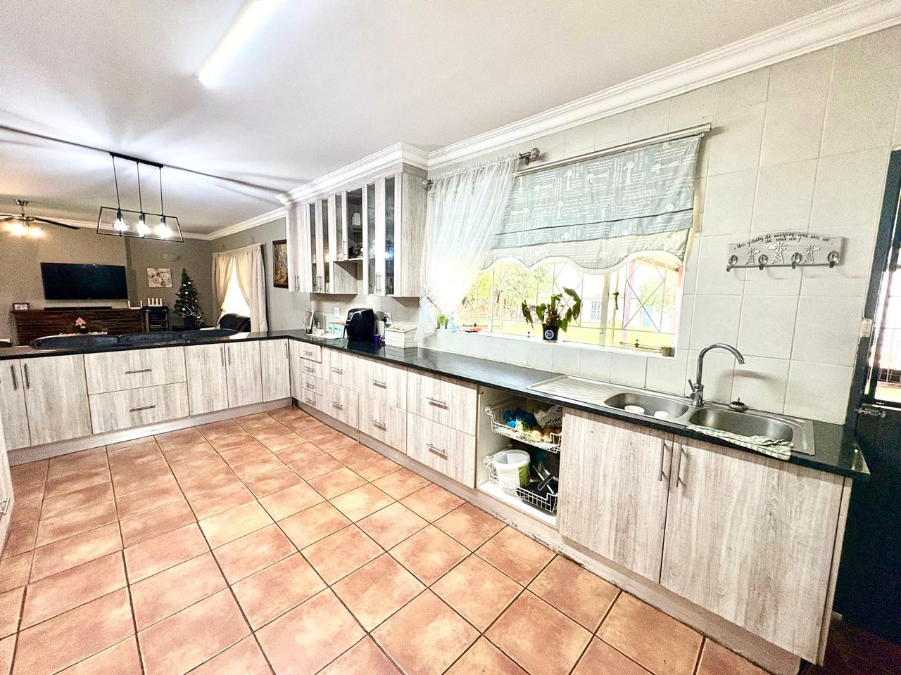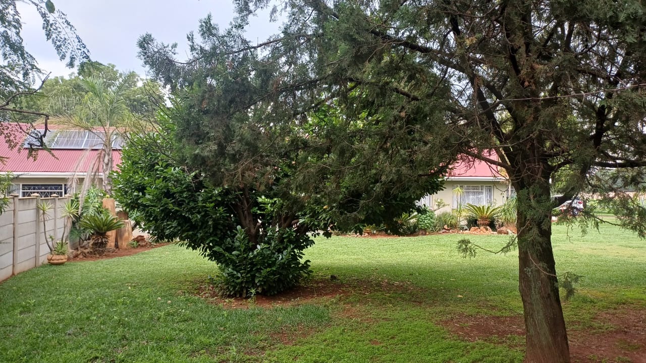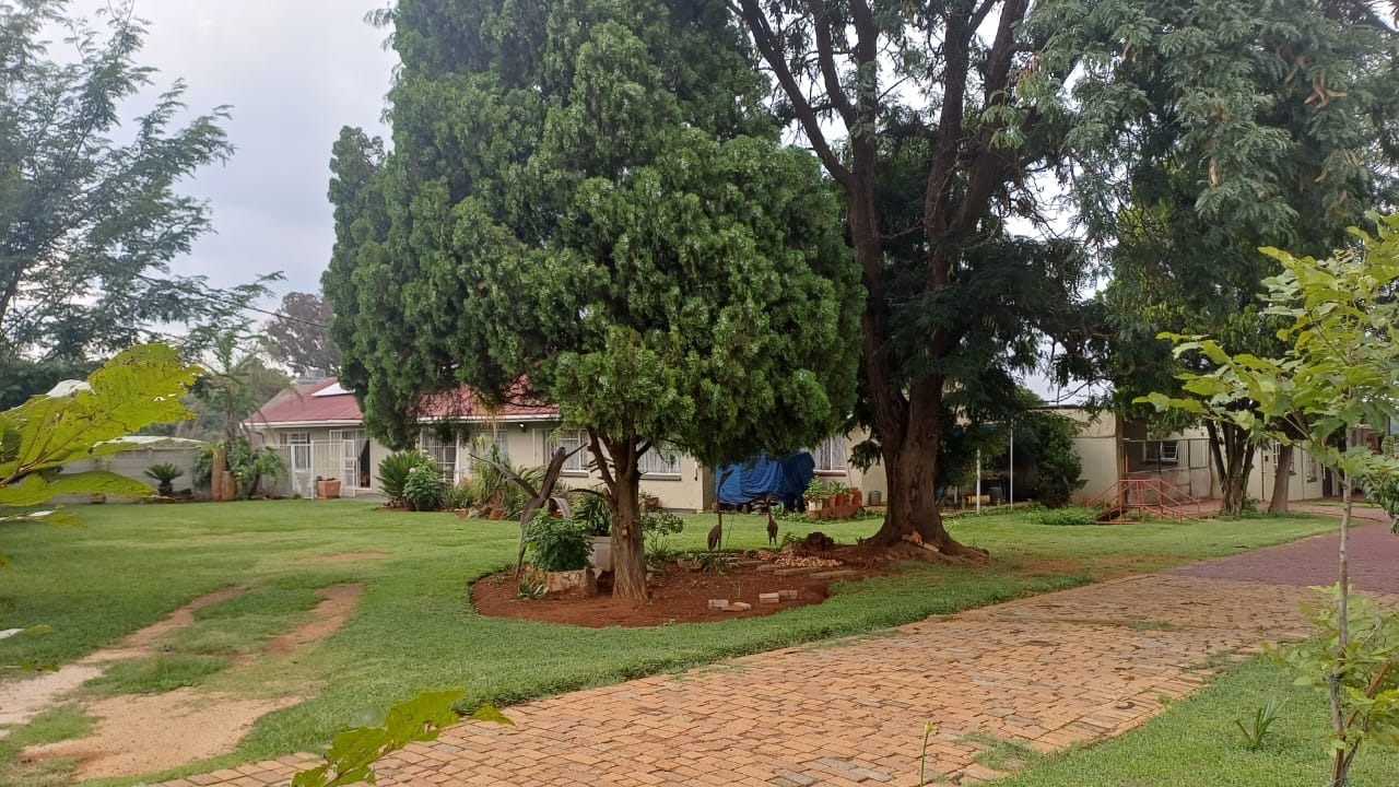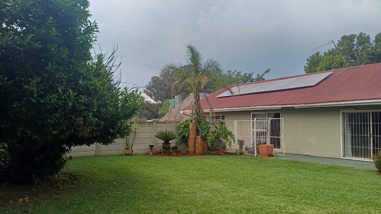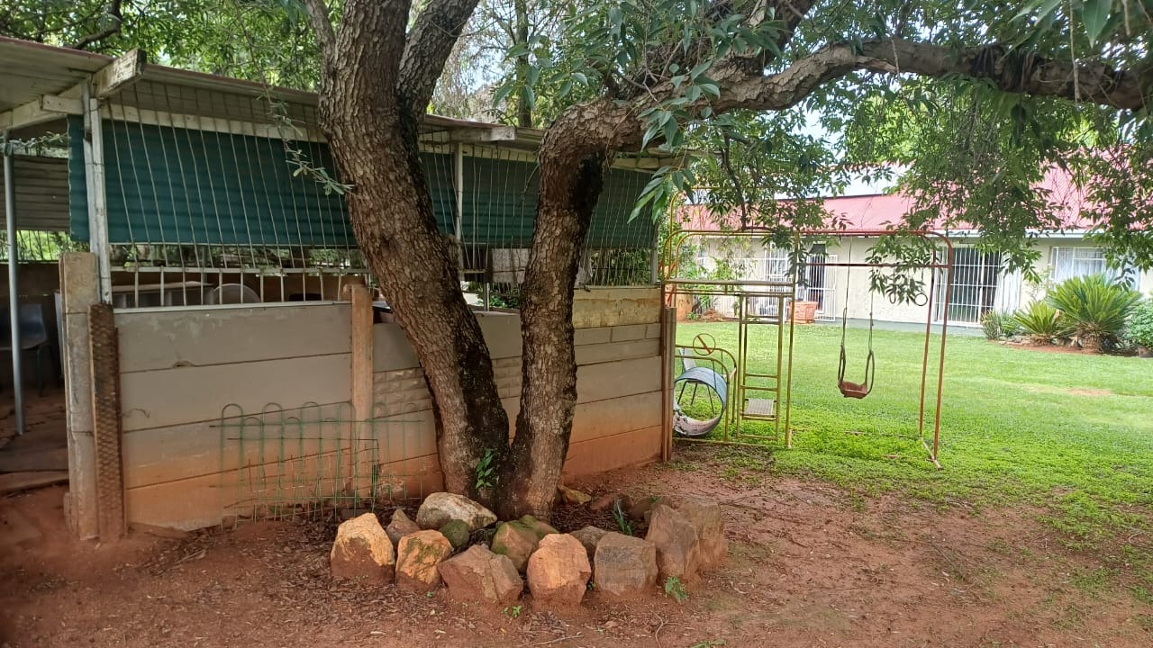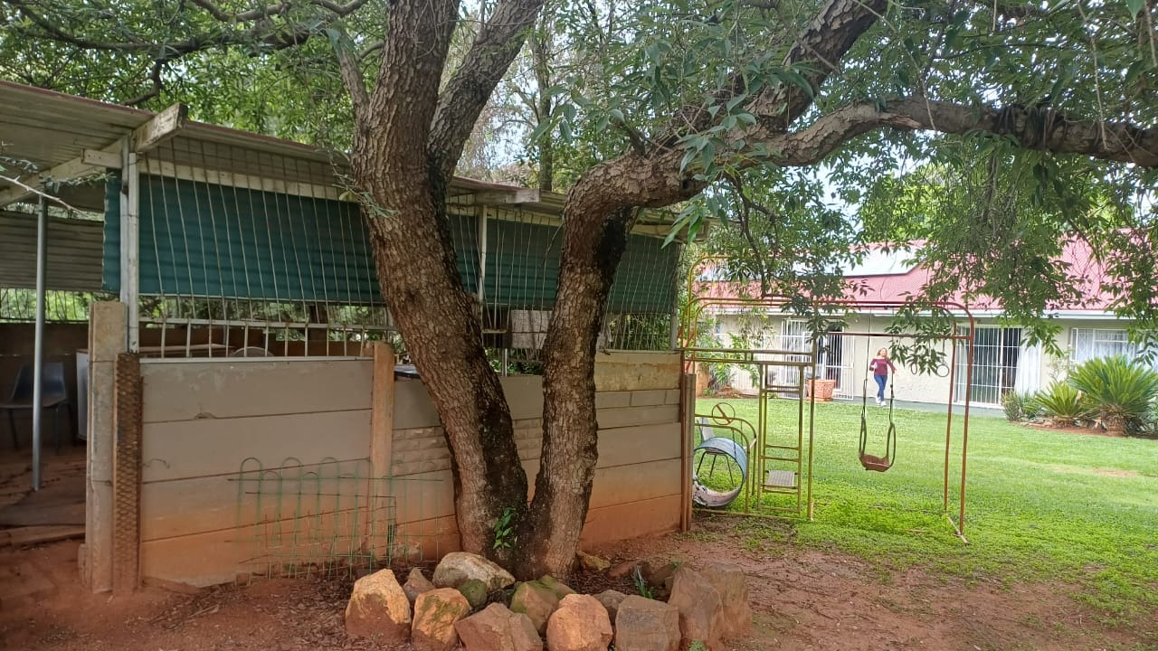 For entertaining and outdoor living, there is a large lapa situated next to the house with a built-in braai, as well as a large swimming pool. The property further includes an outside building that functions as a flat, offering a bedroom with built-in cupboards, a kitchen with built-in cupboards, a bathroom with a shower, basin, and toilet, and a dining and living area. Additional outside buildings consist of three staff quarters with an outside toilet. Parking is well catered for with undercover parking for four vehicles.
