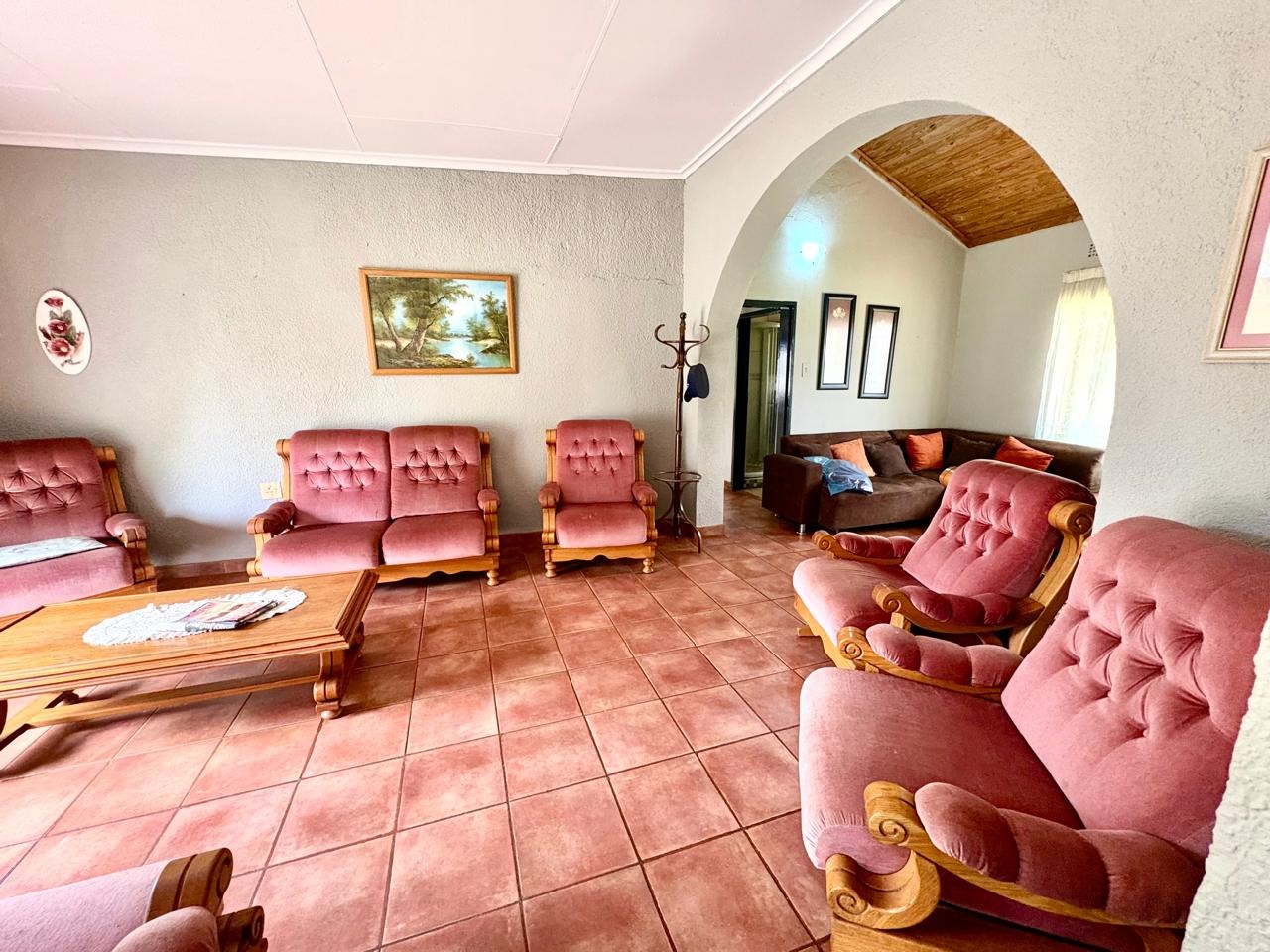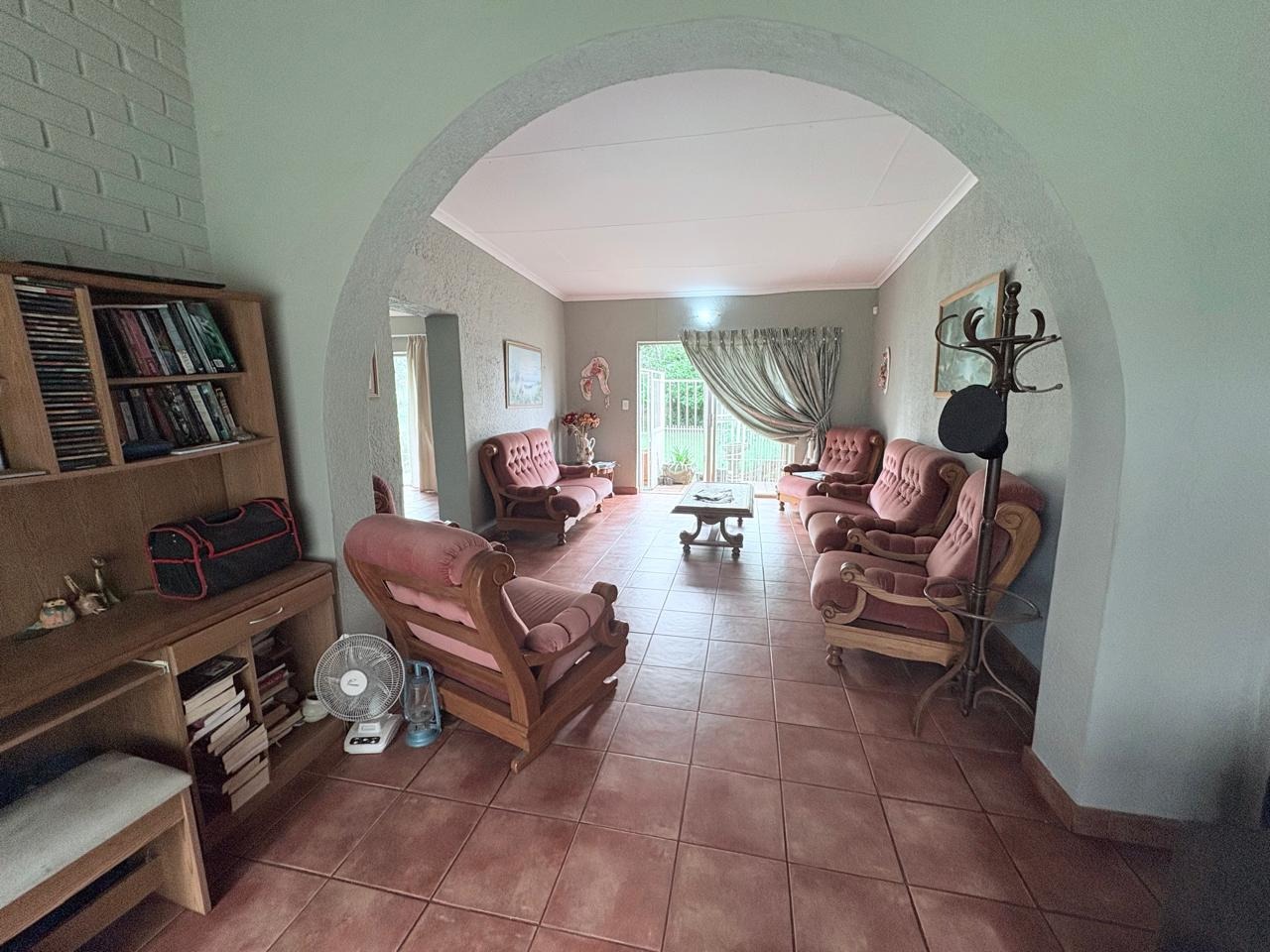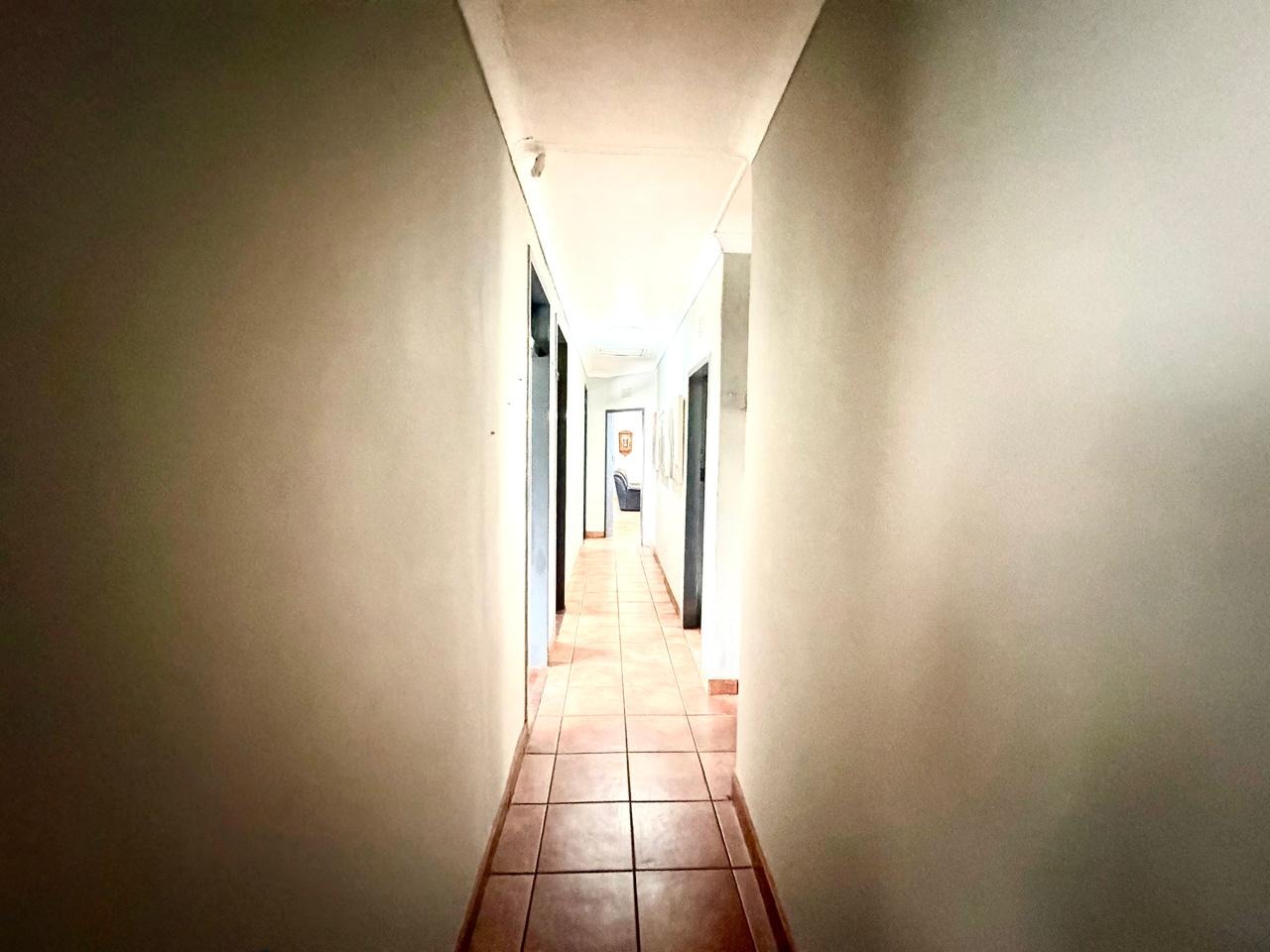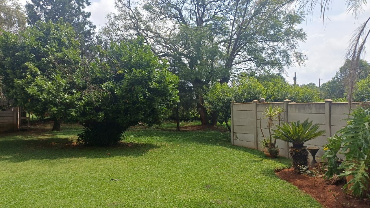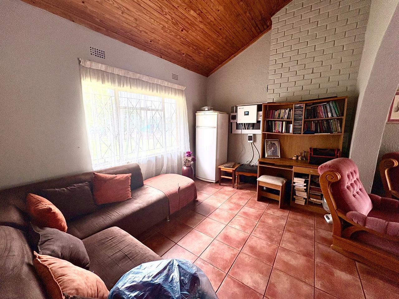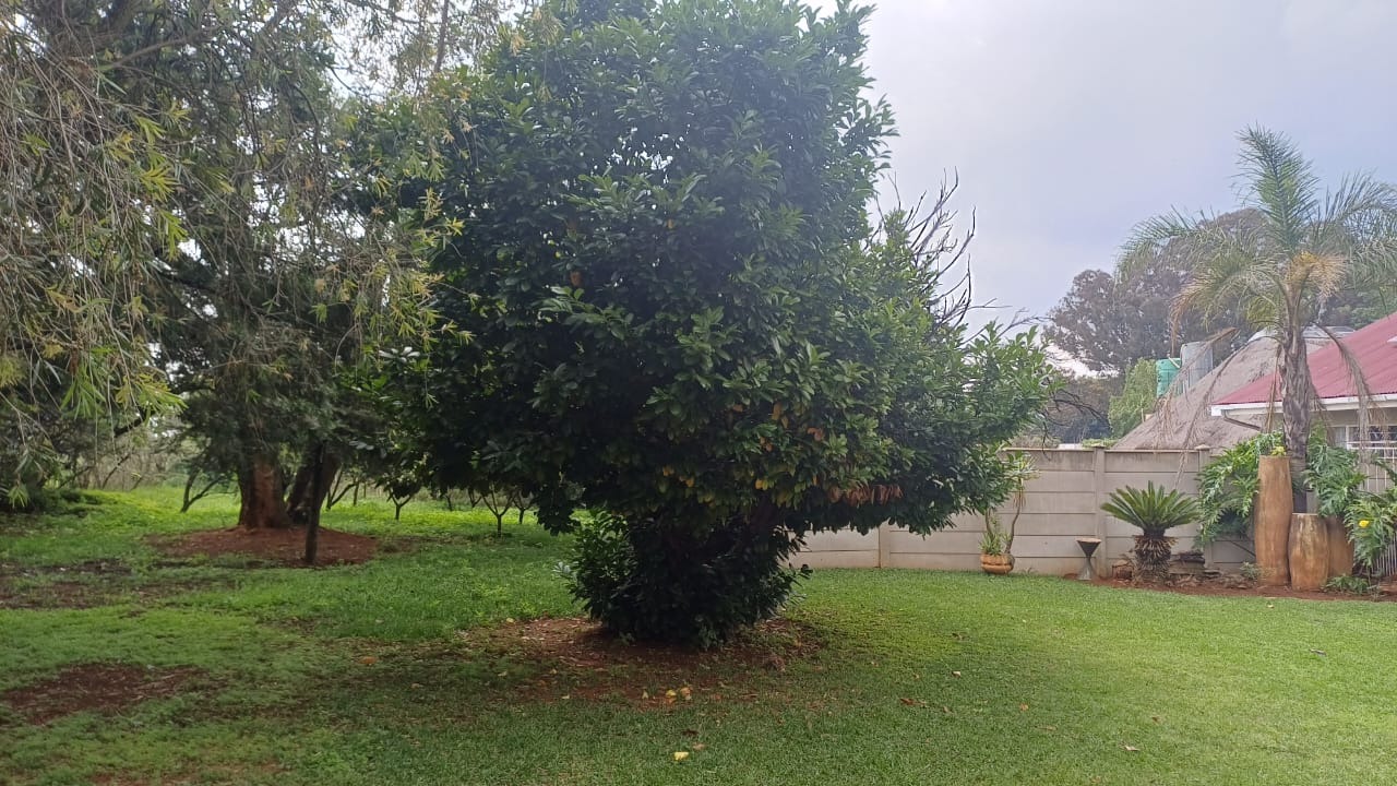 For entertaining and outdoor living, there is a large lapa situated next to the house with a built-in braai, as well as a large swimming pool. The property further includes an outside building that functions as a flat, offering a bedroom with built-in cupboards, a kitchen with built-in cupboards, a bathroom with a shower, basin, and toilet, and a dining and living area. Additional outside buildings consist of three staff quarters with an outside toilet. Parking is well catered for with undercover parking for four vehicles.