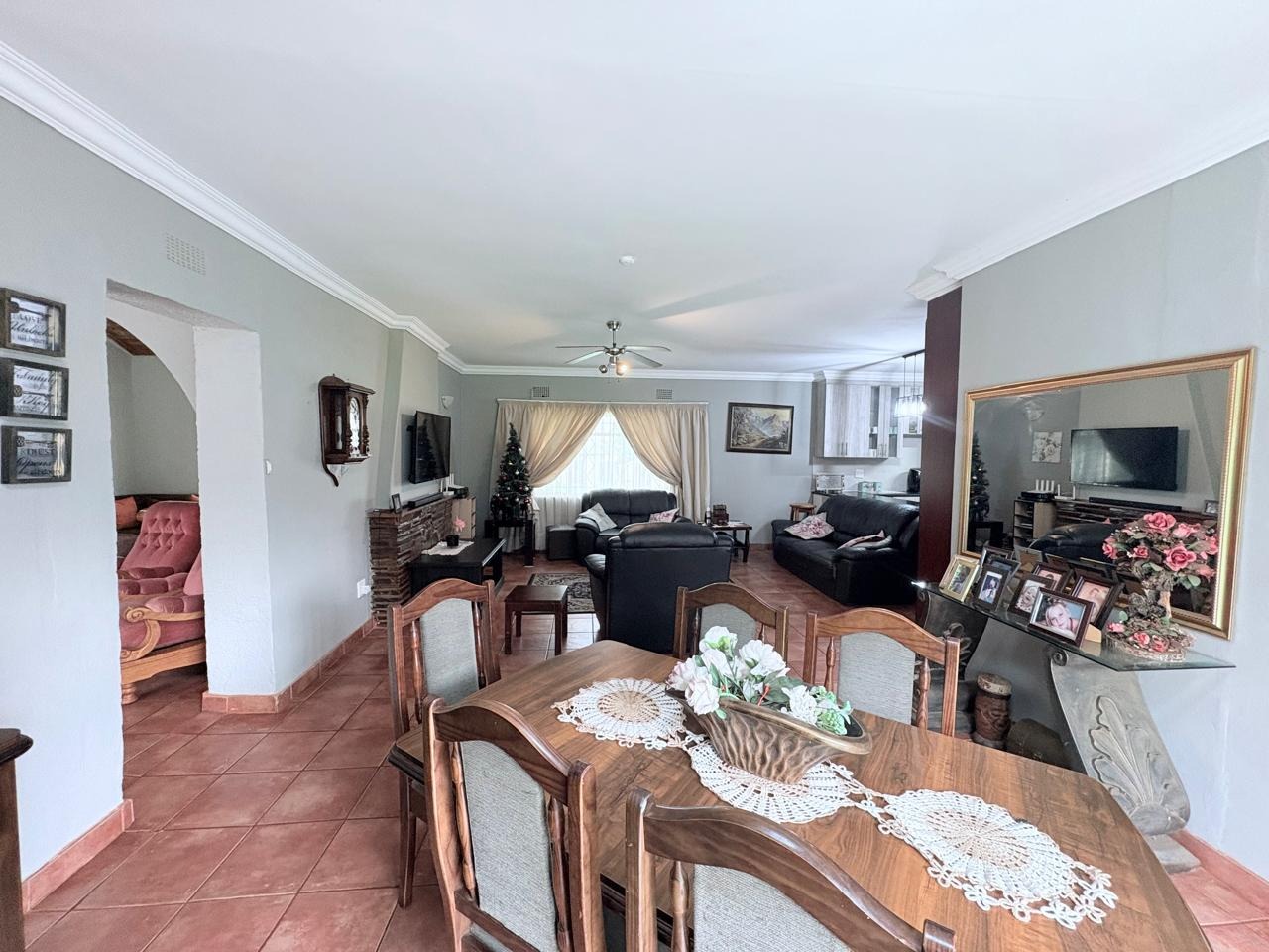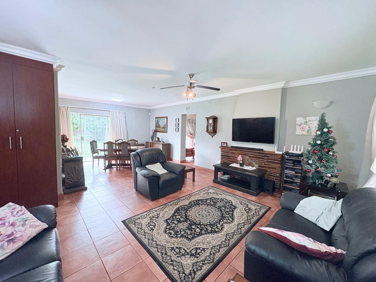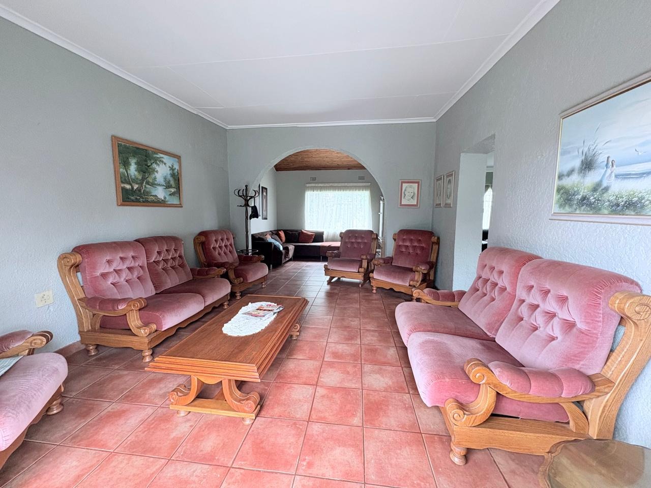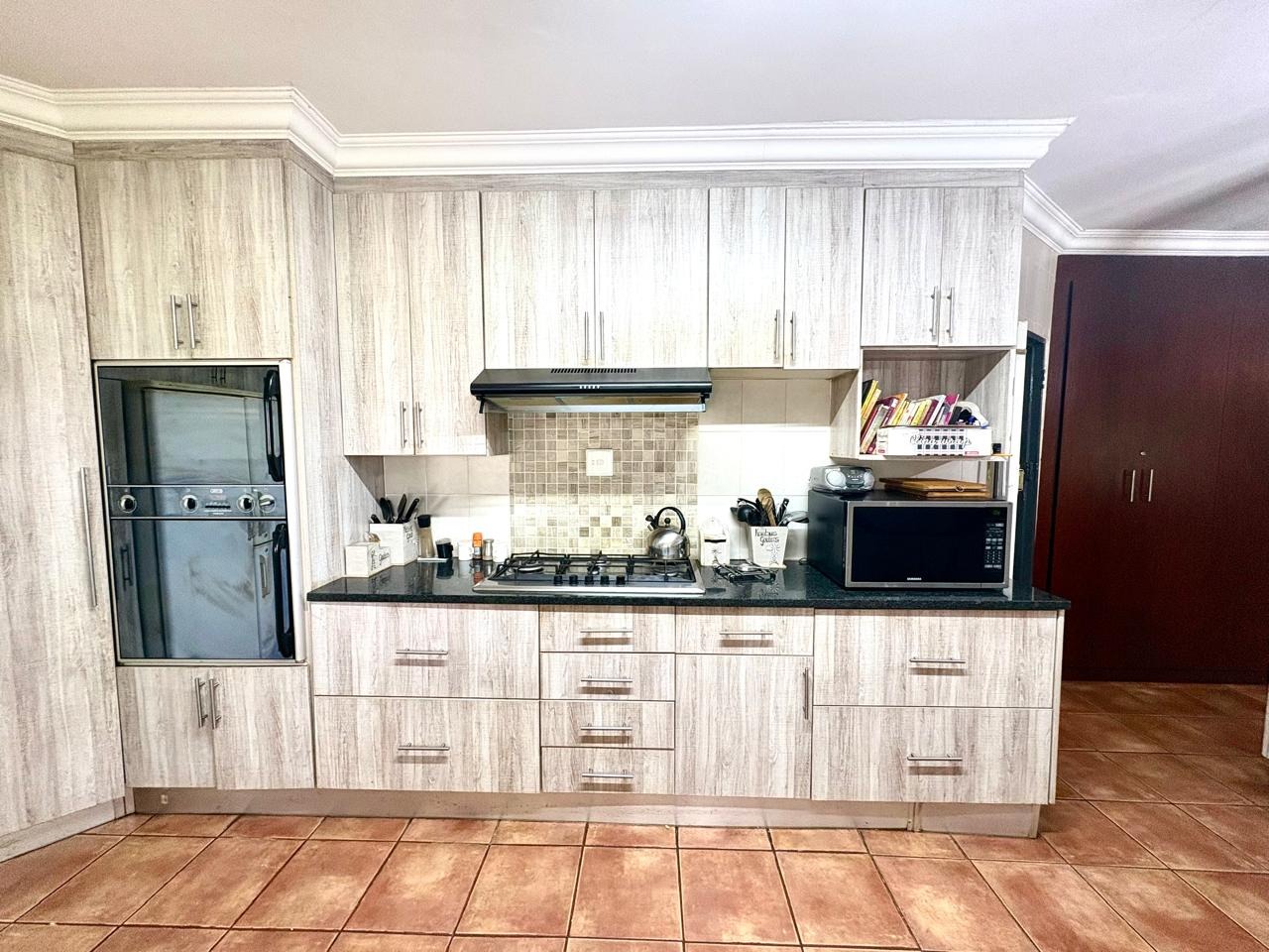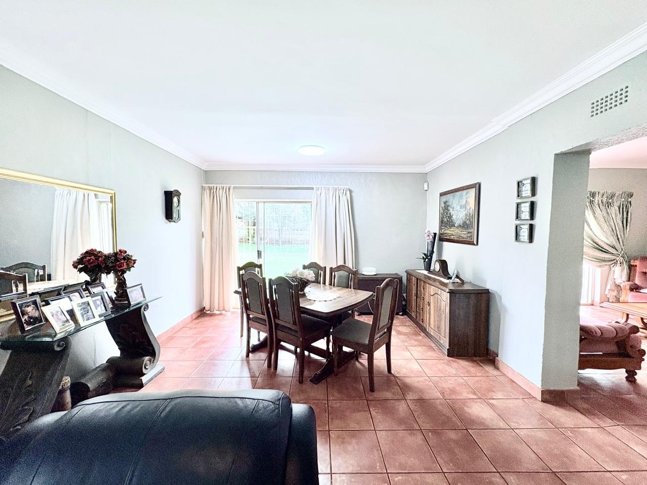 For entertaining and outdoor living, there is a large lapa situated next to the house with a built-in braai, as well as a large swimming pool. The property further includes an outside building that functions as a flat, offering a bedroom with built-in cupboards, a kitchen with built-in cupboards, a bathroom with a shower, basin, and toilet, and a dining and living area. Additional outside buildings consist of three staff quarters with an outside toilet. Parking is well catered for with undercover parking for four vehicles.