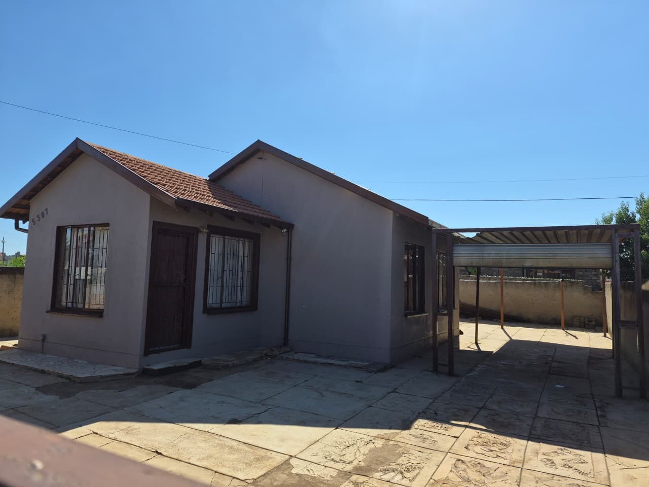 This single-story home in Mohlakeng, Randfontein, offers a secure and practical living environment. The property features a robust perimeter with a brick wall and a large metal sliding gate, complemented by security bars on all windows for enhanced peace of mind. A paved forecourt provides ample off-street parking, including a covered structure for convenience, ensuring a low-maintenance exterior.
