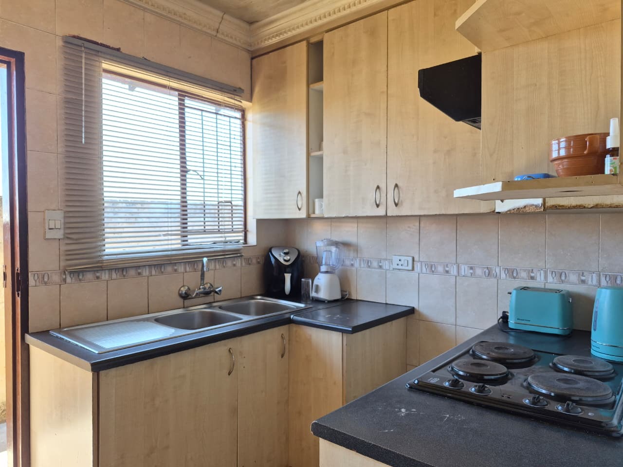 Inside, the residence presents a functional layout designed for everyday living. The cozy lounge area benefits from natural light through multiple windows and features practical tiled flooring, ideal for easy maintenance. The kitchen is equipped with light wood-look cabinetry, a double sink, and a built-in oven and hob with an extractor fan, offering essential amenities for daily cooking.