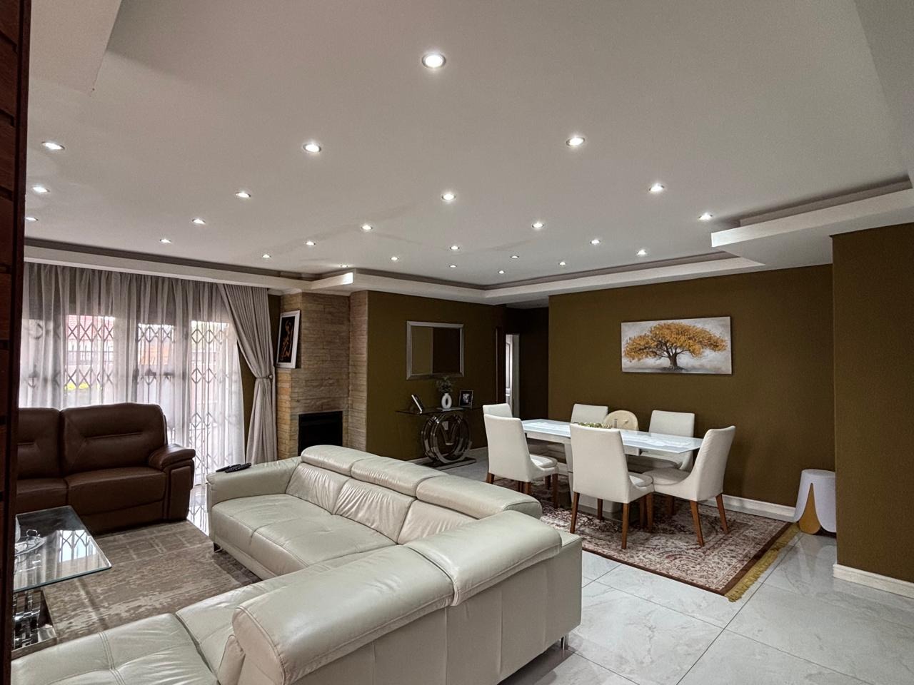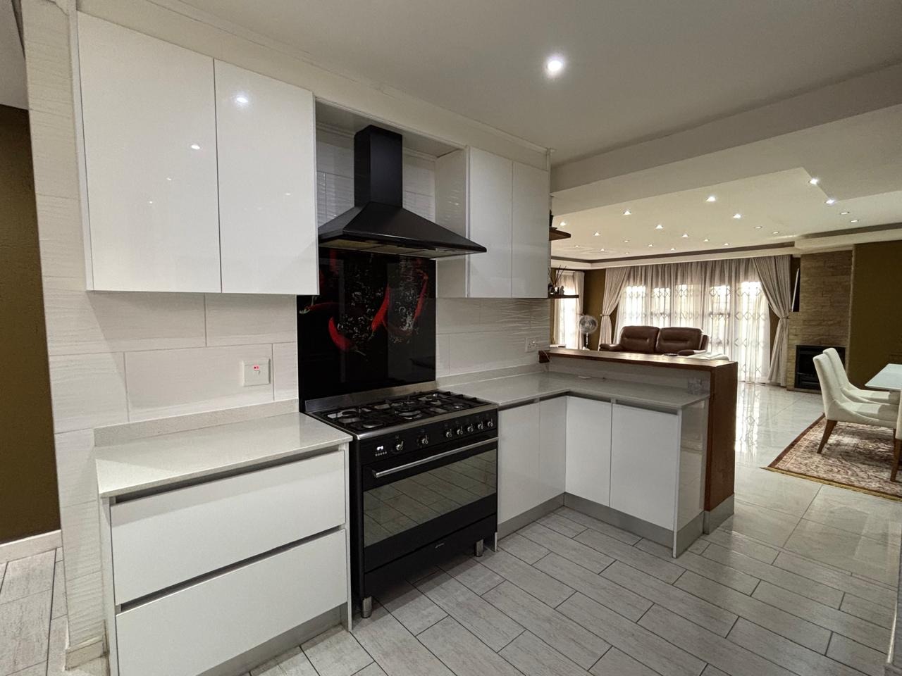 The interior boasts an open-plan layout, seamlessly connecting the spacious living and dining areas. These spaces feature sleek tiled flooring, contemporary multi-layered ceilings with abundant recessed lighting, and a striking fireplace with a stone accent wall, creating an elegant focal point. The modern kitchen is a highlight, equipped with white high-gloss cabinetry, a gas hob, an extractor fan, and an integrated breakfast bar, complemented by a convenient pantry and a dedicated laundry area.