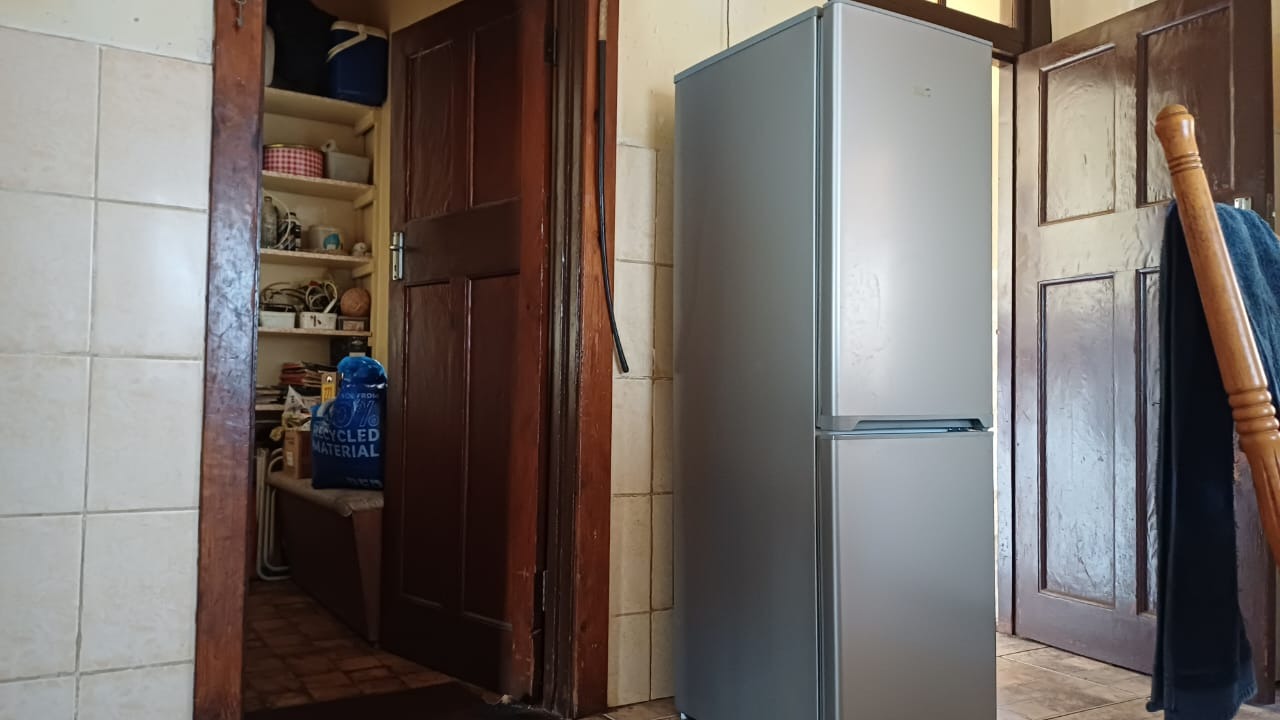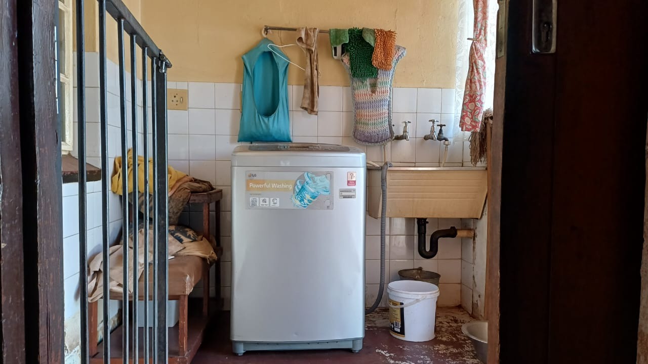 Functional kitchen with tiled flooring, steel cupboards, a pantry, and a separate laundry/washing room