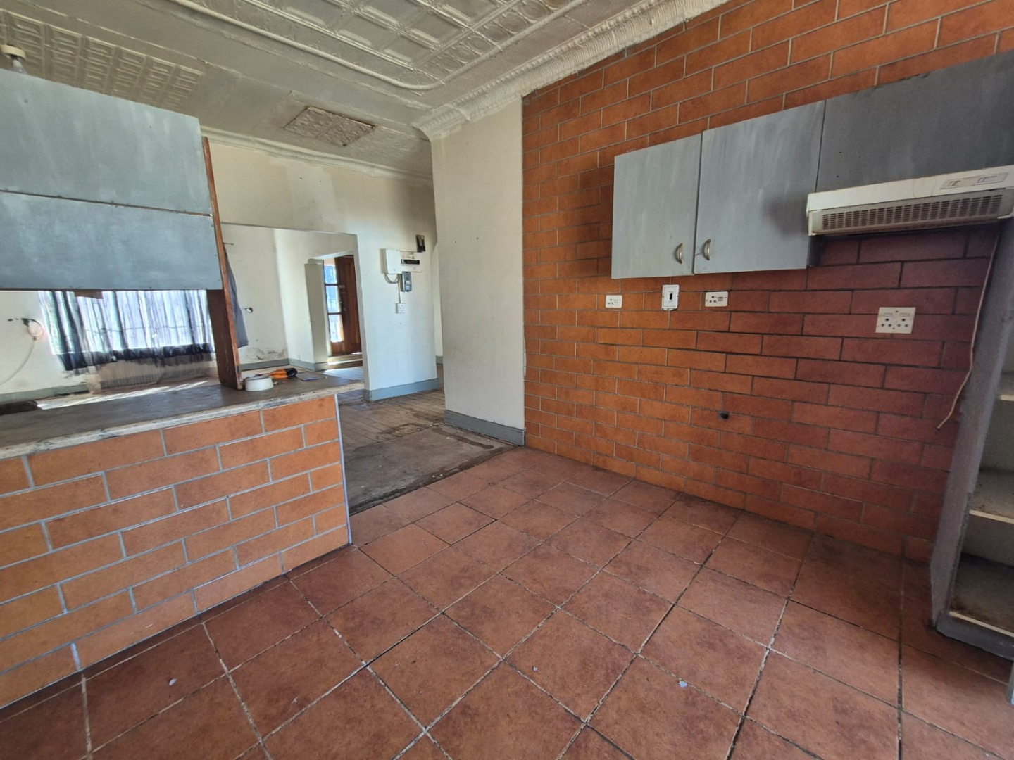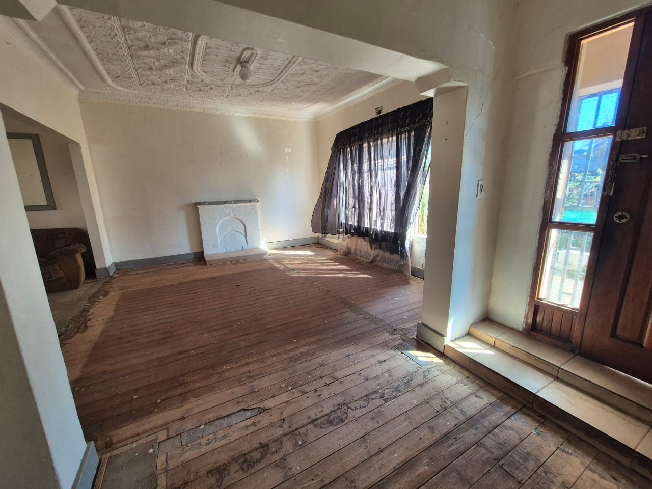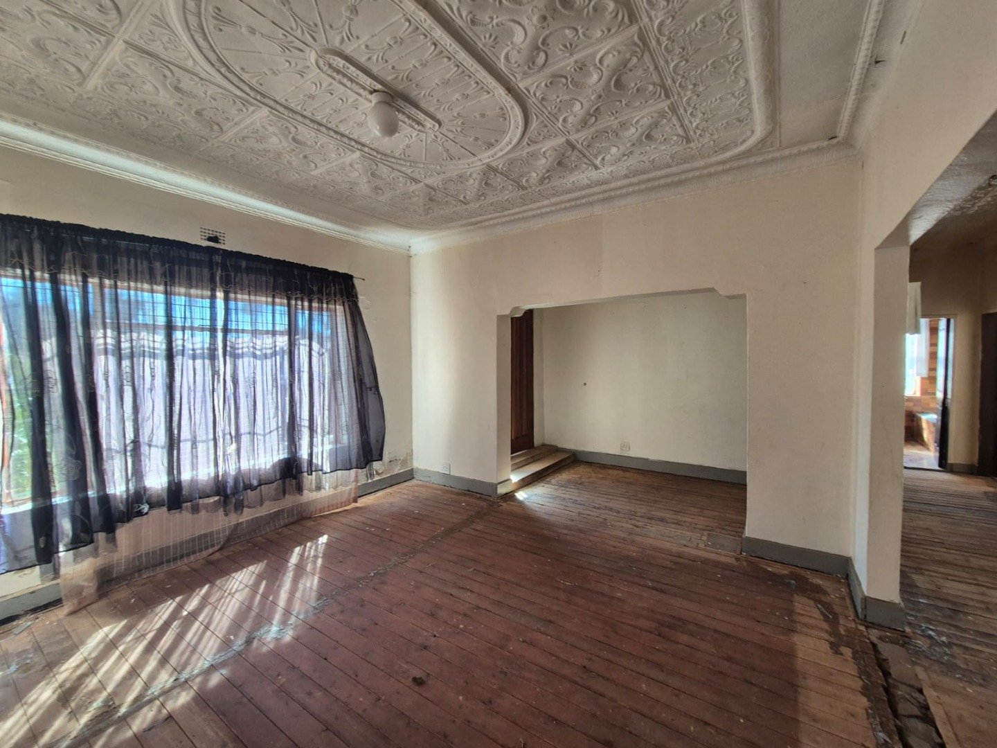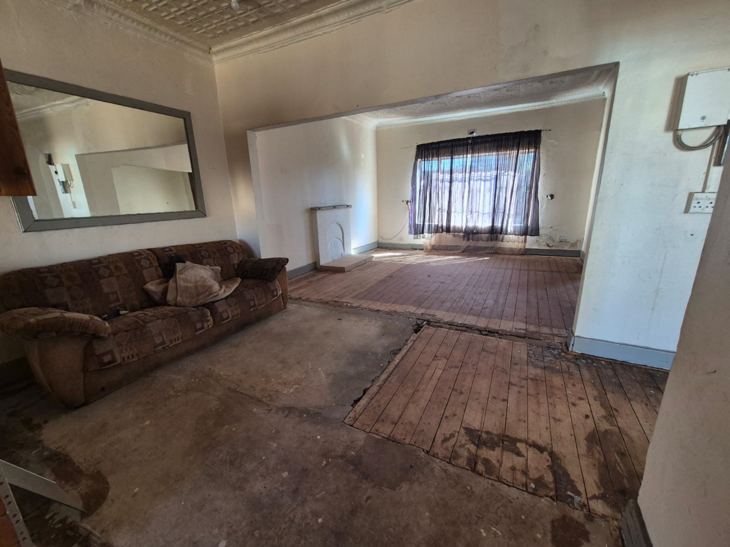 Inside, the property features an open-plan lounge, dining room, and kitchen. The kitchen is tiled and fitted with curtain rails, while the lounge and dining room floors have been stripped, exposing wooden floorboards that require some attention. The entire house boasts high ceilings, adding a sense of openness and character.