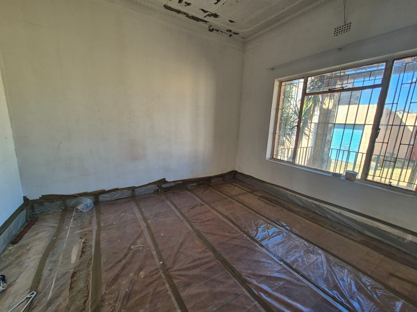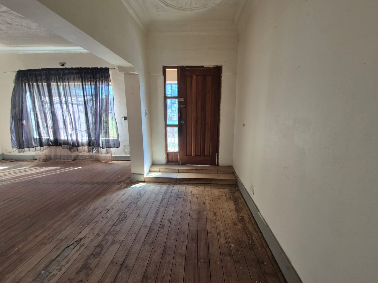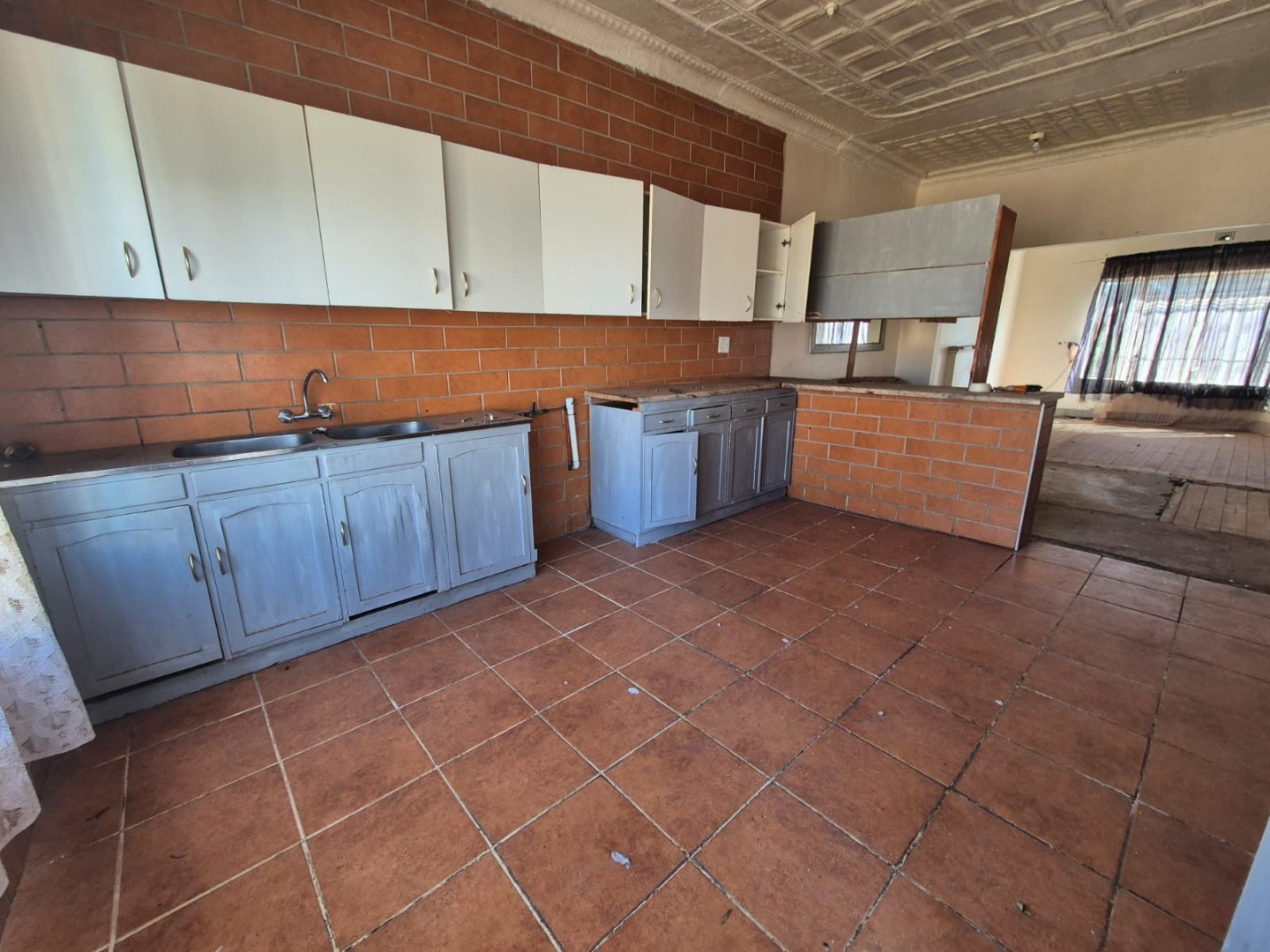 Inside, the property features an open-plan lounge, dining room, and kitchen. The kitchen is tiled and fitted with curtain rails, while the lounge and dining room floors have been stripped, exposing wooden floorboards that require some attention. The entire house boasts high ceilings, adding a sense of openness and character.