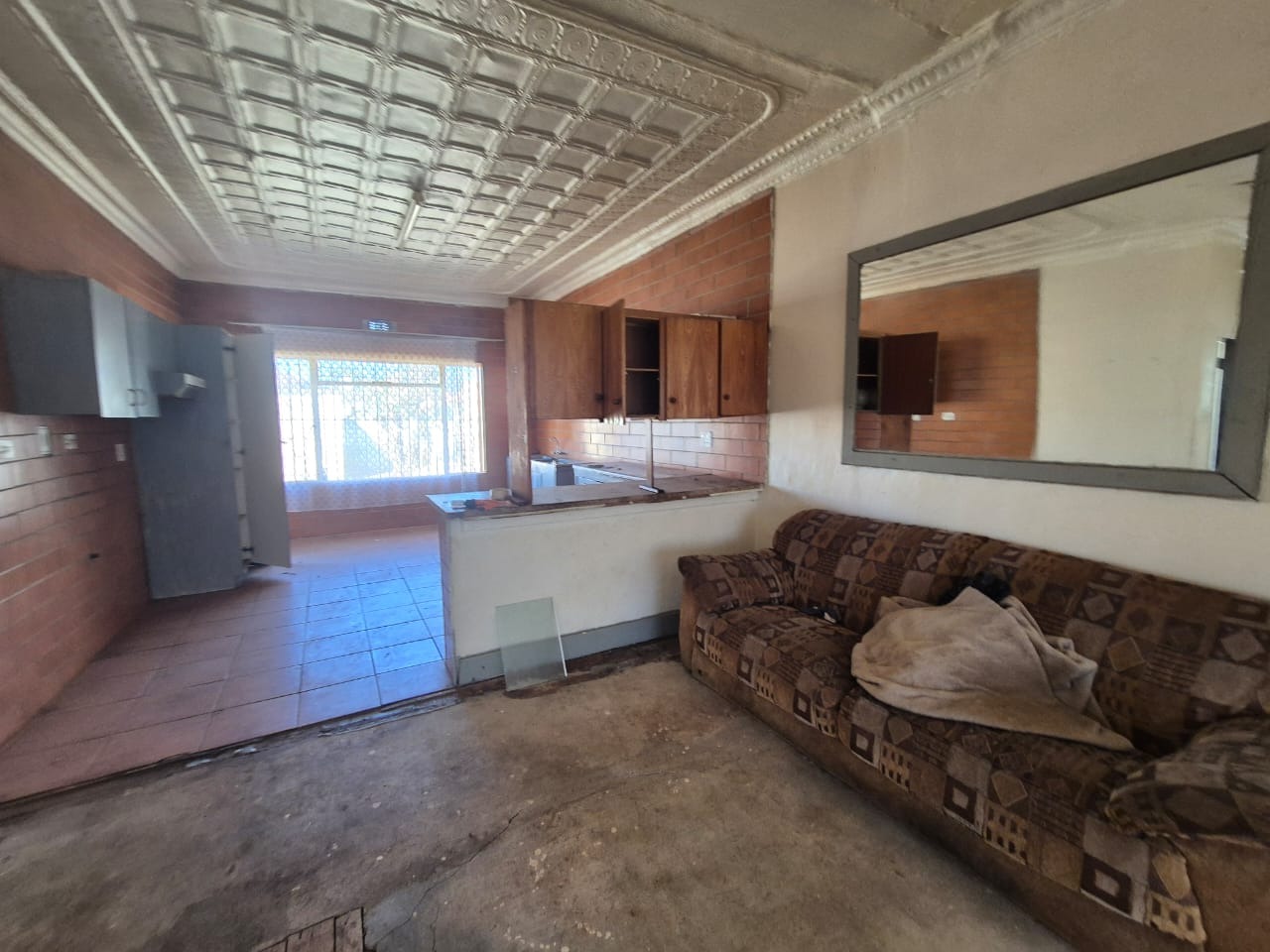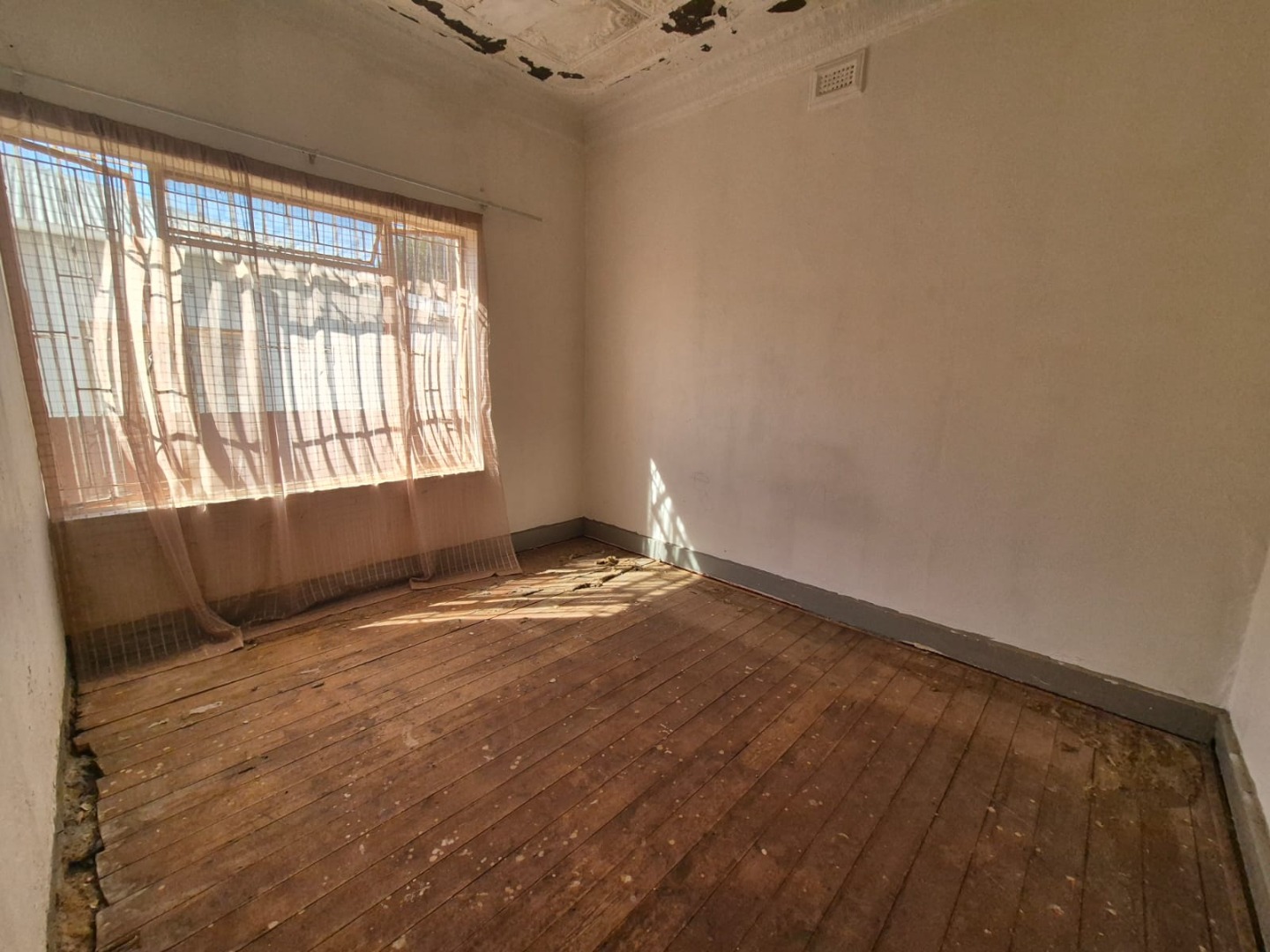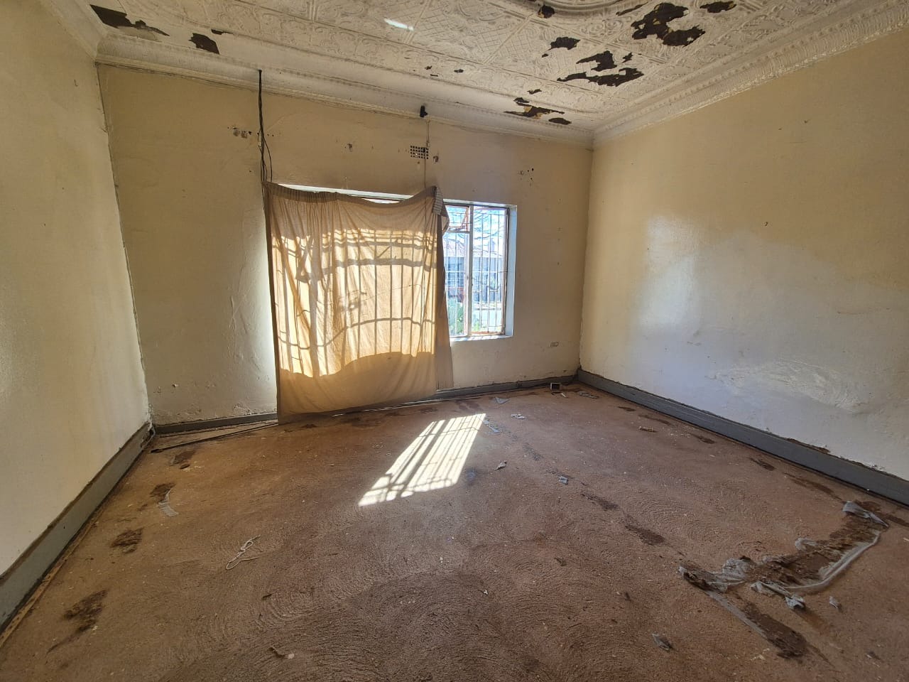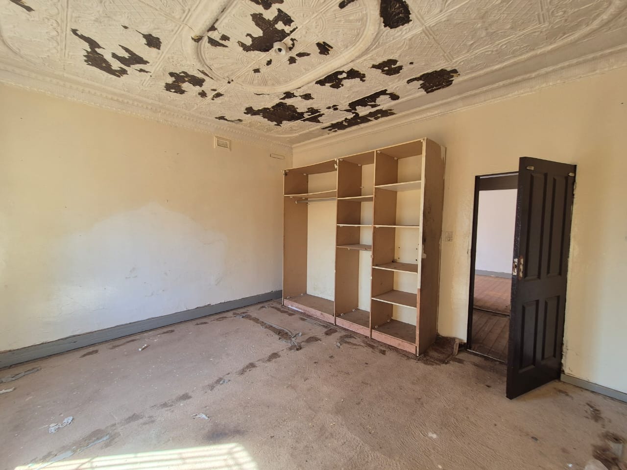 Inside, the property features an open-plan lounge, dining room, and kitchen. The kitchen is tiled and fitted with curtain rails, while the lounge and dining room floors have been stripped, exposing wooden floorboards that require some attention. The entire house boasts high ceilings, adding a sense of openness and character.