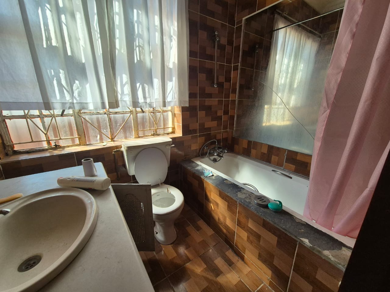 There are three bedrooms, all without cupboards as they have been removed, and each with wooden floors in need of repair. All bedrooms are fitted with curtain rails. The bathroom includes a bath, basin, and toilet, with tiled finishes and curtain rails.