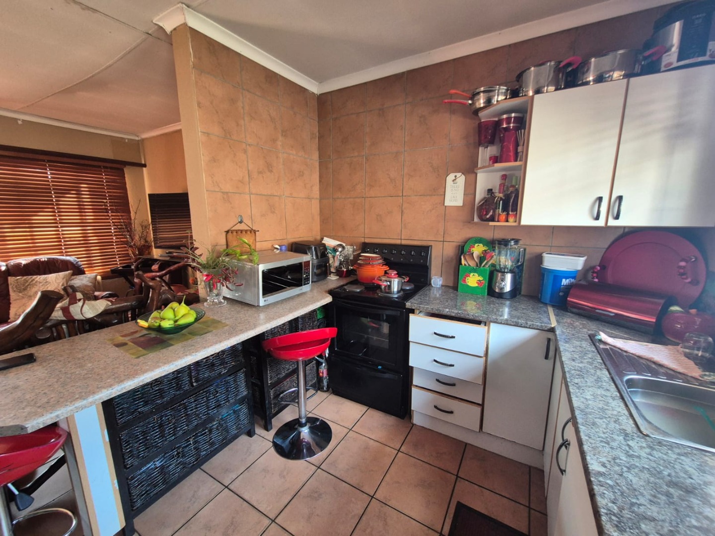 The functional kitchen is thoughtfully laid out with an L-shaped counter, a practical breakfast bar, and ample cabinet and shelf storage, providing a solid foundation for culinary activities. While the current aesthetic presents a dated charm and some visible wear, this space holds significant potential for contemporary updates, allowing you to craft a kitchen perfectly suited to your taste and lifestyle. The single lounge area flows effortlessly from the kitchen, enhancing the open-plan feel.