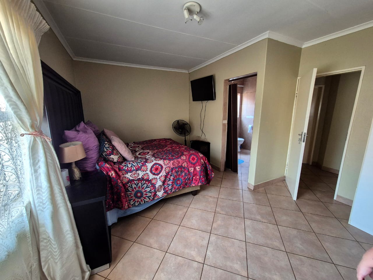 With built-in cabinets for enough storage and a stove, oven, and extractor fan, the kitchen is both functional and fashionable. The open-plan lounge is the ideal place to unwind or host guests because it is light and spacious and has tiled floors and curtain rails. With two well-appointed bathrooms—one with a bathtub and toilet, and the other with a shower, sink, and toilet—this house offers versatility for daily need.