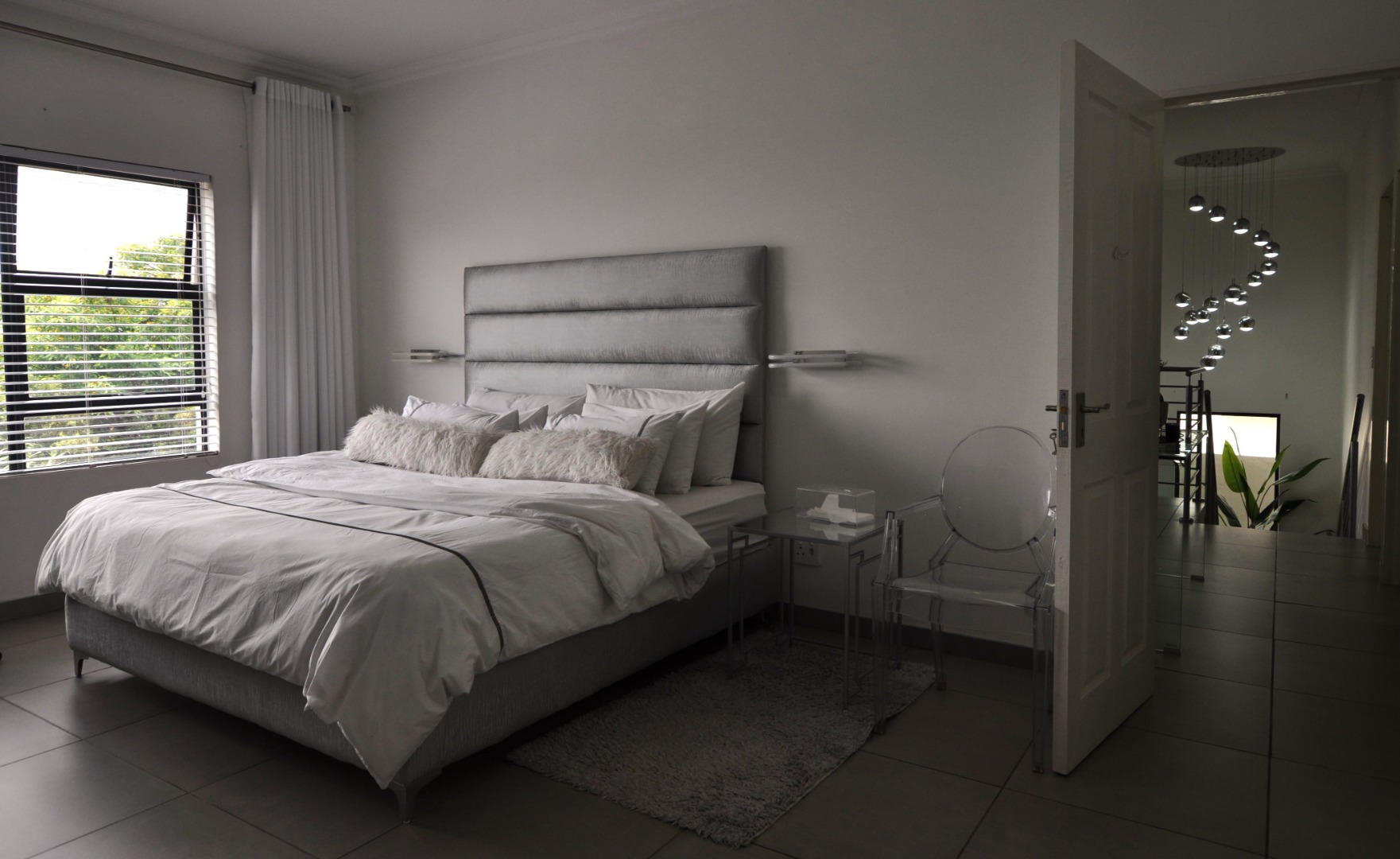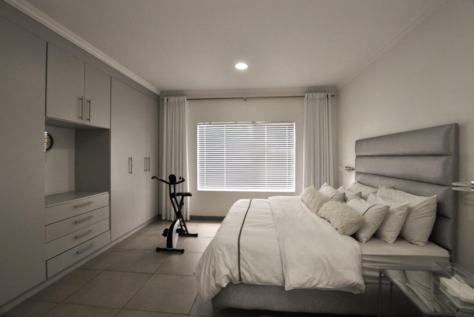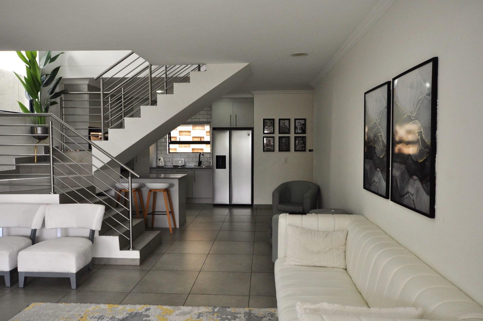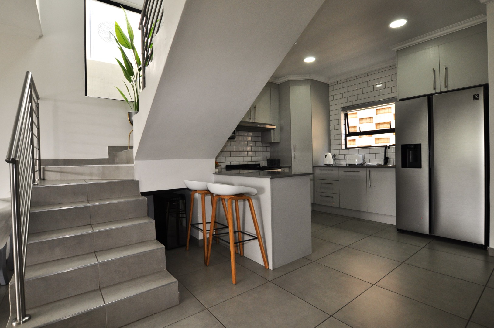 Discover an exquisite contemporary residence nestled within a prestigious estate in Allen's Nek, Roodepoort, South Africa. This architectural marvel presents a striking modern facade with a sophisticated grey and white palette, immediately captivating with its integrated double garage and elegantly paved driveway. Step inside to an expansive 195 sqm of meticulously designed living space, where an open-plan layout seamlessly connects the sophisticated lounge and dining areas. Abundant natural light floods these spaces through large windows, complemented by recessed lighting, creating an inviting and luminous ambiance. The heart of this home is its state-of-the-art kitchen, a culinary haven featuring sleek light grey and white cabinetry, pristine subway tile backsplashes, and premium stainless steel appliances, including a gas range. A cleverly integrated breakfast bar beneath the stylish staircase offers a casual dining experience, while the overall design ensures both functionality and aesthetic appeal. The modern staircase, with its metallic accents and sleek railing, serves as a central design feature, leading to the private quarters above. This distinguished property boasts four generously proportioned bedrooms and two and a half luxurious bathrooms, including a convenient guest toilet. Each bedroom is a sanctuary of comfort, featuring extensive built-in cabinetry for ample storage, neutral decor, and large windows that invite serene views. The master suite, with its plush upholstered headboard and en-suite access, promises a private retreat. An integrated vanity/desk area in one of the rooms adds a touch of practical elegance. Outdoor living is elevated by a private balcony, offering picturesque views of distant hills – a perfect setting for tranquil moments. The property is part of a secure estate, providing peace of mind with 24-hour security, an access gate, security post, and electric fencing. Modern conveniences include fibre connectivity, ensuring seamless digital living. This residence epitomizes refined estate living, blending contemporary design with unparalleled security and comfort. Key Features: * Modern Architectural Design * 4 Bedrooms, 2.5 Bathrooms * Open-Plan Living & Dining * Contemporary Kitchen with Premium Appliances * Integrated Double Garage * Private Balcony with Scenic Views * Secure Estate Living with 24-Hour Security * Fibre Connectivity * 195 sqm Floor Size * Paved Driveway