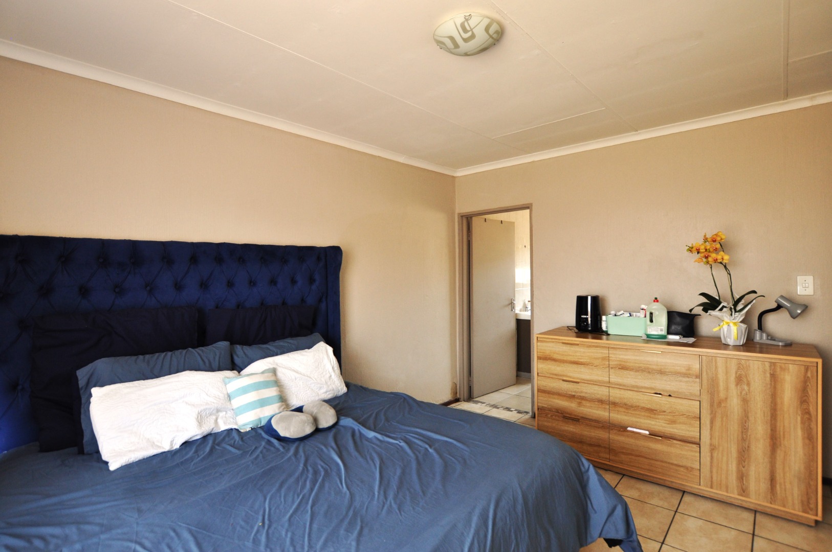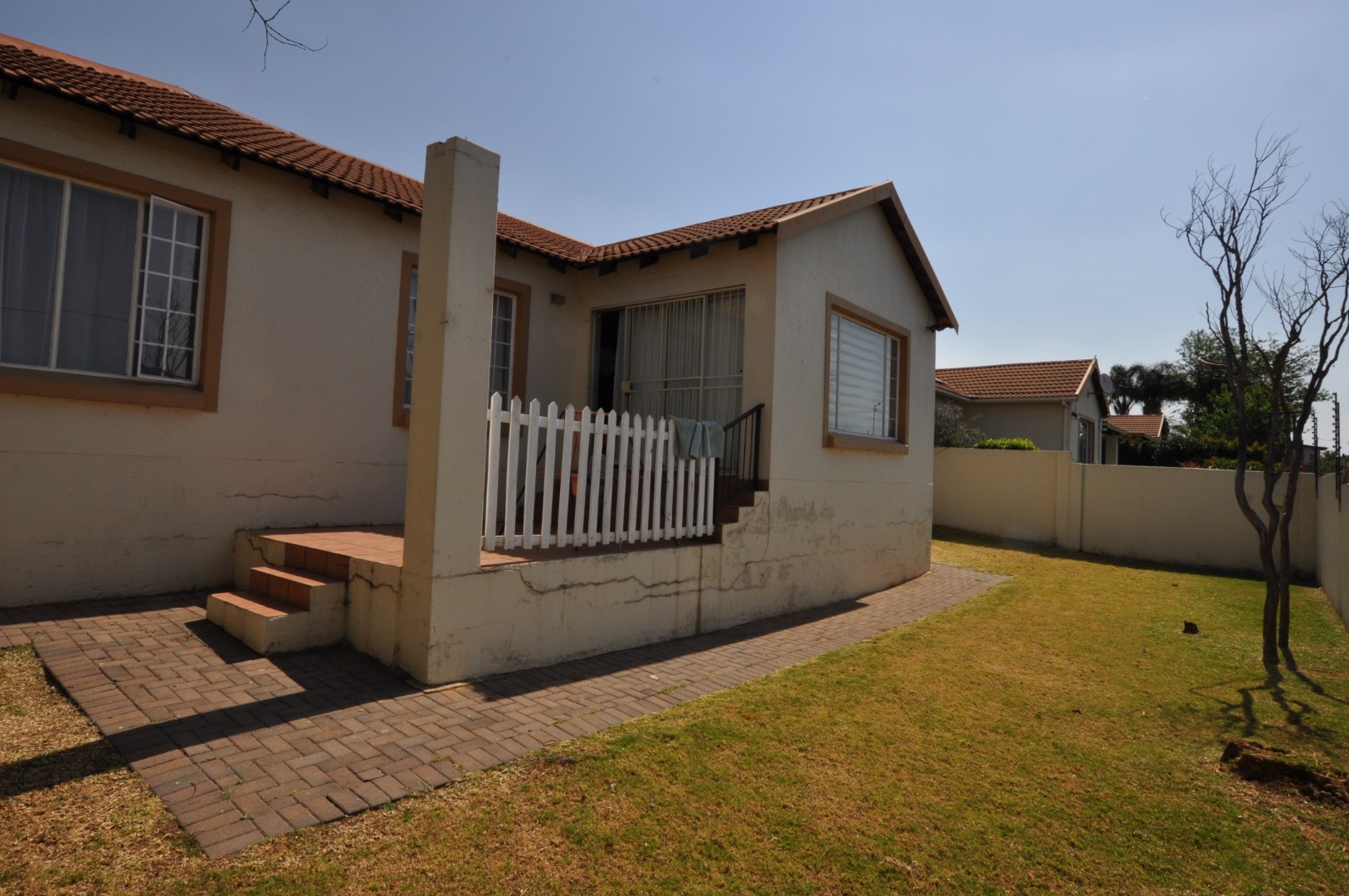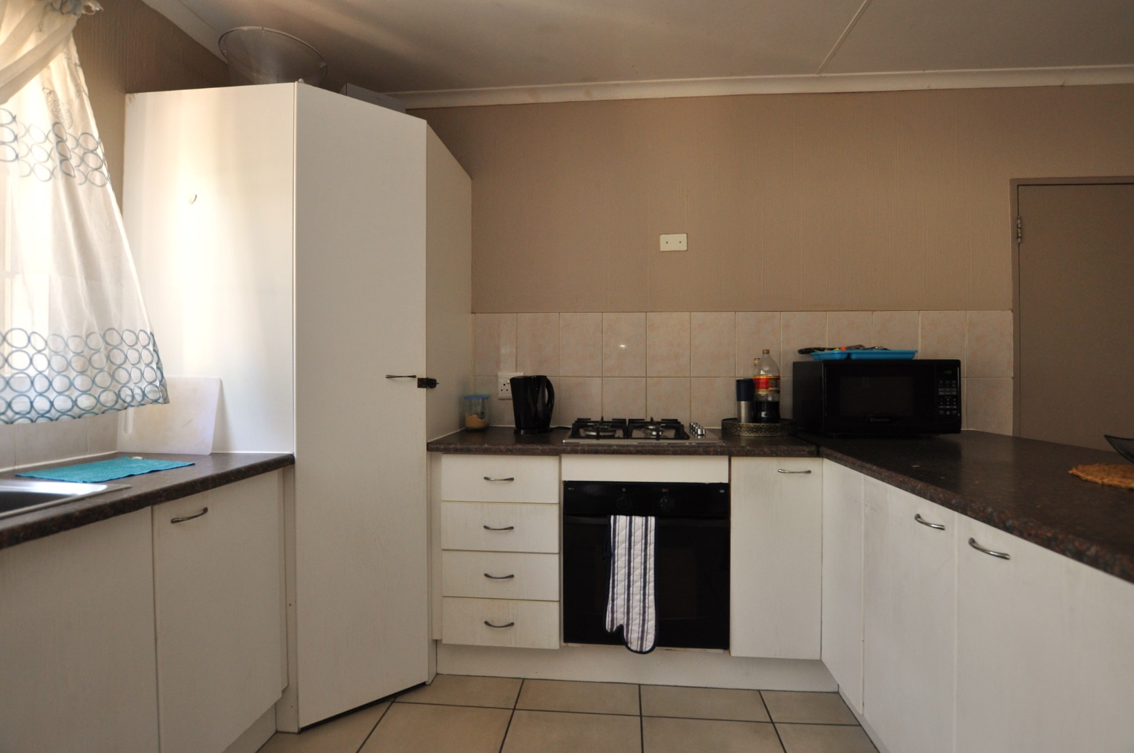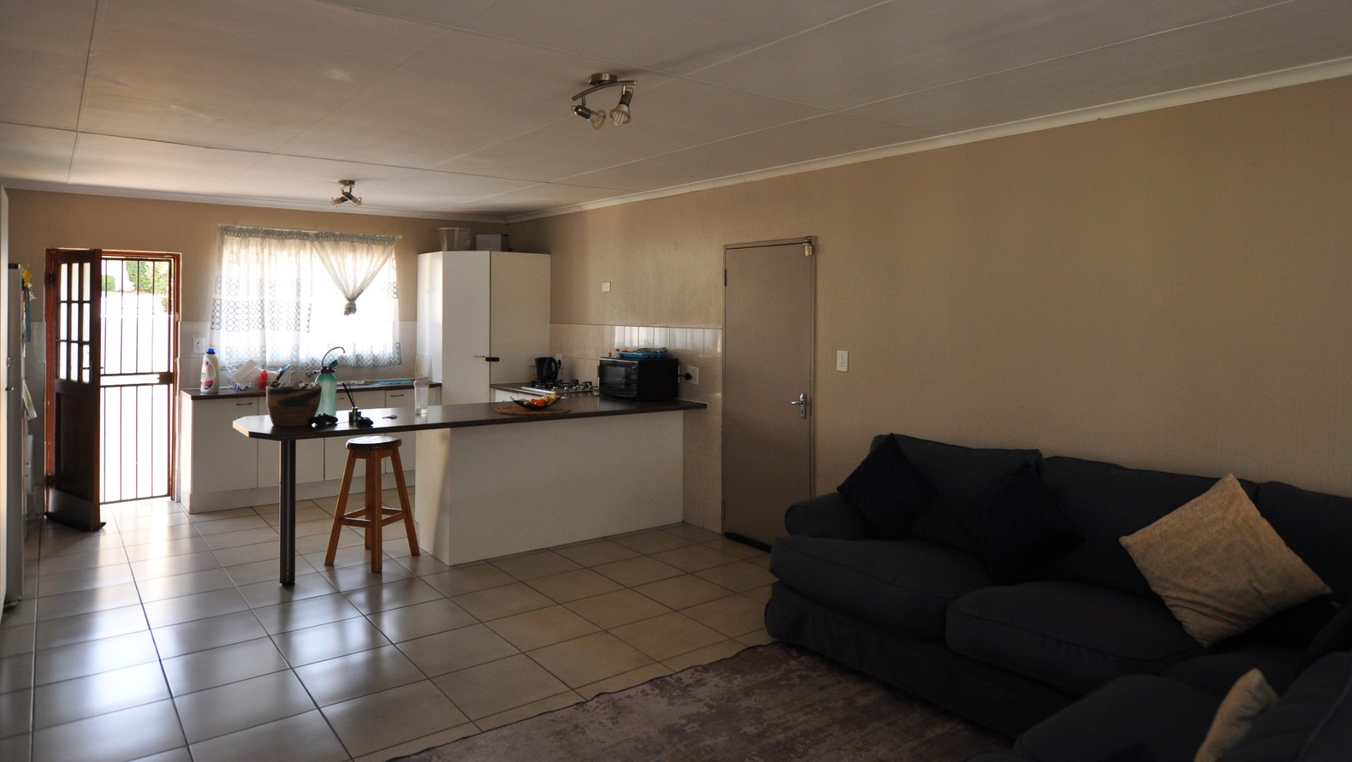 Discover this inviting 3-bedroom, 2-bathroom residential property located in the desirable suburb of Amorosa, Roodepoort. Spanning a comfortable 156 sqm, this home offers a well-designed open-plan layout that seamlessly connects the living, dining, and kitchen areas. The spacious lounge benefits from ample natural light, creating a bright and welcoming atmosphere, complemented by neutral wall tones and durable tiled flooring throughout. The functional L-shaped kitchen is equipped with white base cabinets, dark countertops, a built-in gas hob, and an electric oven, providing a practical space for culinary pursuits. A convenient breakfast bar enhances the open-plan flow, perfect for casual dining or entertaining.