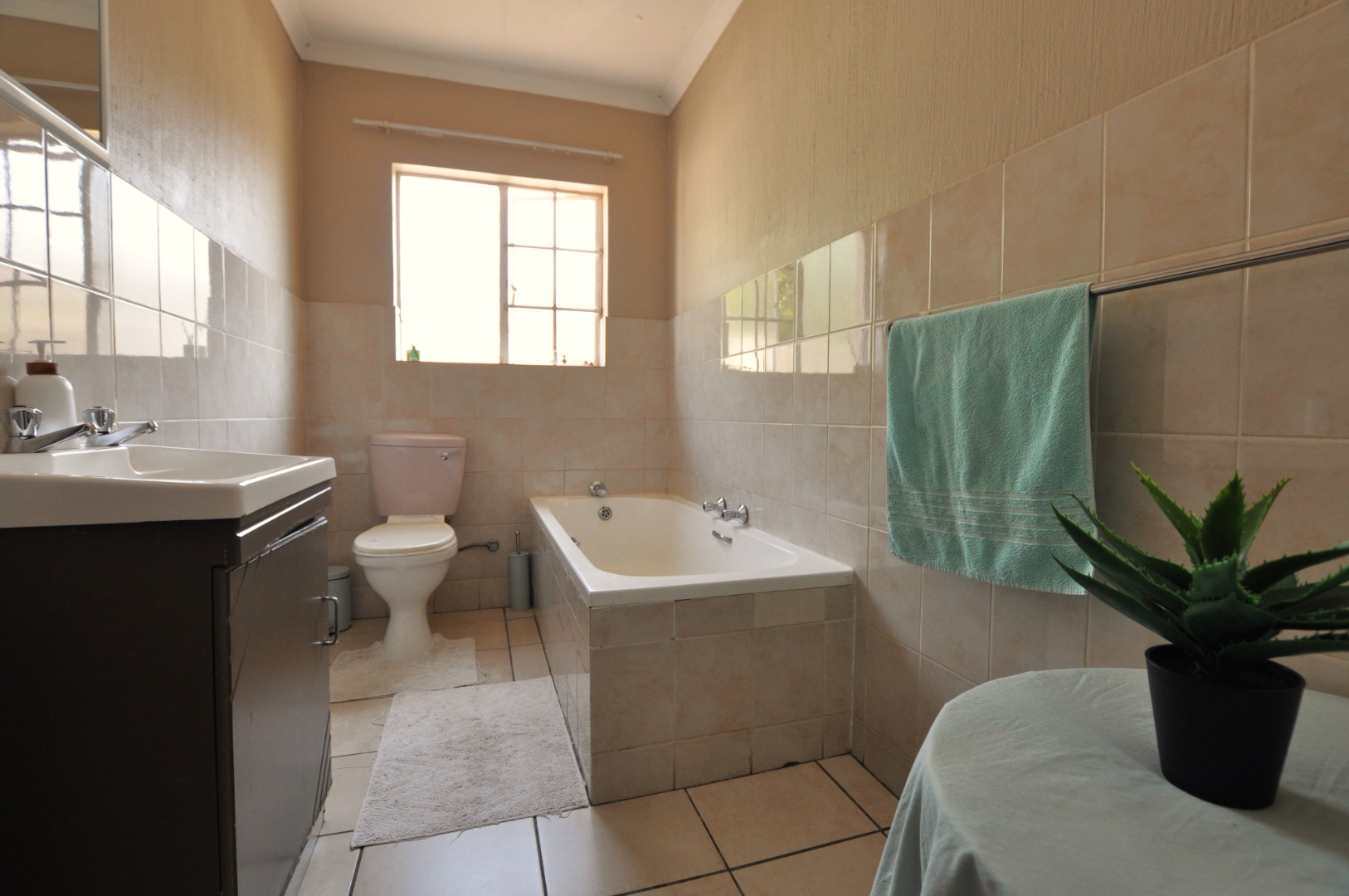 The three generously sized bedrooms offer comfortable retreats, each featuring large windows that invite natural light and ample built-in wardrobes for organised storage. The two bathrooms are thoughtfully designed, presenting a functional layout with consistent tiling, including both a separate shower and a built-in bathtub, catering to diverse preferences. The neutral palette extends to these private spaces, offering a clean canvas for personalisation.