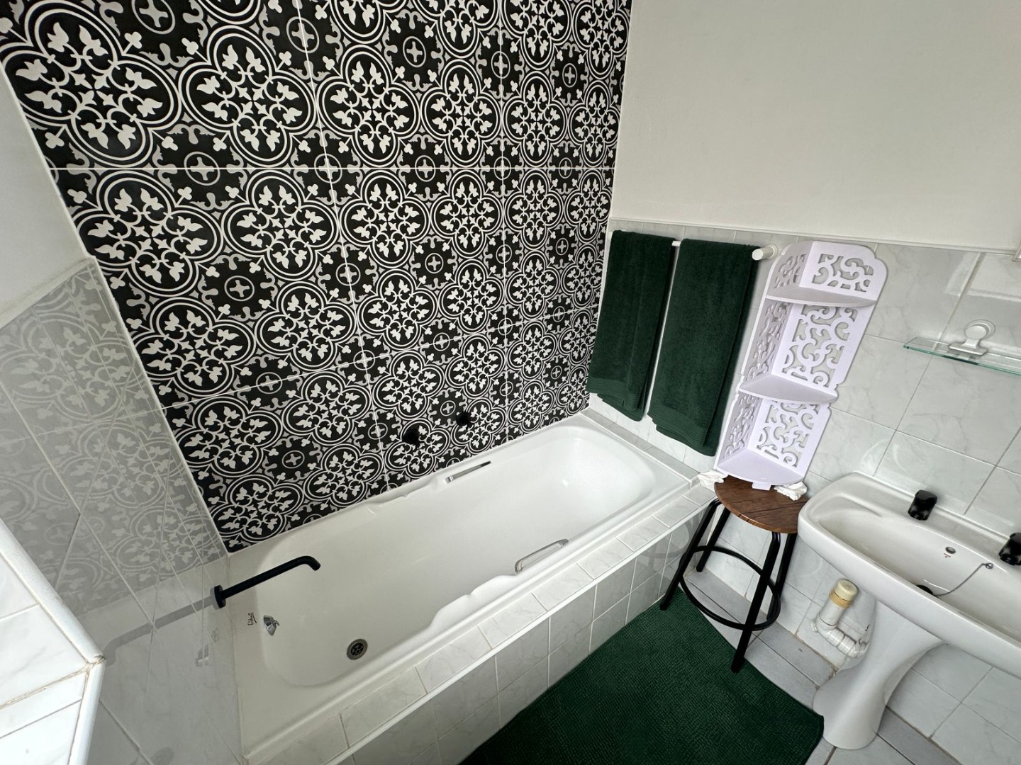 The spacious bedroom offers built-in cupboards and comfortably accommodates a double or queen-size bed. The renovated bathroom is well-appointed, featuring contemporary fittings with both a bath and shower, adding to the apartment’s convenience.