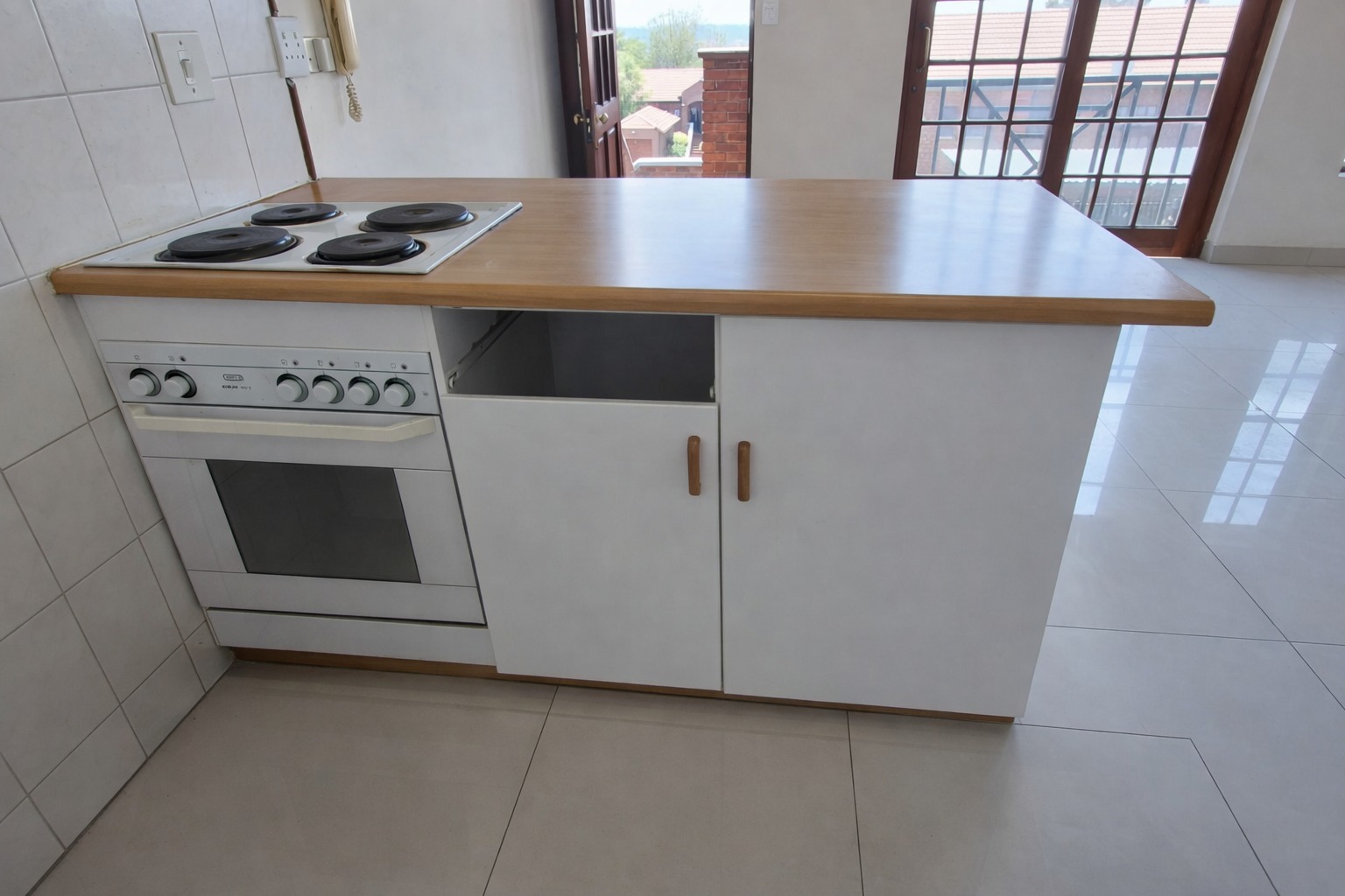 The kitchen is compact and practical, fitted with an oven and stove top, with cupboard space and room for a washing machine. The breakfast counter neatly separates the kitchen from the living area, creating a comfortable open-plan flow. The bedroom is well-sized with built-in cupboards and tiled floors, providing a simple and comfortable retreat. The bathroom is neat and conveniently positioned.