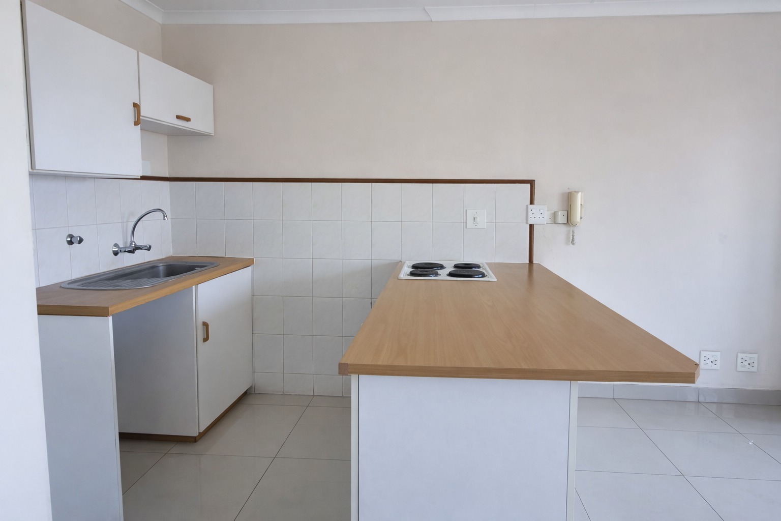 The kitchen is compact and practical, fitted with an oven and stove top, with cupboard space and room for a washing machine. The breakfast counter neatly separates the kitchen from the living area, creating a comfortable open-plan flow. The bedroom is well-sized with built-in cupboards and tiled floors, providing a simple and comfortable retreat. The bathroom is neat and conveniently positioned.