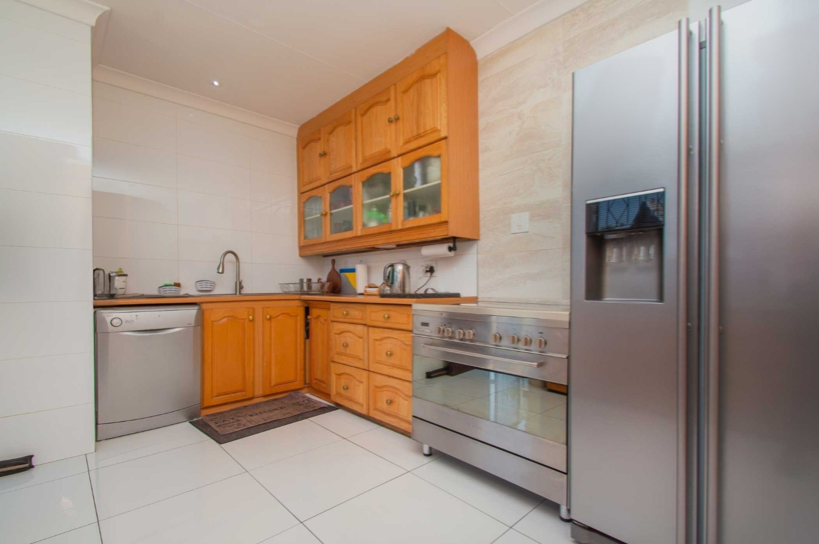 Step inside to discover a thoughtfully designed interior featuring an entrance hall leading to two spacious lounges and a dedicated dining room, providing ample space for relaxation and entertaining. The kitchen, equipped with modern stainless steel appliances, boasts extensive wooden cabinetry and bright tiled floors, offering both functionality and storage. A large window ensures natural light fills the space.