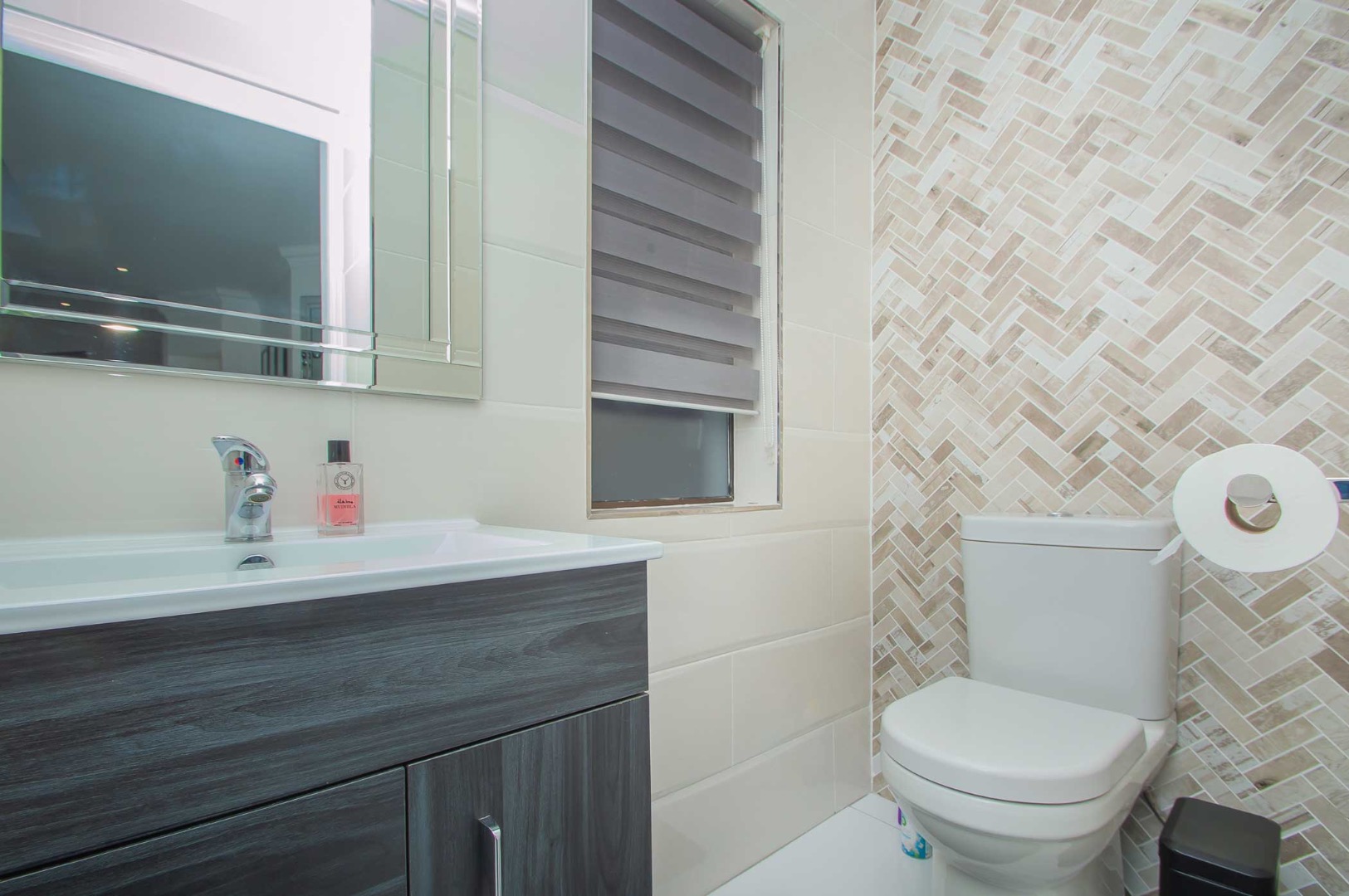 An adjacent guest cloakroom, beautifully finished with porcelain and mosaic tiling, is conveniently positioned for visitors.