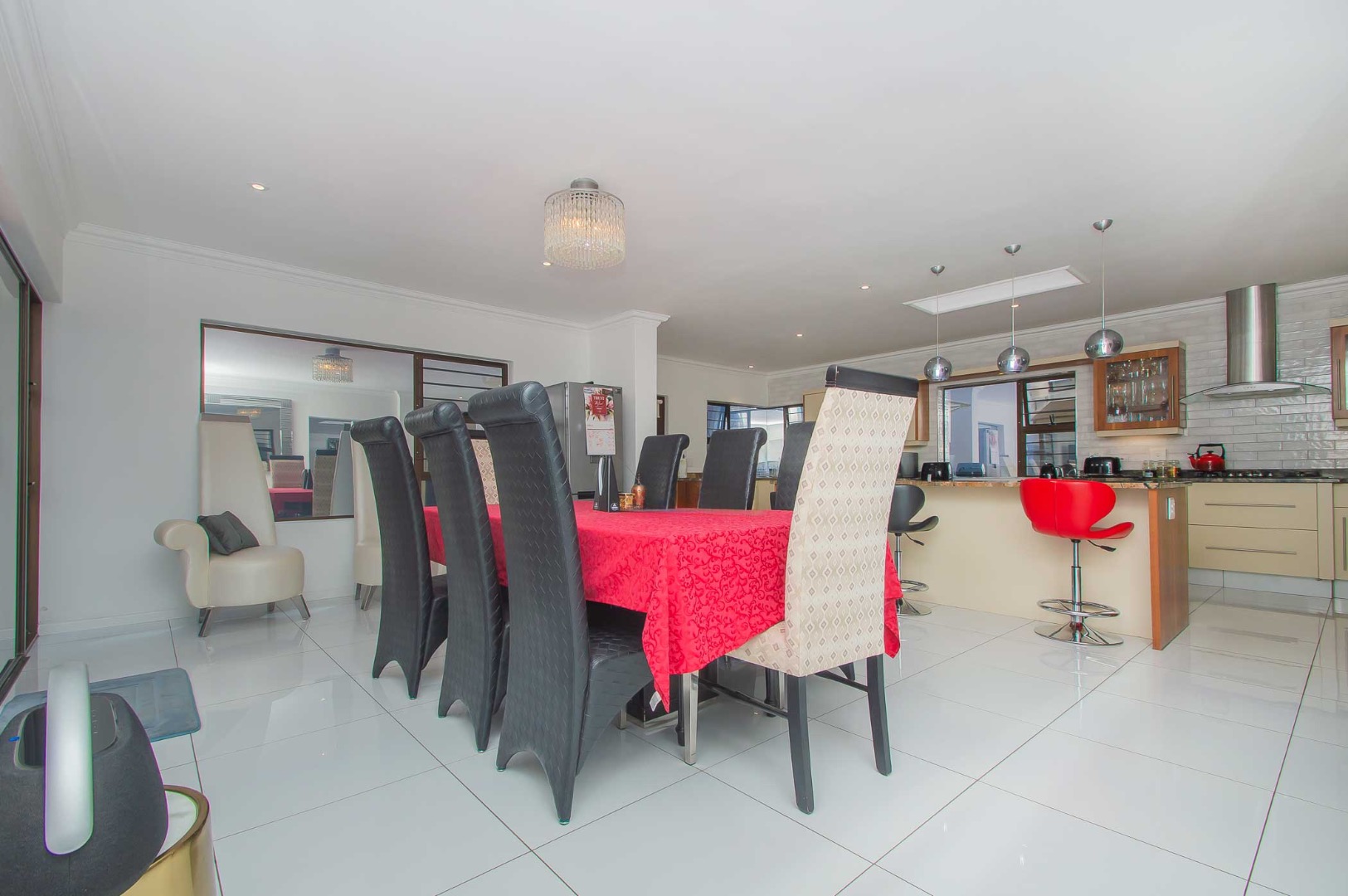 The open-plan dining area, adorned with porcelain tiling and a statement chandelier, seamlessly connects to the gourmet kitchen where both form and function take center stage. Granite countertops, a center island with prep basin and waterfall edging, pendant lighting, a gas hob with chimney extractor, eye-level dual oven, and space for a double fridge/freezer ensure a premium cooking experience.