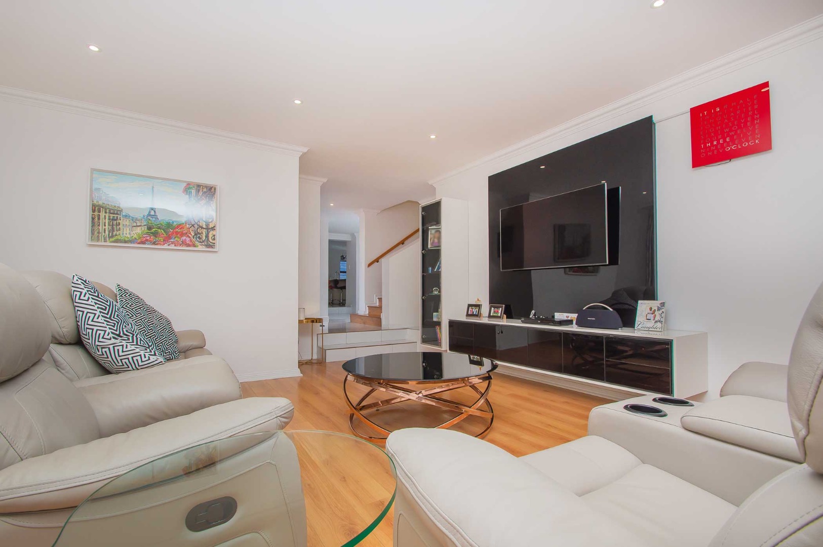 The refined aesthetic flows into the spacious living room, featuring laminated flooring, contemporary finishes, and a sleek glass TV feature wall. Aluminum glass sliding doors create seamless access to the enclosed entertainment area enhancing the home’s effortless indoor-outdoor flow.