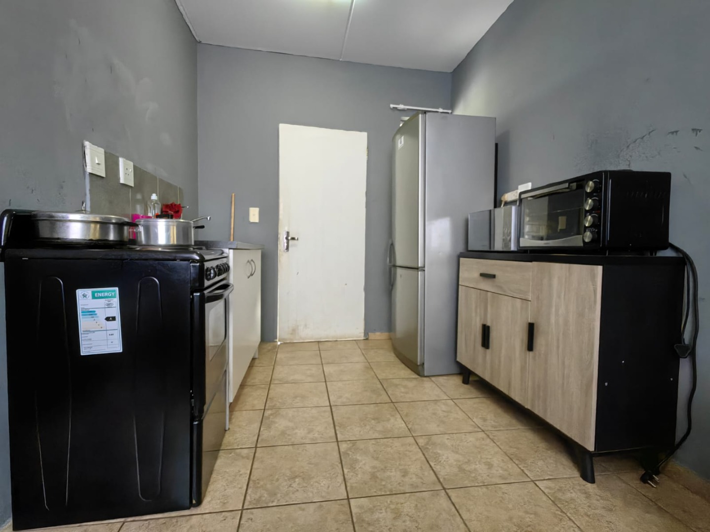 door into the kitchen. The parallel style kitchen leads to the living room, which is large enough for a small family.