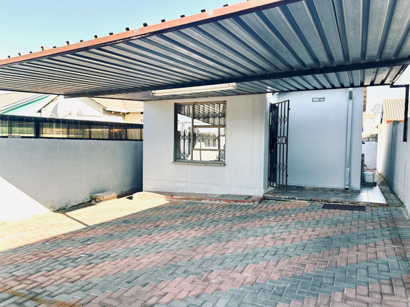 Welcoming you in at the black steel gate with a double car port, the property is neat and paved.