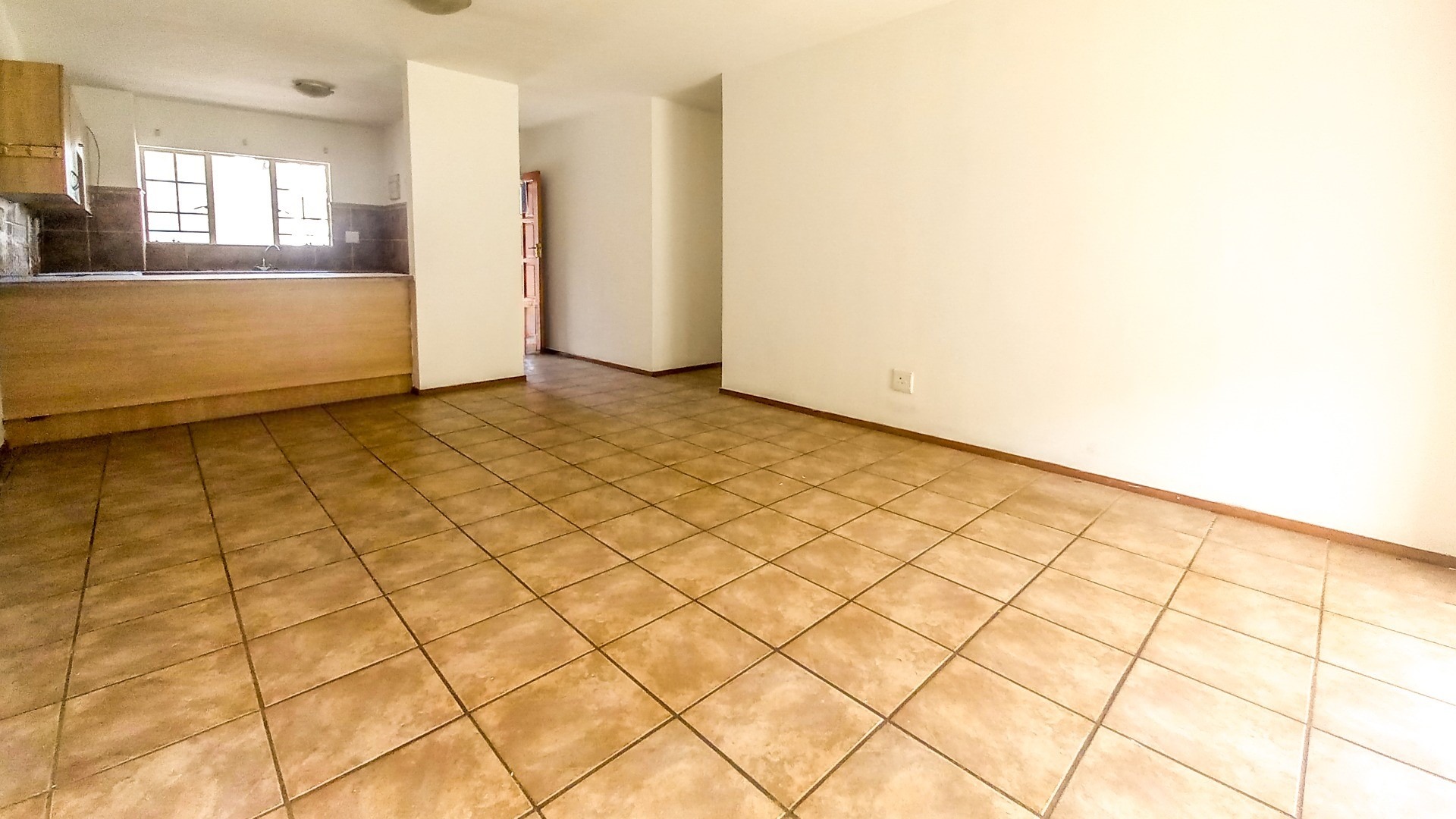 Inside, the open-plan living area boasts tiled floors, seamlessly connecting the lounge and dining space to a well-equipped kitchen. The kitchen features an under-counter oven, hob, extractor fan, breakfast bar, and provisions for a washing machine, dishwasher, and fridge.