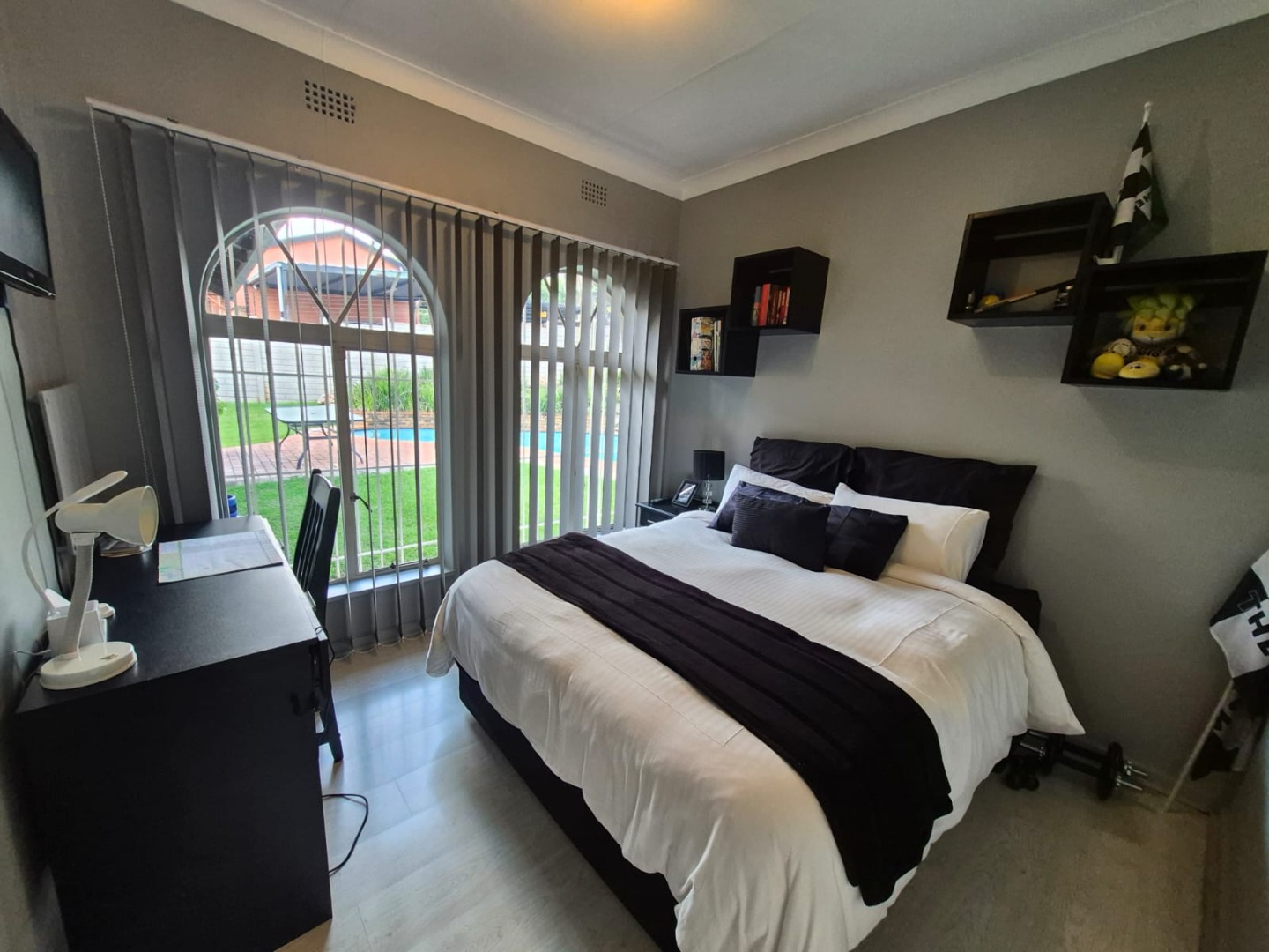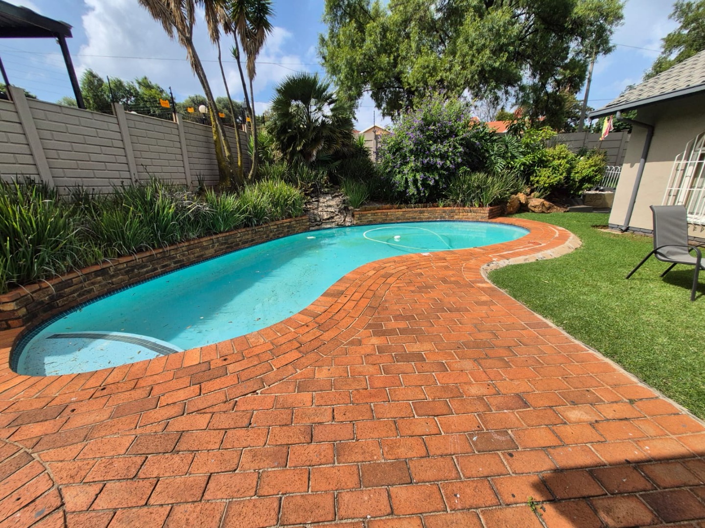Discover this inviting 4-bedroom, 3-bathroom family home situated on a generous 991 sqm erf in the established suburban area of Florida Glen, Roodepoort, South Africa. Boasting a comfortable floor size of 262 sqm, this single-story residence presents a welcoming kerb appeal with its well-maintained front lawn, paved driveway, and ample covered parking, ensuring convenience for residents and guests alike. Step inside to an entrance hall that leads into thoughtfully designed living spaces. The interior features a spacious lounge, a dedicated dining room, and a family TV room, all complemented by architectural details such as arched doorways and hardwood flooring. The main living area is further enhanced by a vaulted wood-paneled ceiling, adding character and warmth. A custom-built wooden bar with integrated shelving provides an ideal setting for entertaining. The functional kitchen is equipped with light wood-toned cabinetry, dark countertops, a built-in oven, and white tiled floors and walls, offering a practical space for culinary endeavours. The home provides four comfortable bedrooms and three bathrooms, including a guest toilet, catering to the needs of a growing family. Outdoor living is a highlight, featuring a clean swimming pool surrounded by a lush, well-maintained garden with mature landscaping and an irrigation system. A winding brick pathway leads to an outdoor seating area, perfect for relaxation. The property also includes a single garage, five additional parking spaces, domestic rooms, and water tanks for added utility. Security is prioritised with electric fencing along the boundary wall and window bars, providing peace of mind. The home is also fibre-ready, ensuring modern connectivity. Florida Glen is a well-regarded suburban neighbourhood in Roodepoort, known for its family-friendly environment and convenient access to local amenities. Key Features: * 4 Bedrooms, 3 Bathrooms * Spacious Lounge, Dining Room & Family TV Room * Custom-Built Wooden Bar * Private Swimming Pool & Lush Garden * Single Garage & 5 Parking Spaces * Electric Fencing & Security Features * Fibre-Ready Connectivity * Domestic Rooms & Water Tanks * 991 sqm Erf, 262 sqm Floor Size * Paved Driveway & Irrigation System