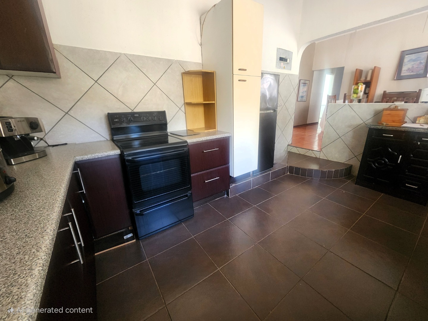 Enter through a fully tiled entrance passage secured with a safety gate. The lounge is warm and inviting, featuring tiled floors and a built-in fireplace—ideal for relaxing evenings or entertaining guests. A large dining area comfortably seats 8 to 12 people, making it perfect for family meals and gatherings.