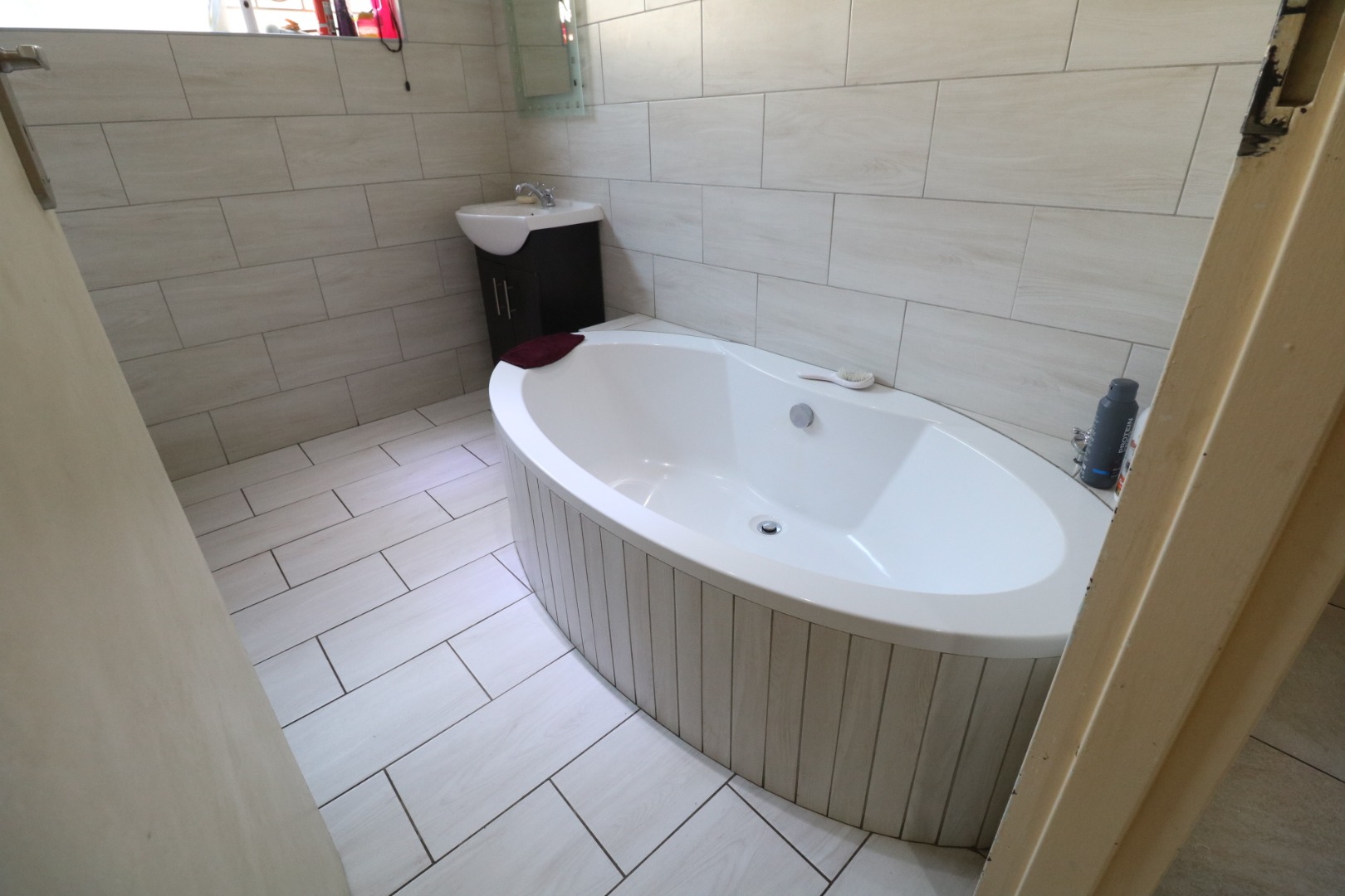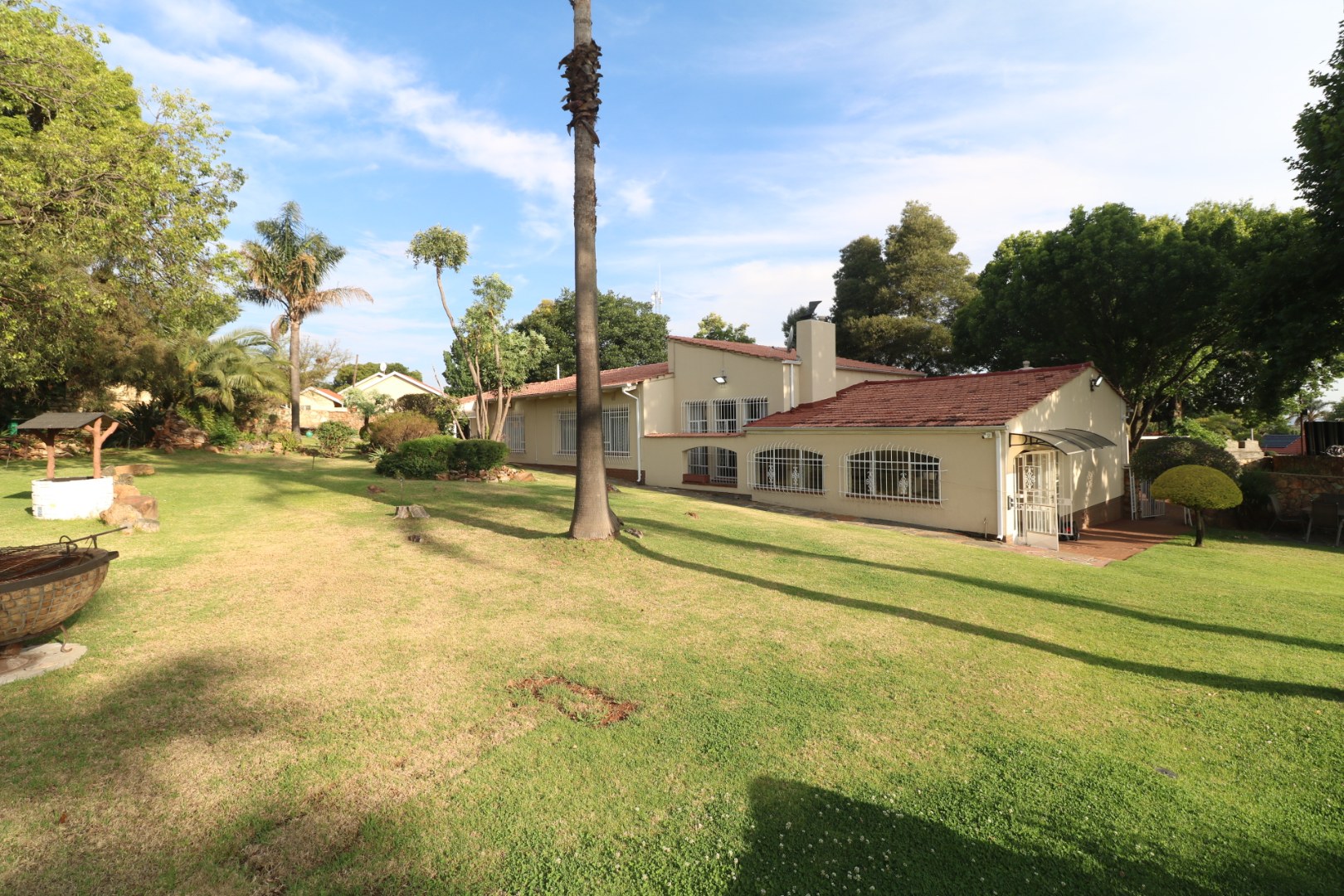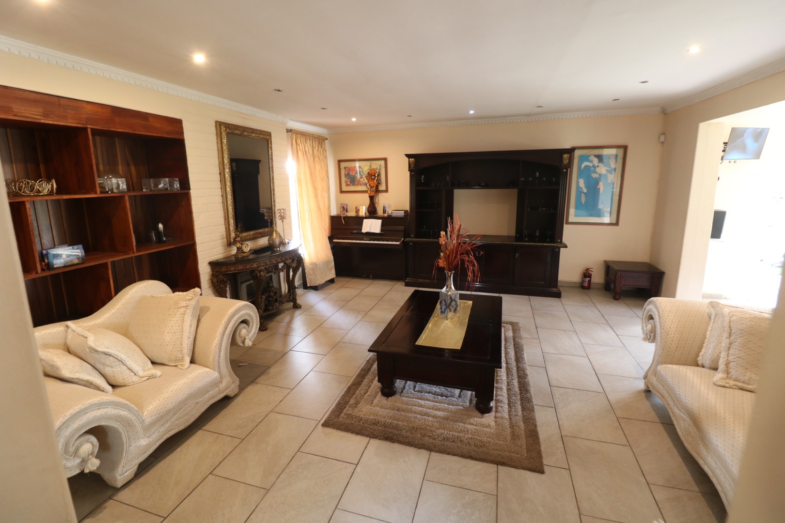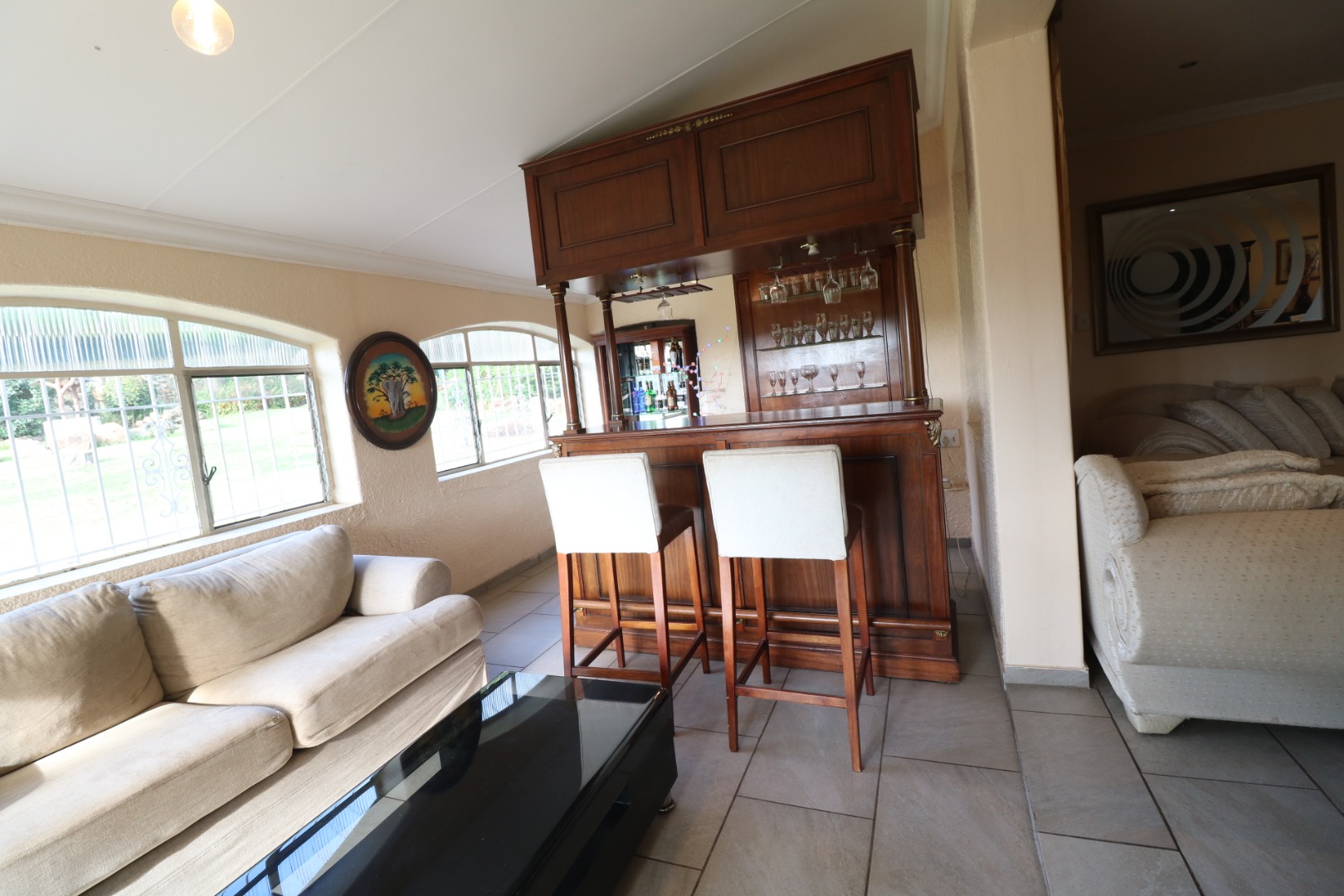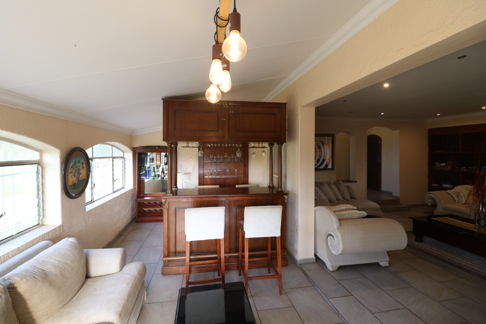 The spacious lounge flows seamlessly into a separate built-in bar area, perfect for entertaining guests or clients while overlooking the lush garden. The expansive outdoor area includes a sparkling swimming pool, lapa with built-in braai, and ample lawn space – ideal for hosting or relaxation.