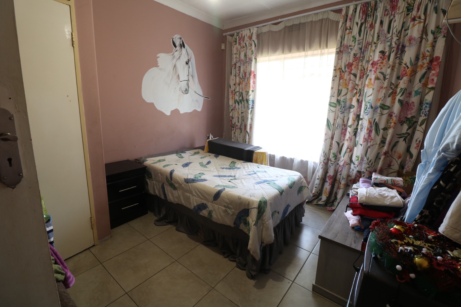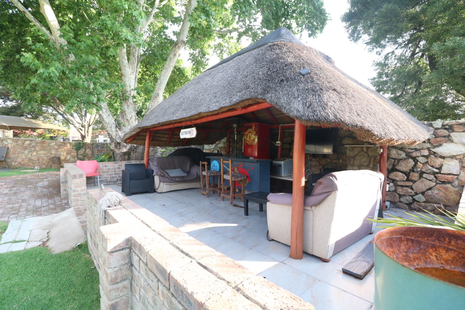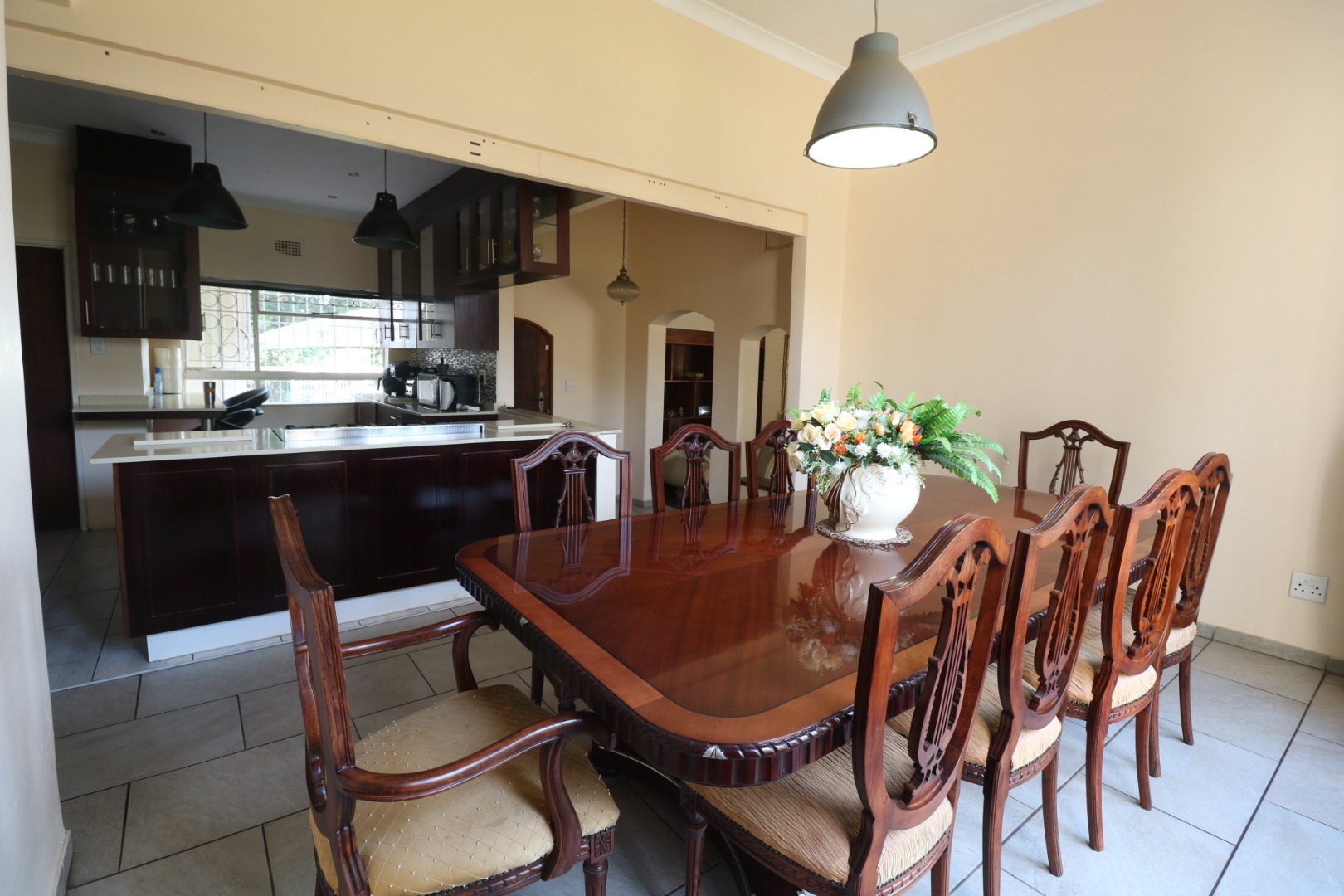 The spacious lounge flows seamlessly into a separate built-in bar area, perfect for entertaining guests or clients while overlooking the lush garden. The expansive outdoor area includes a sparkling swimming pool, lapa with built-in braai, and ample lawn space – ideal for hosting or relaxation.