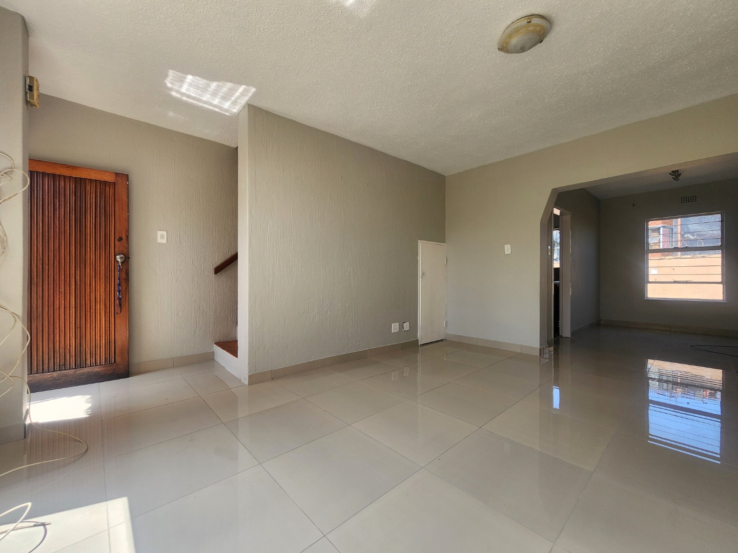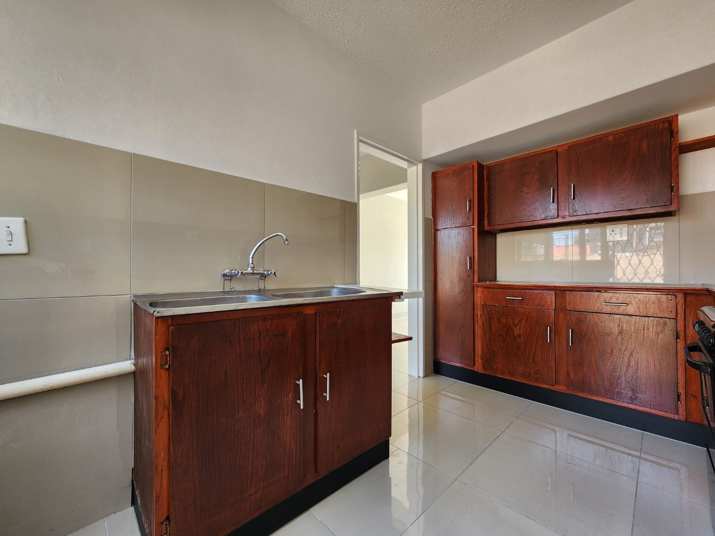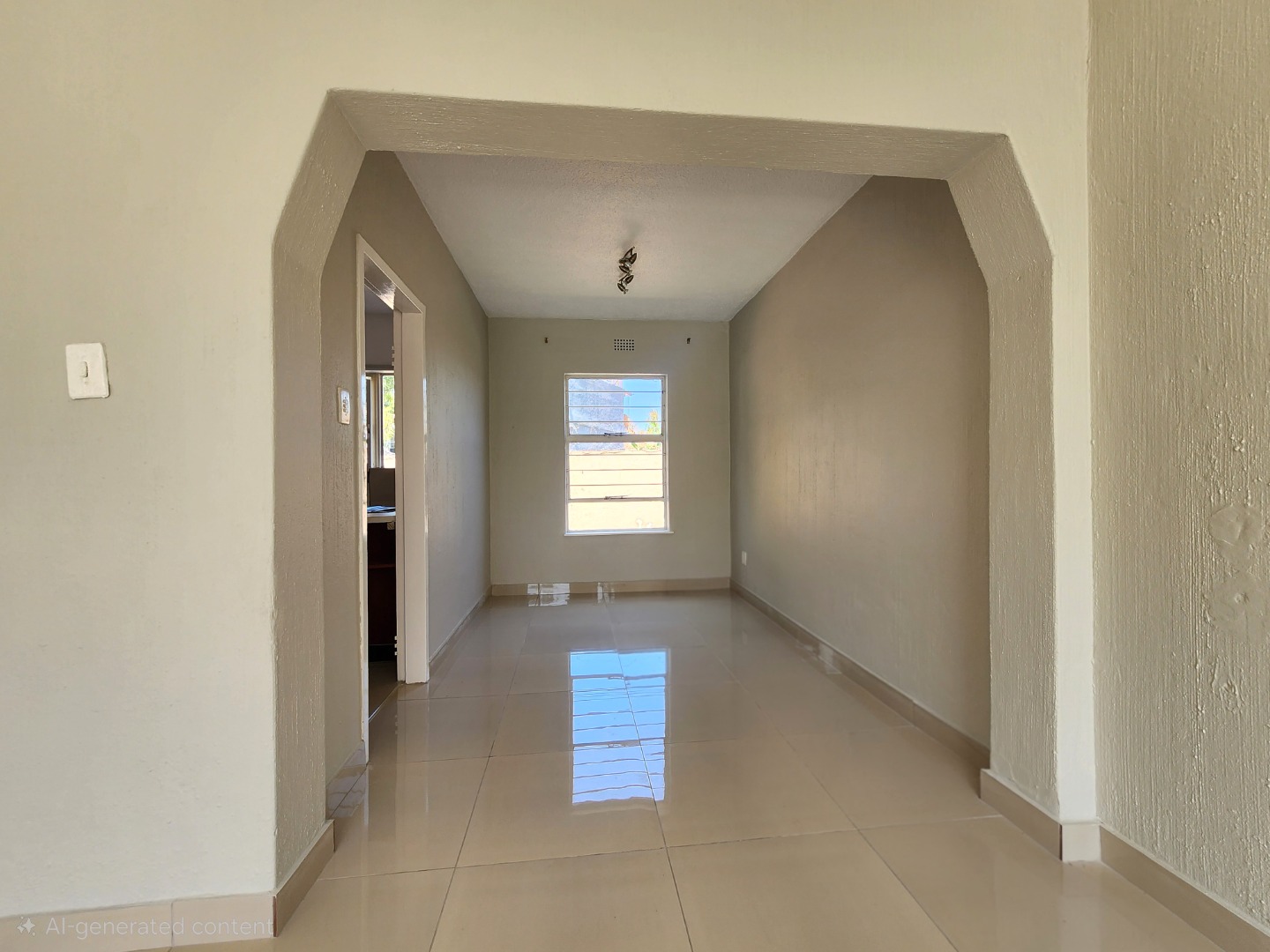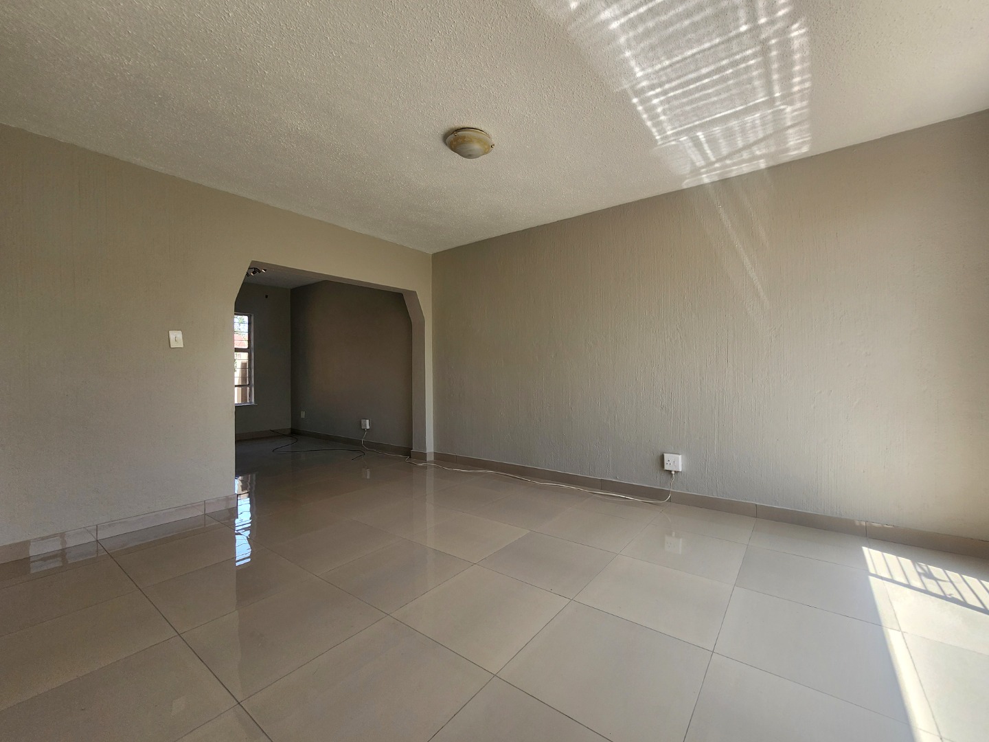 Step inside to a bright and airy interior, boasting glossy tiled floors and neutral-toned walls throughout, providing a clean canvas for your personal touch. The open-plan design seamlessly connects the lounge and dining room, enhanced by abundant natural light streaming through large windows. Arched doorways add a touch of character, guiding you through the spacious layout. The functional kitchen is equipped with a double stainless steel sink, ample cabinet storage, and a separate stove, catering to your culinary needs.