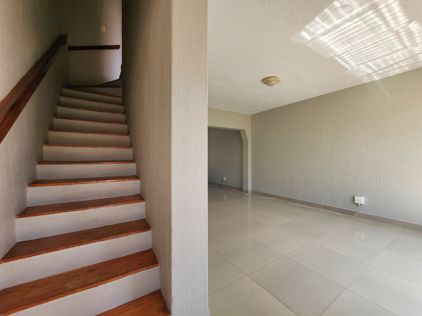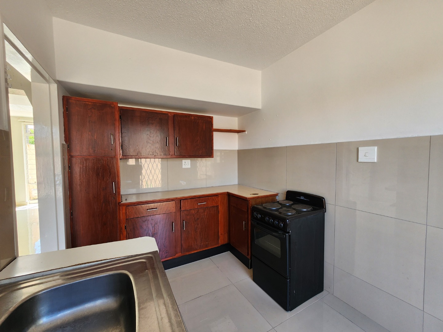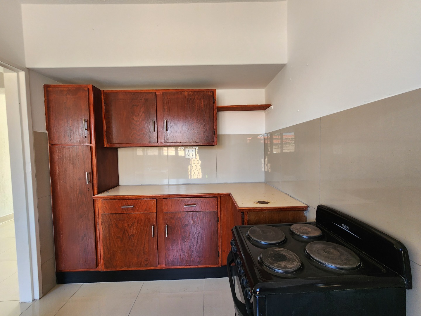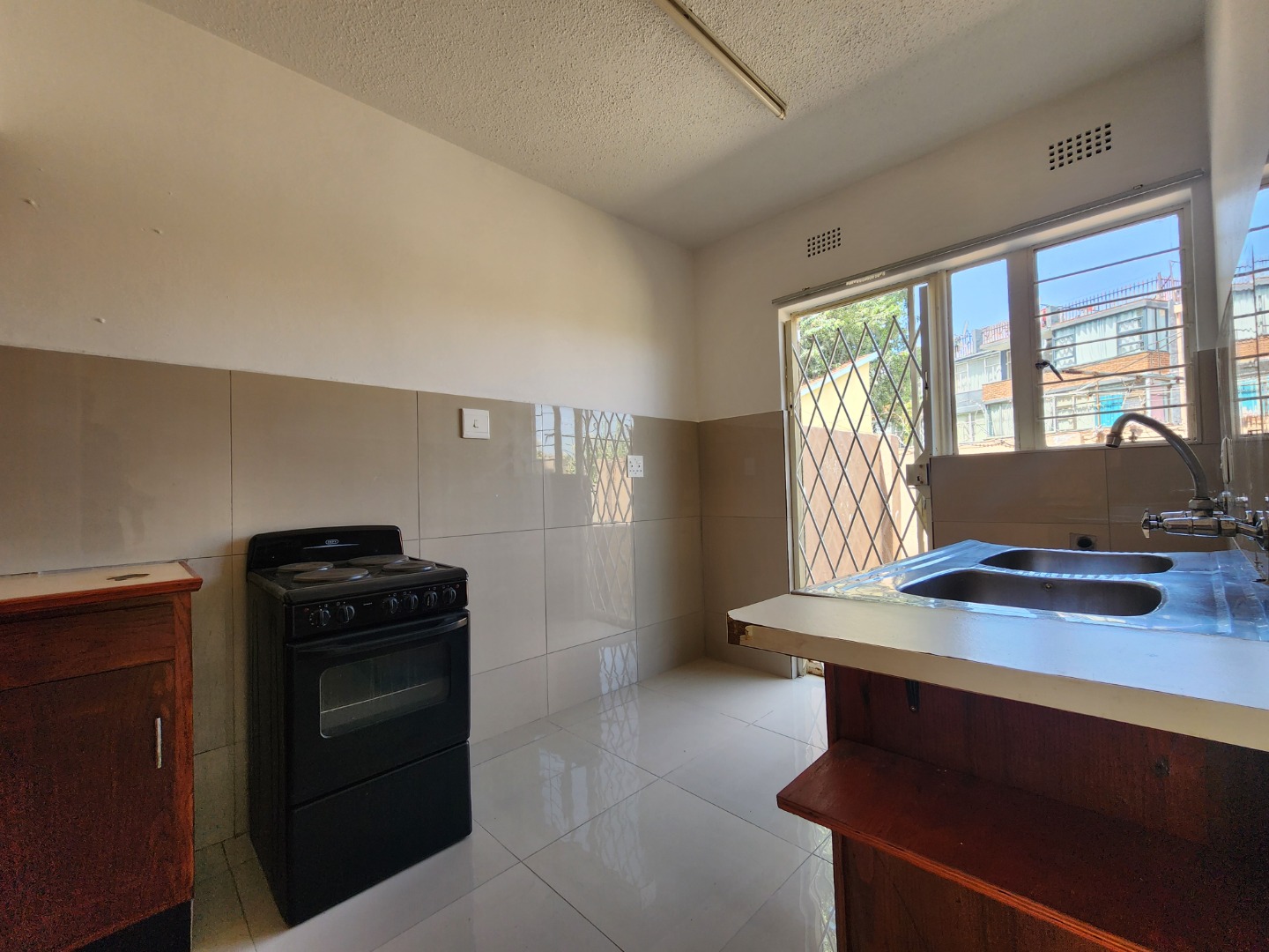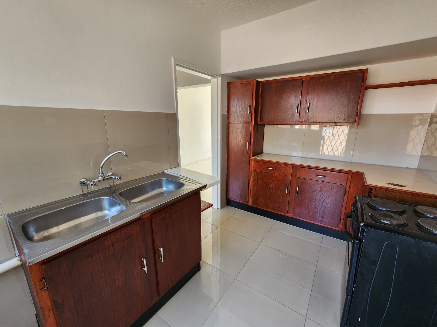 Step inside to a bright and airy interior, boasting glossy tiled floors and neutral-toned walls throughout, providing a clean canvas for your personal touch. The open-plan design seamlessly connects the lounge and dining room, enhanced by abundant natural light streaming through large windows. Arched doorways add a touch of character, guiding you through the spacious layout. The functional kitchen is equipped with a double stainless steel sink, ample cabinet storage, and a separate stove, catering to your culinary needs.