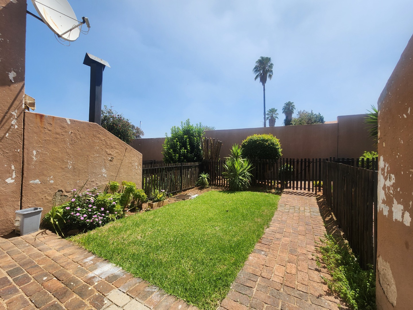 The exterior presents a welcoming facade with lush, well-maintained garden spaces and paved pathways leading to the entrance, complemented by visible security gates for peace of mind. Enjoy a private, enclosed outdoor area featuring a compact lawn and established garden beds, perfect for relaxation or entertaining.