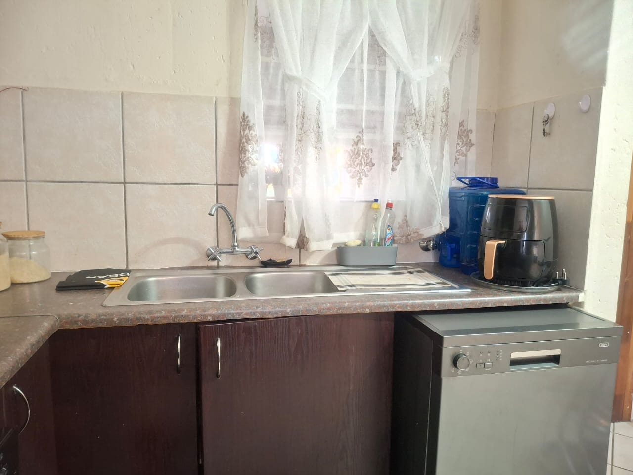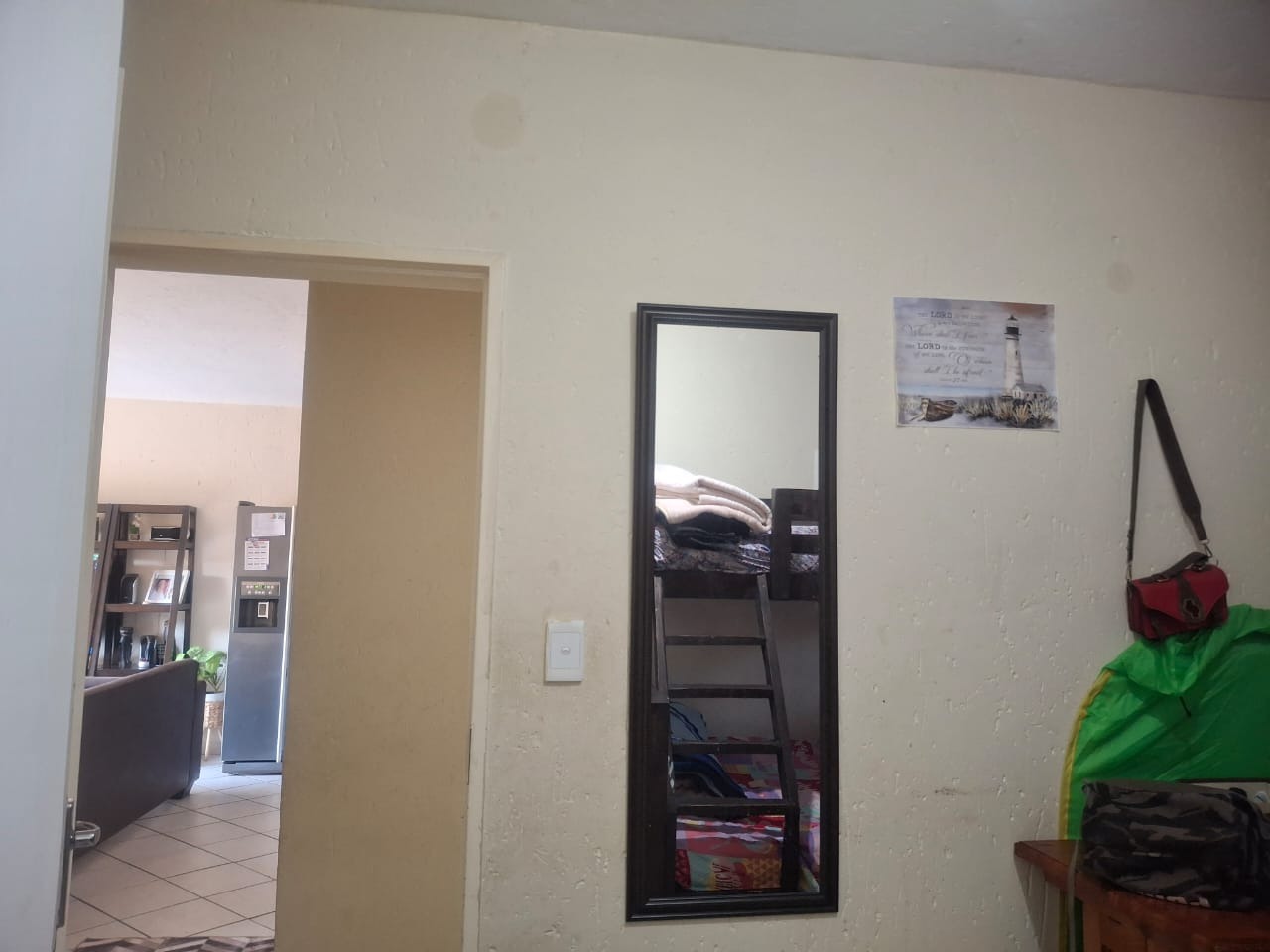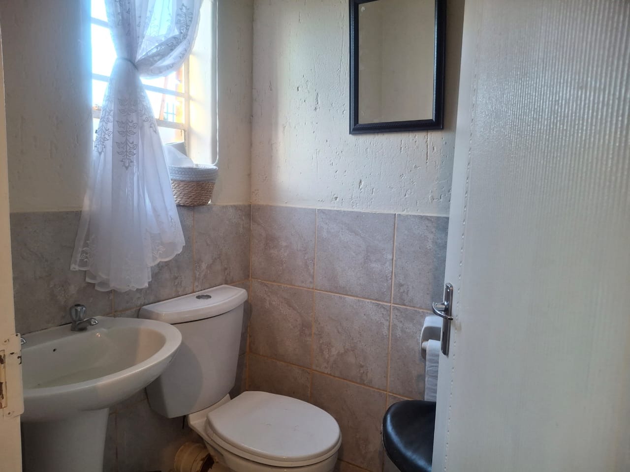 The kitchen is fully fitted and functional, complete with ample cupboard space and a washing machine connection, making daily living both easy and efficient. Enjoy the tranquil ambience of the lounge area which opens up through the sliding door to beautiful views of a lush green garden. This private ground floor feature offers a special outdoor retreat just steps from your living space.