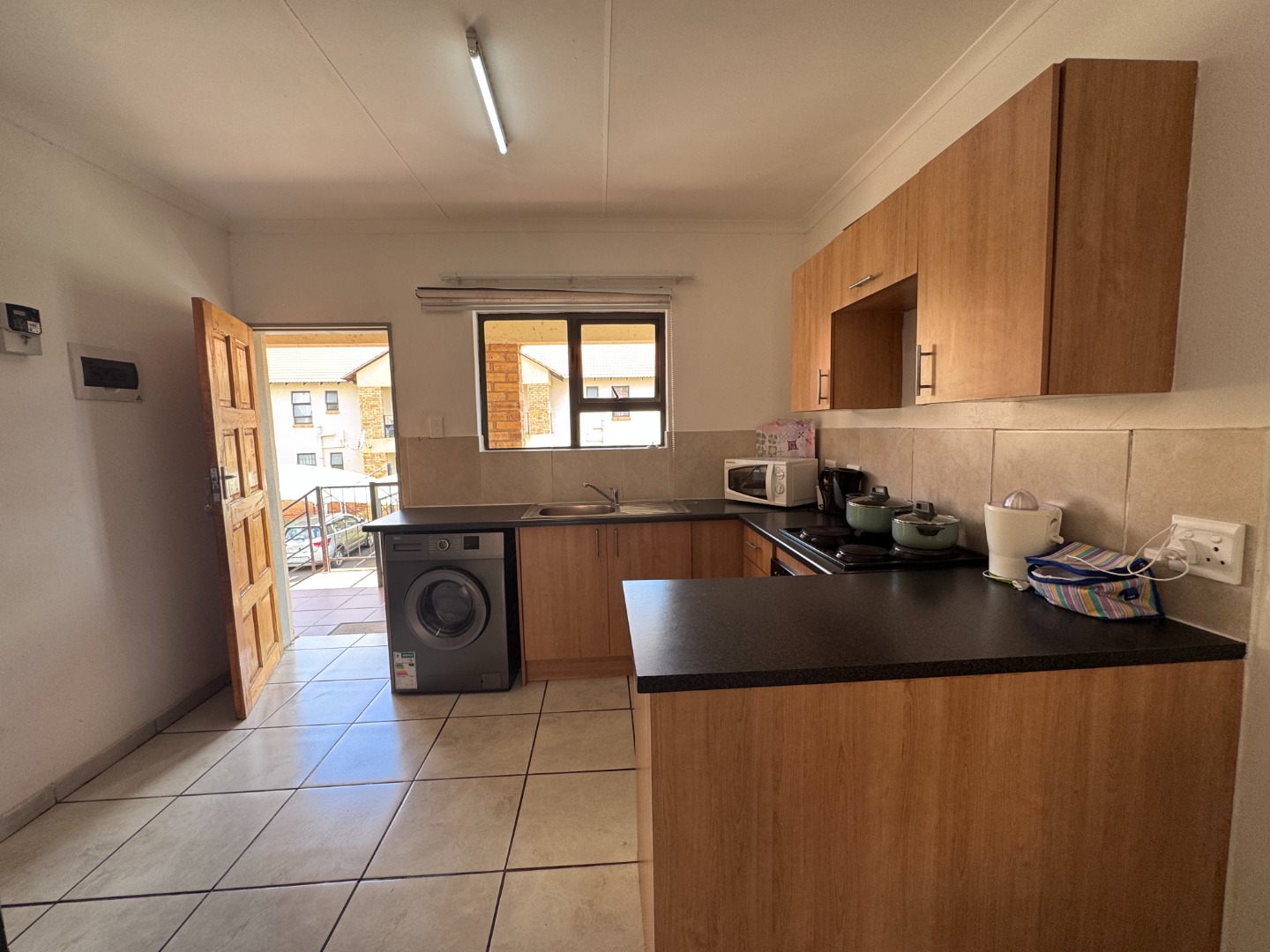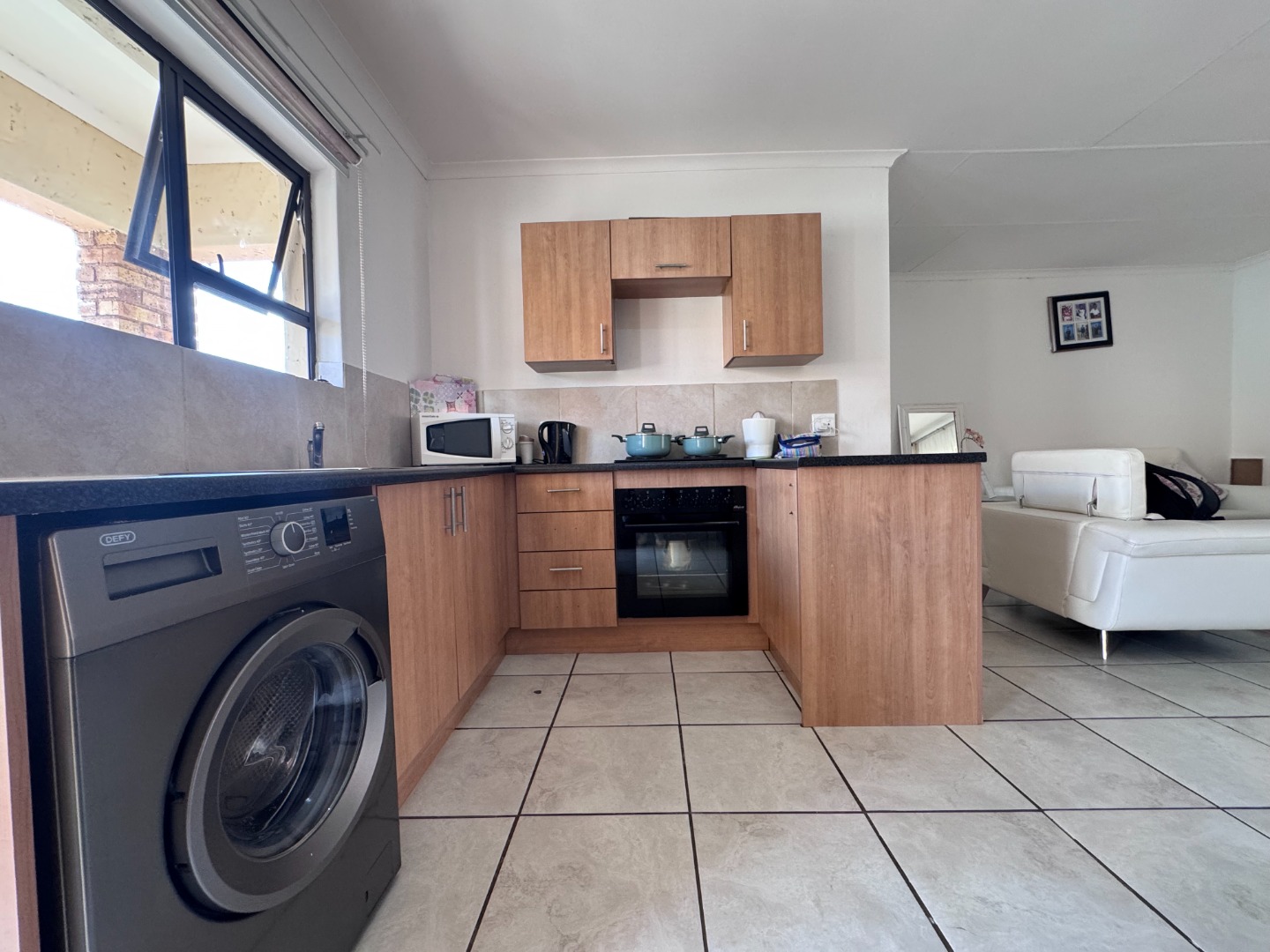 The contemporary kitchen seamlessly integrates with the living space, featuring light wood cabinetry, dark countertops, and tiled floors. It comes equipped with an integrated oven and a washing machine, providing both functionality and style for everyday living.