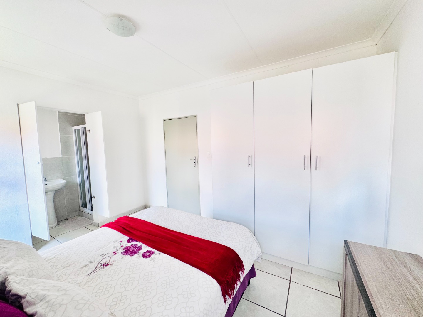 Accommodation includes three well-proportioned bedrooms, all featuring white walls and practical tiled flooring. The main bedroom boasts a convenient en-suite bathroom, while built-in wardrobes in the bedrooms offer ample storage solutions. The property includes a total of two bathrooms, ensuring comfort and privacy for residents.