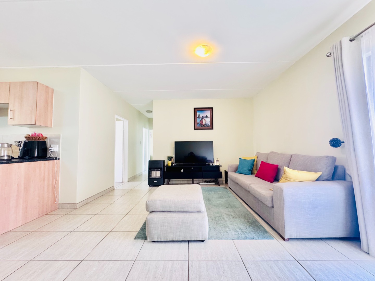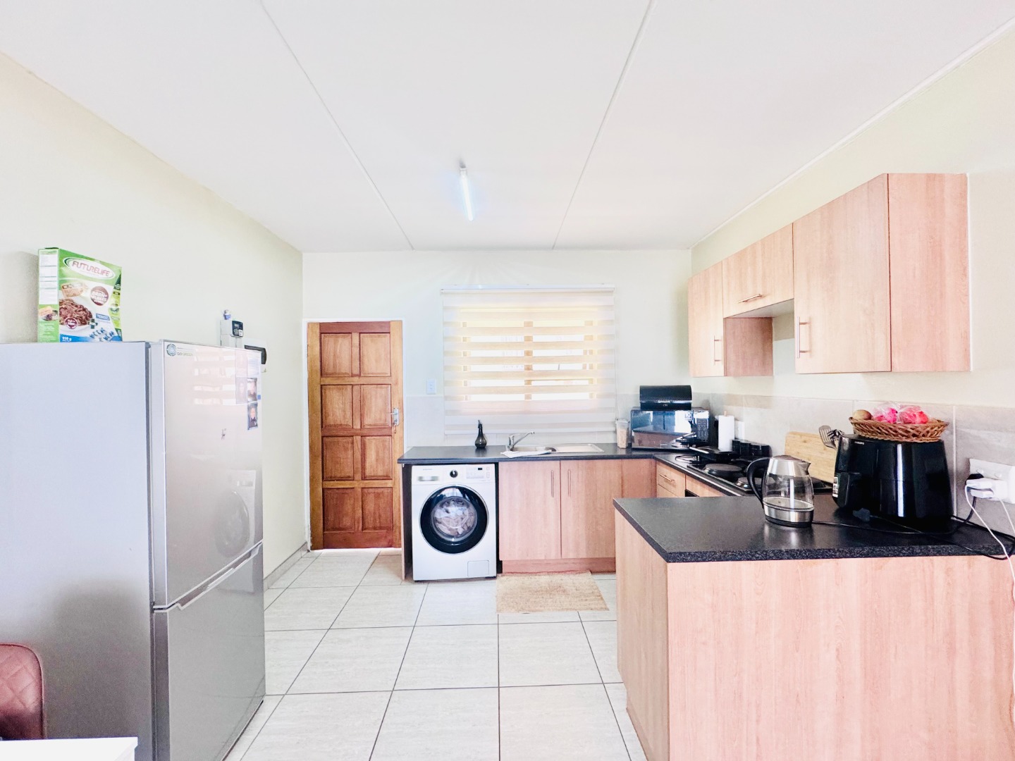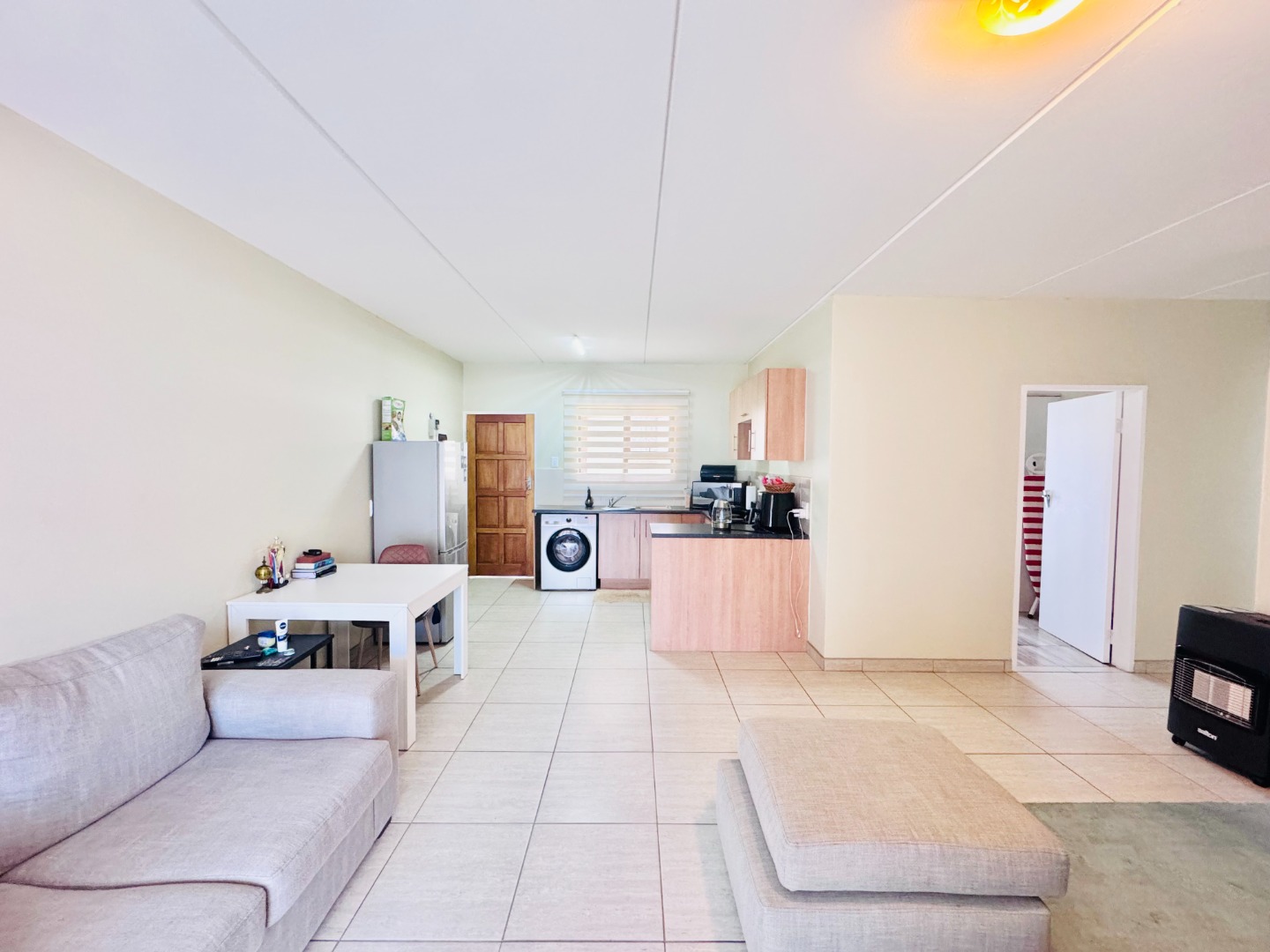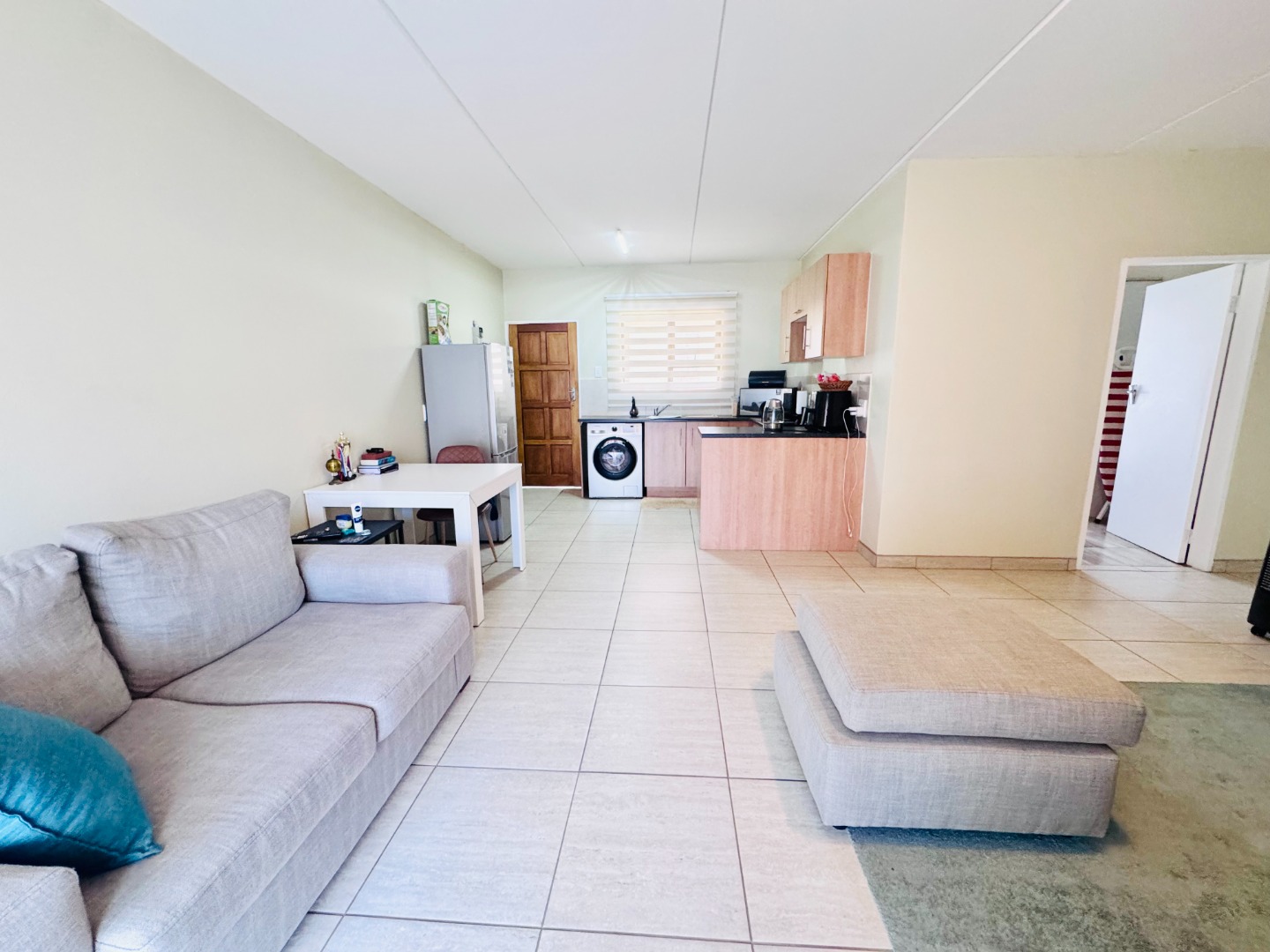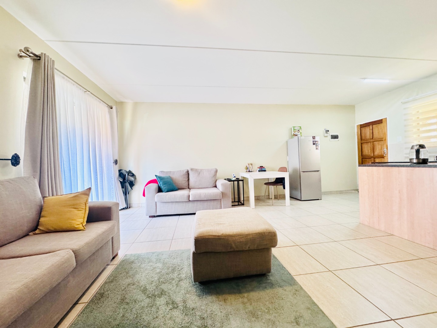 Discover this inviting 79 sqm residence located in a well-maintained complex in Groblerpark, Roodepoort. This modern home features an open-plan layout designed for comfortable living. The spacious lounge area, illuminated by ample natural light from large sliding doors, seamlessly connects to a dedicated dining space and a contemporary kitchen. The kitchen boasts light wood cabinetry, dark countertops, and includes space for essential appliances, all set against durable tiled flooring.