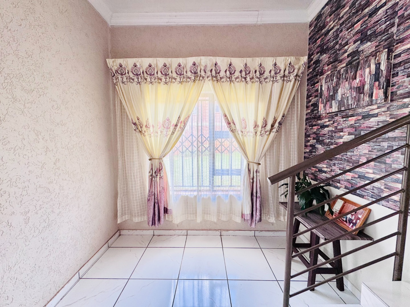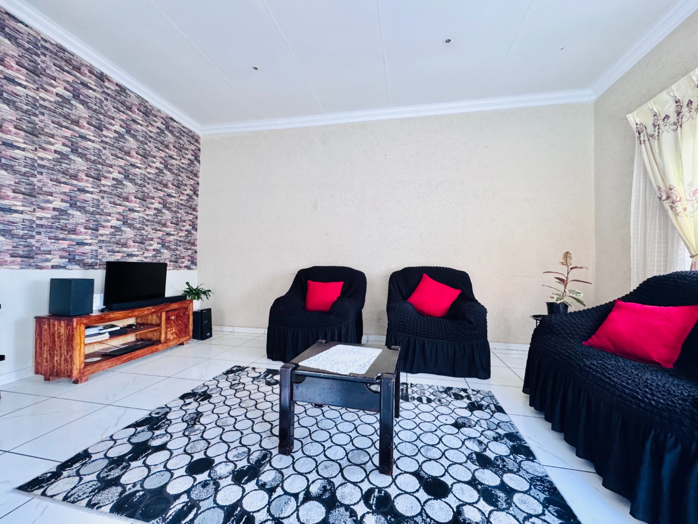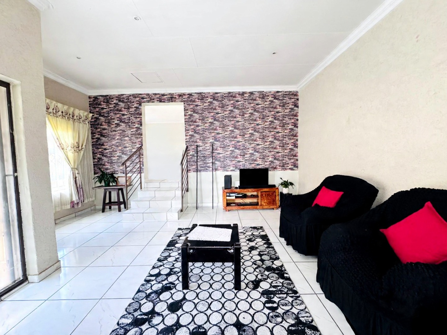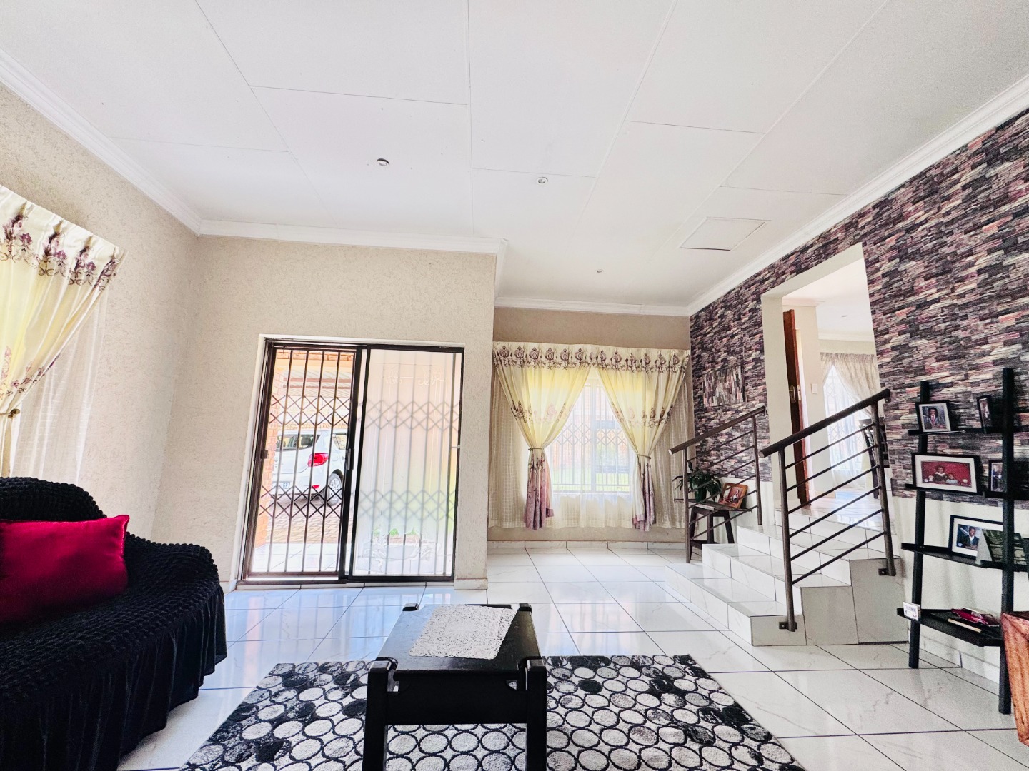 Step inside to a bright and spacious interior spanning 157 sqm. The layout features a comfortable lounge, a dedicated dining room, and a functional kitchen. Modern tiled flooring flows throughout, creating a clean and cohesive aesthetic. The living areas are further enhanced by accent walls with stylish brick-like and stone patterns, adding character. Natural light floods the space through large windows and sliding doors, which are also fitted with security gates.