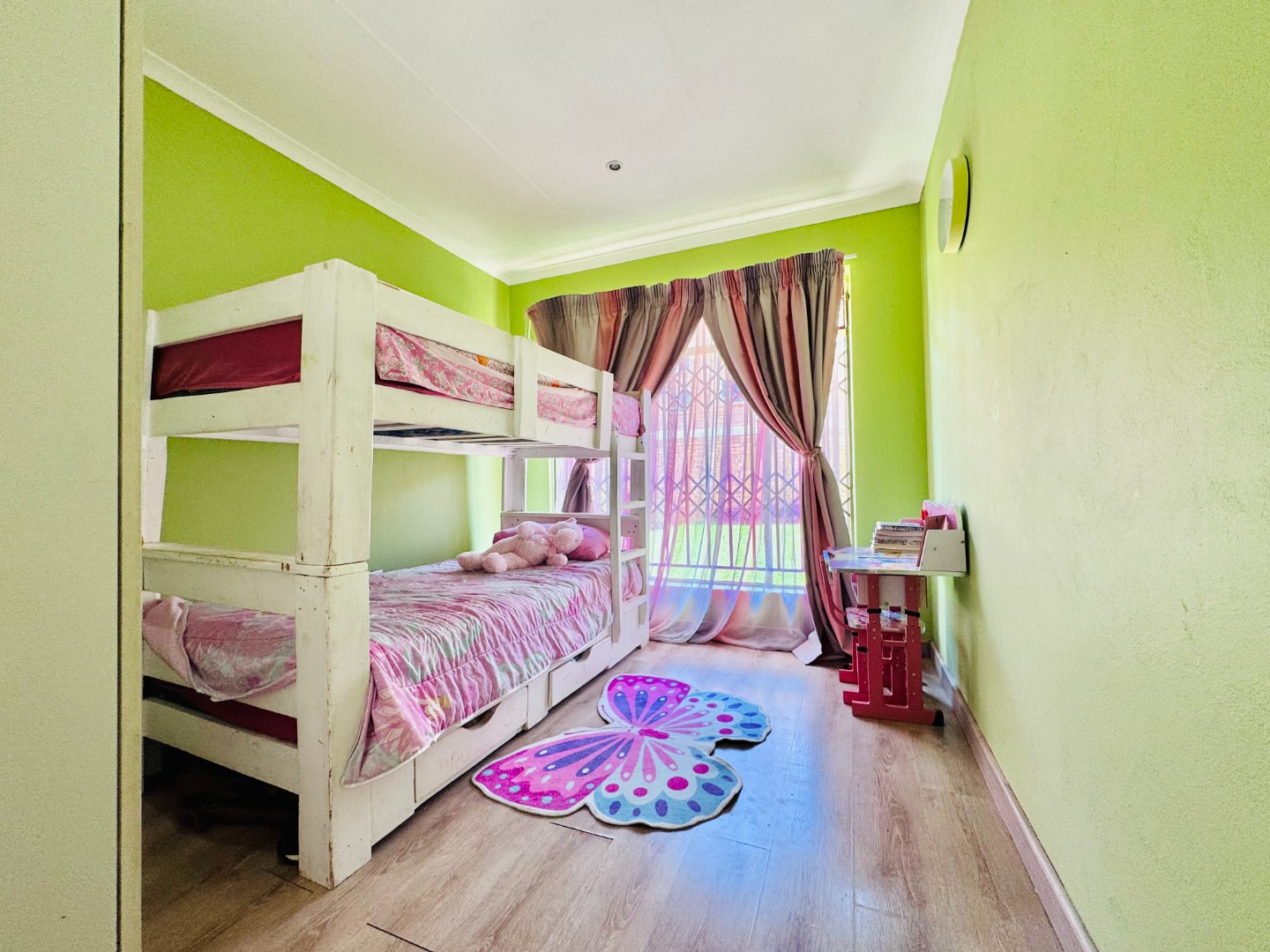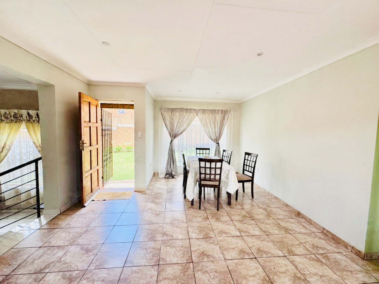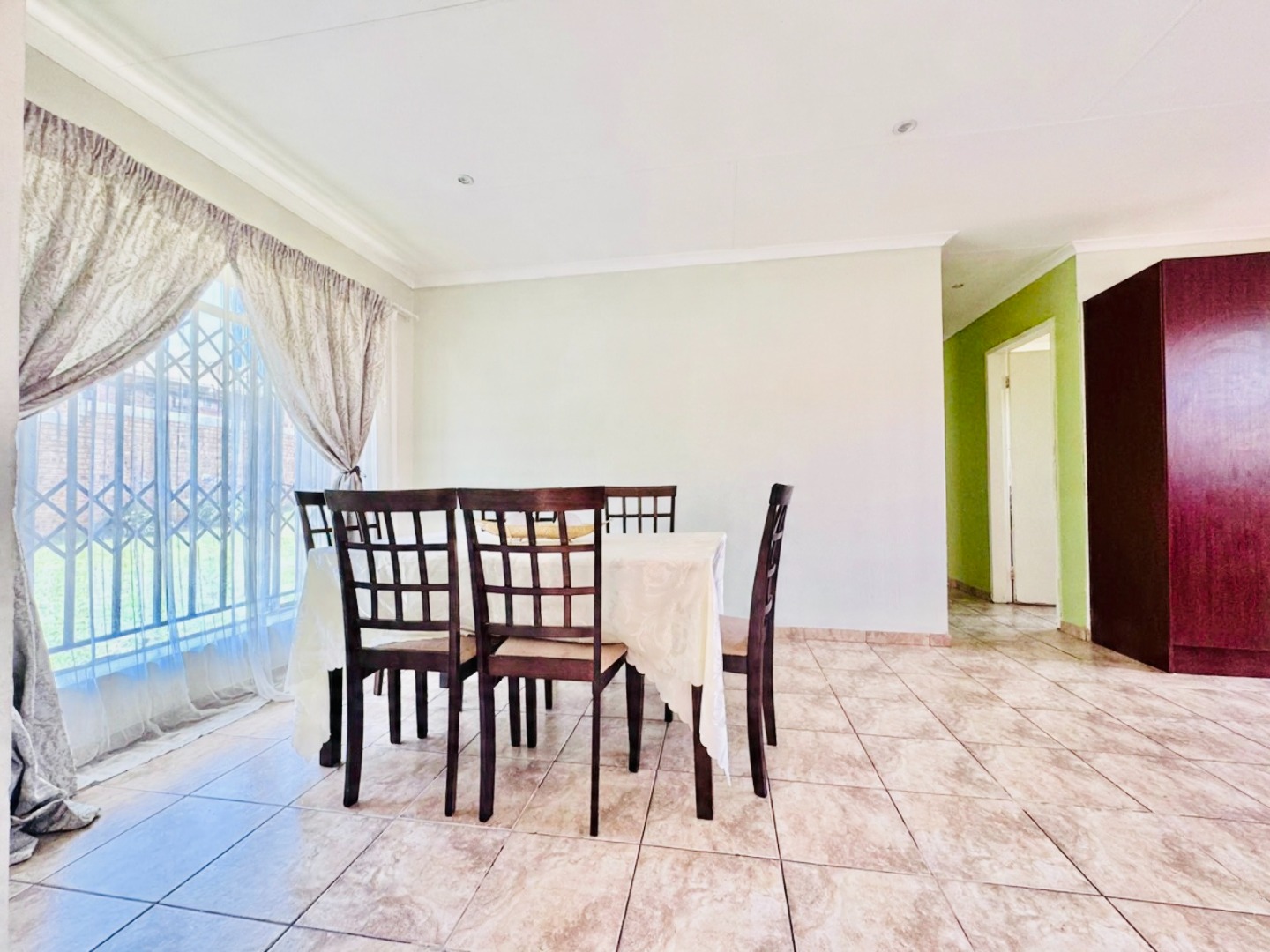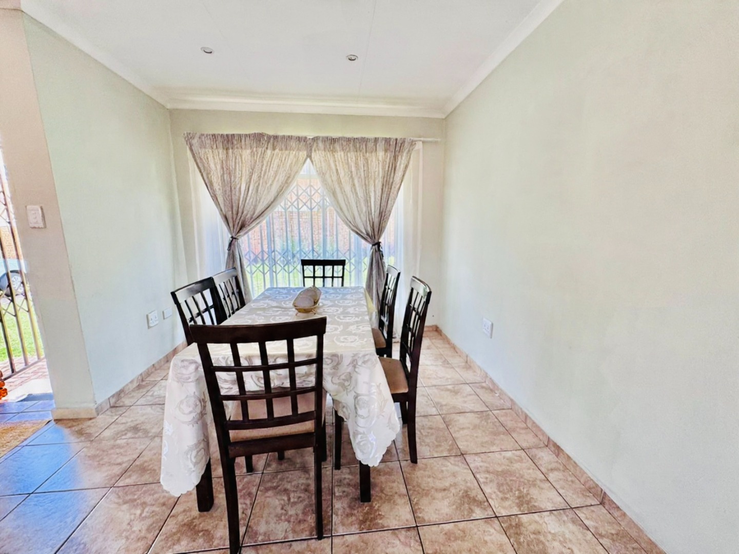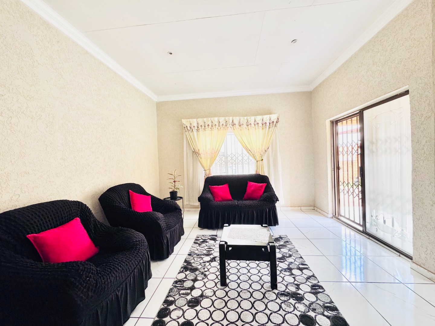 Step inside to a bright and spacious interior spanning 157 sqm. The layout features a comfortable lounge, a dedicated dining room, and a functional kitchen. Modern tiled flooring flows throughout, creating a clean and cohesive aesthetic. The living areas are further enhanced by accent walls with stylish brick-like and stone patterns, adding character. Natural light floods the space through large windows and sliding doors, which are also fitted with security gates.