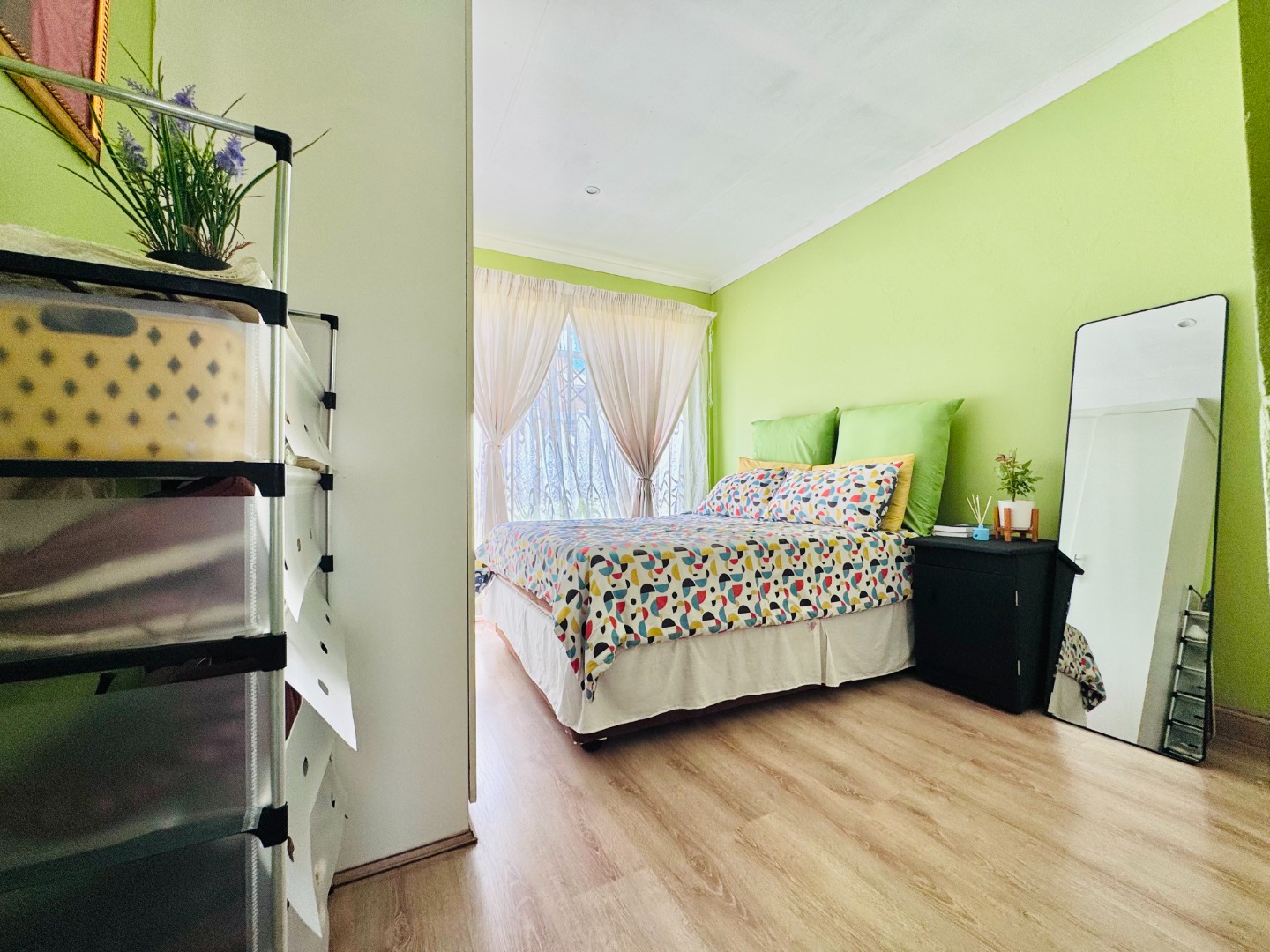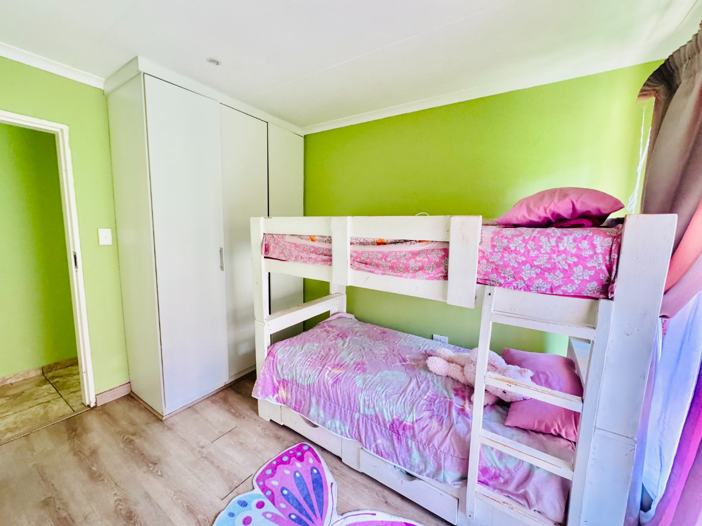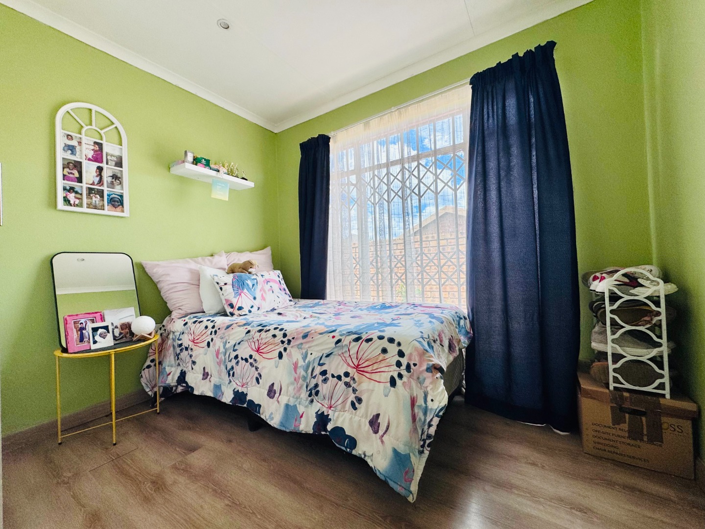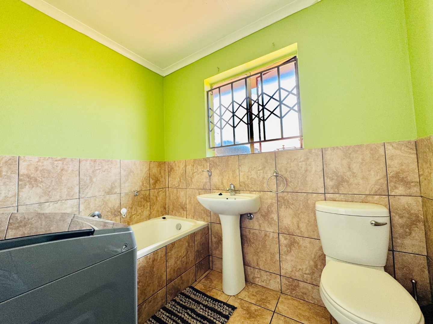 Step inside to a bright and spacious interior spanning 157 sqm. The layout features a comfortable lounge, a dedicated dining room, and a functional kitchen. Modern tiled flooring flows throughout, creating a clean and cohesive aesthetic. The living areas are further enhanced by accent walls with stylish brick-like and stone patterns, adding character. Natural light floods the space through large windows and sliding doors, which are also fitted with security gates.