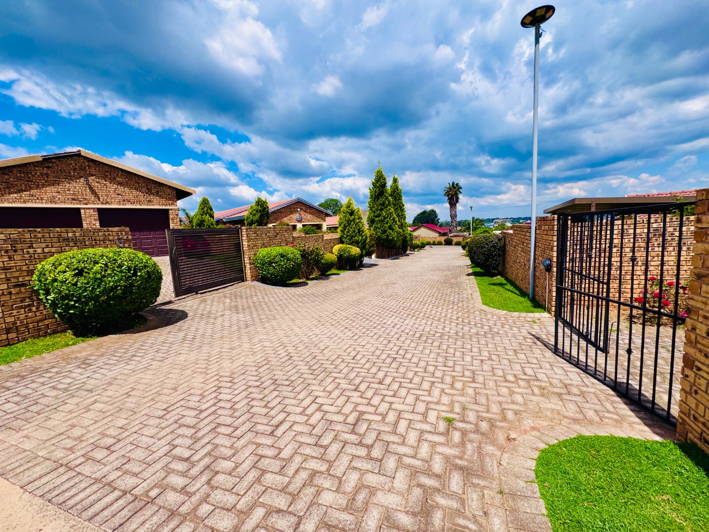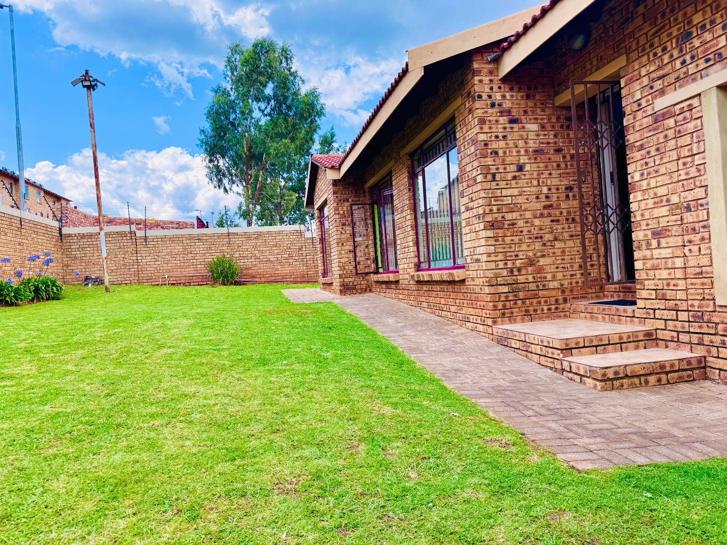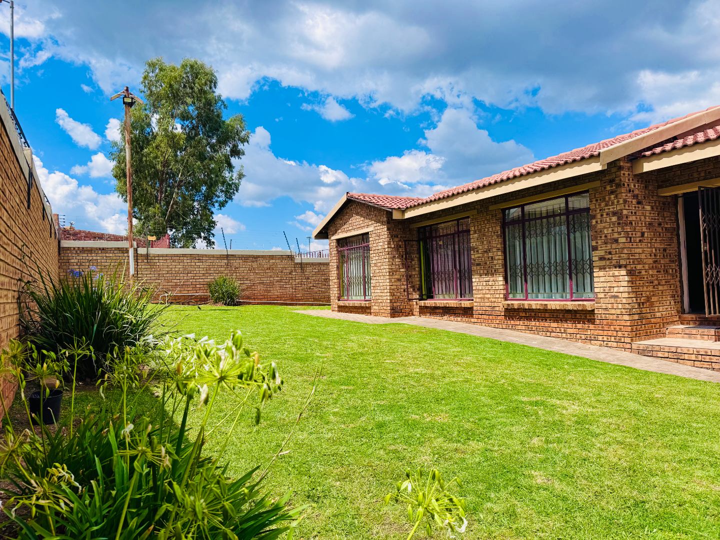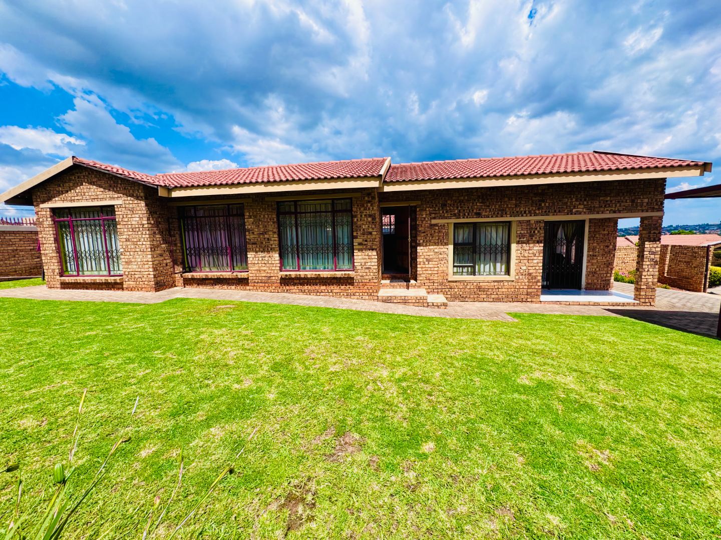 Discover this inviting residential property for sale in Groblerpark, Roodepoort, South Africa, offering a blend of comfort and security. The home presents a strong kerb appeal with its durable face brick exterior, red tiled roof, and a spacious, well-maintained green lawn complemented by paved pathways. Enhanced security features, including high perimeter walls, electric fencing, an access gate, and robust burglar bars on windows and doors, provide peace of mind within this complex and gated community.