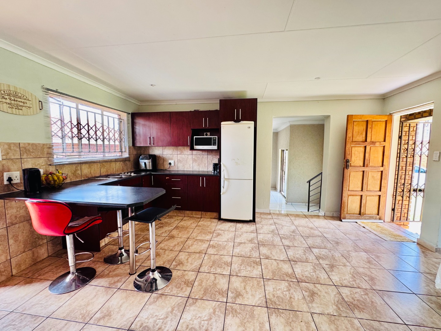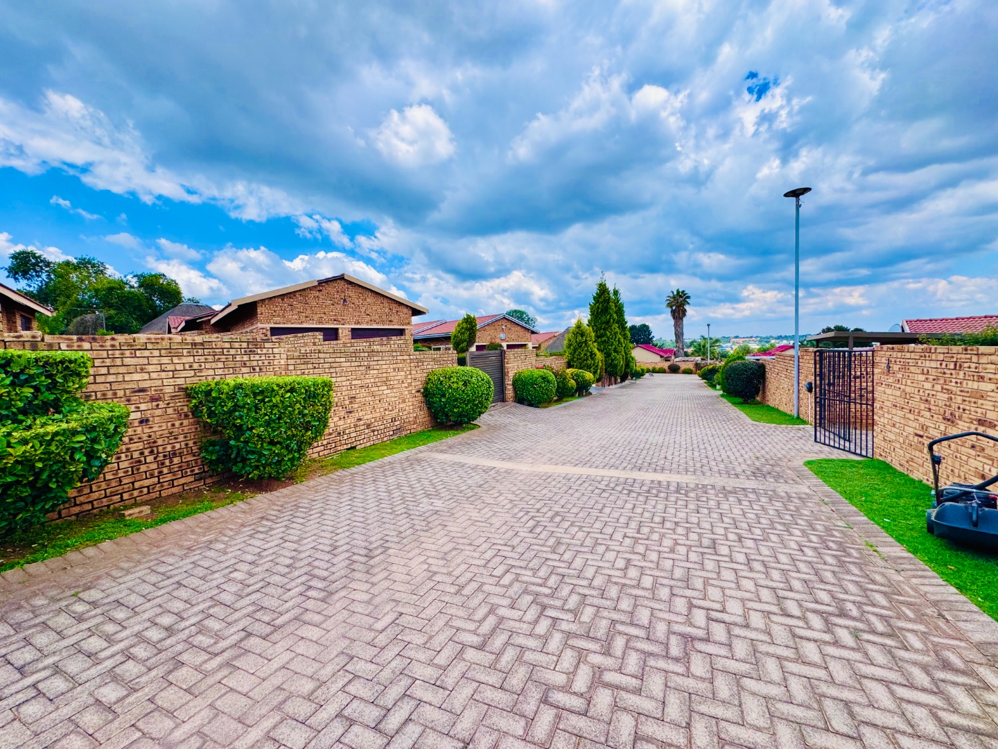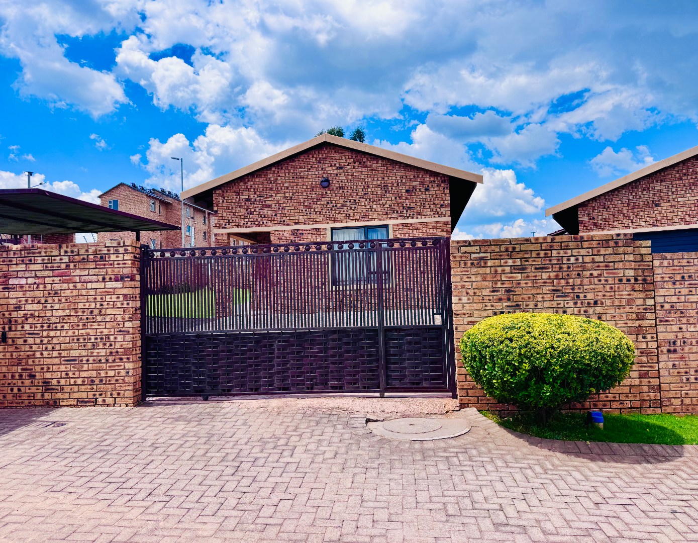 Discover this inviting residential property for sale in Groblerpark, Roodepoort, South Africa, offering a blend of comfort and security. The home presents a strong kerb appeal with its durable face brick exterior, red tiled roof, and a spacious, well-maintained green lawn complemented by paved pathways. Enhanced security features, including high perimeter walls, electric fencing, an access gate, and robust burglar bars on windows and doors, provide peace of mind within this complex and gated community.