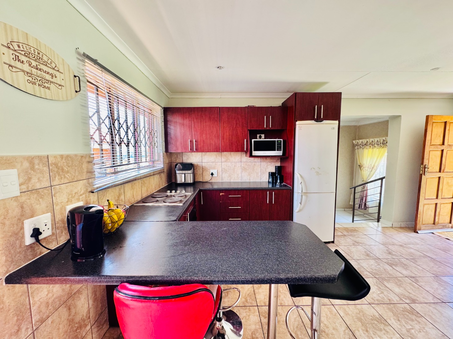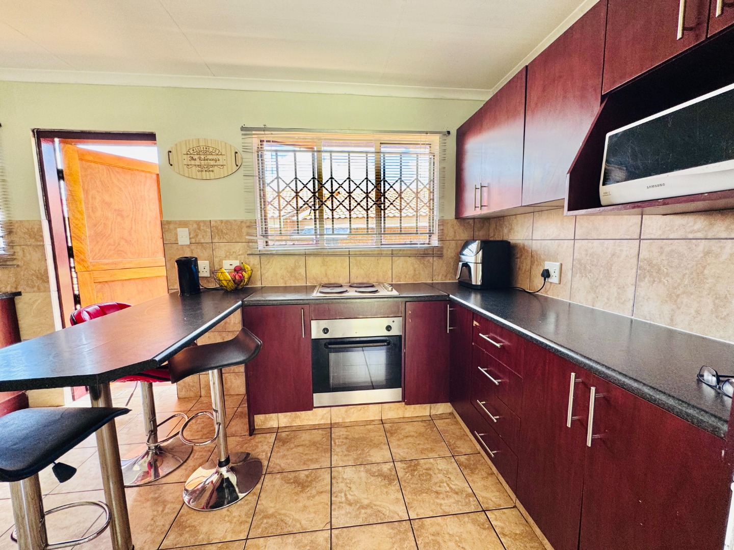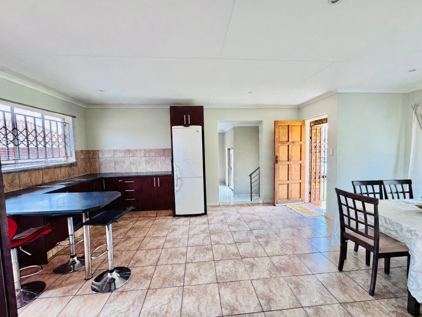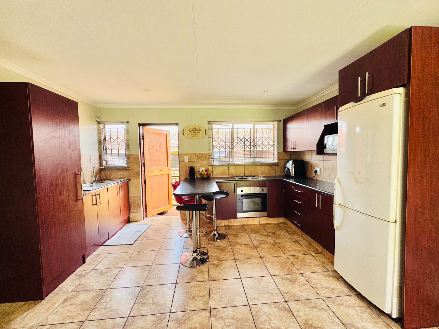 Discover this inviting residential property for sale in Groblerpark, Roodepoort, South Africa, offering a blend of comfort and security. The home presents a strong kerb appeal with its durable face brick exterior, red tiled roof, and a spacious, well-maintained green lawn complemented by paved pathways. Enhanced security features, including high perimeter walls, electric fencing, an access gate, and robust burglar bars on windows and doors, provide peace of mind within this complex and gated community.