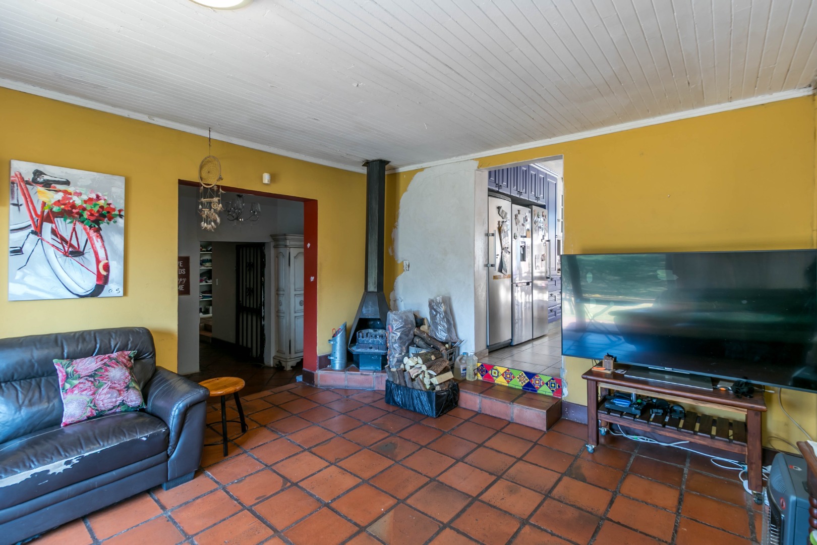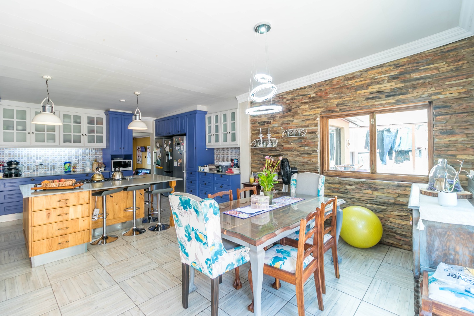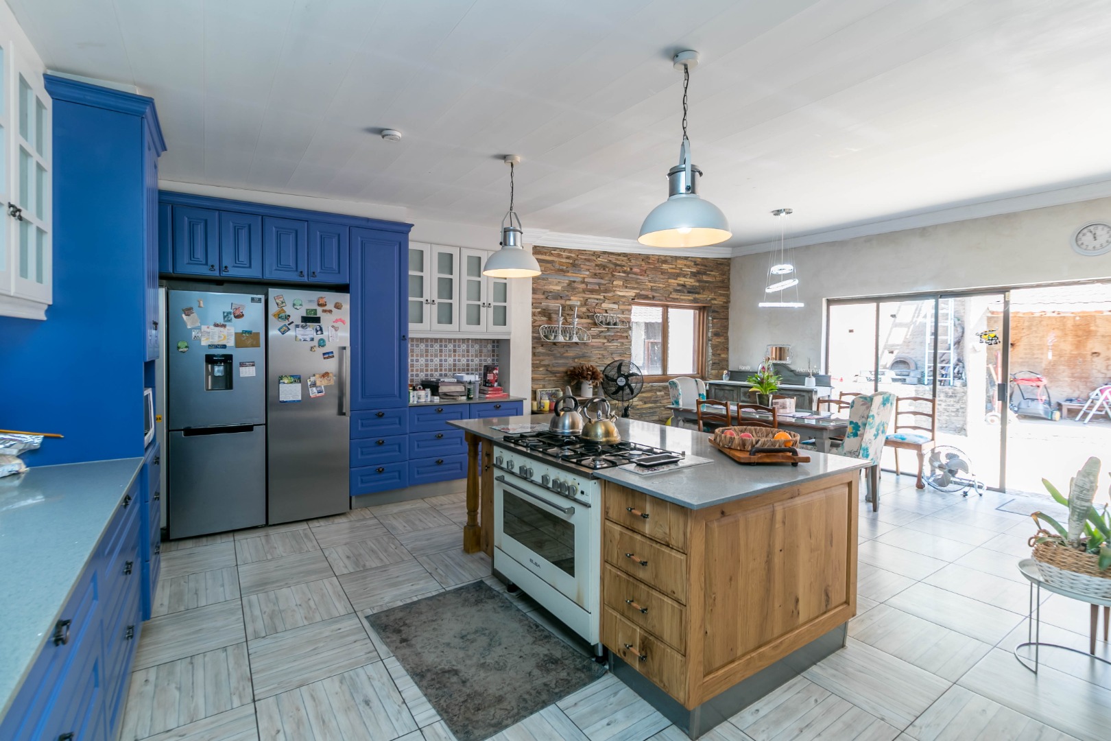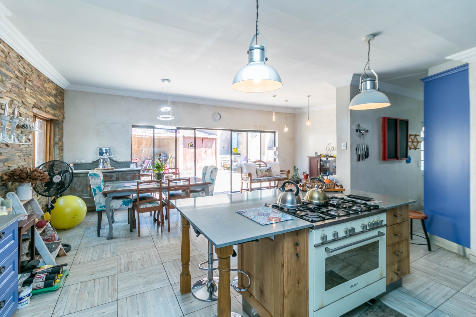 - Huge open-plan kitchen with gas stove, dining room, and separate TV room