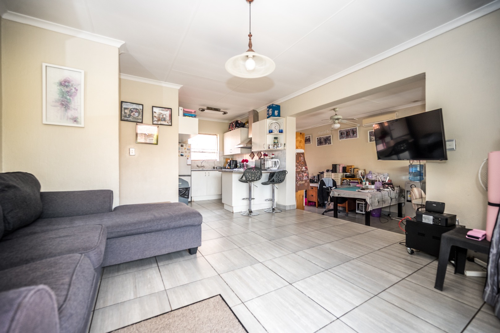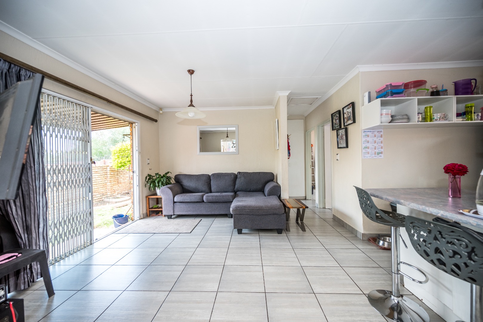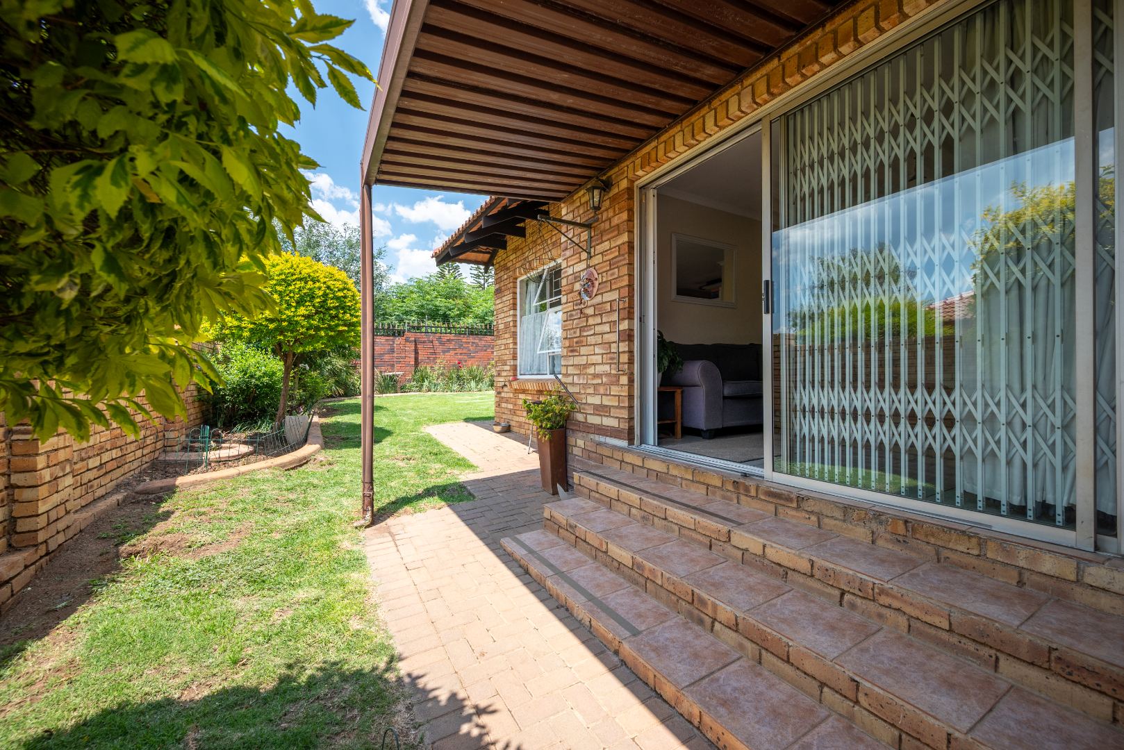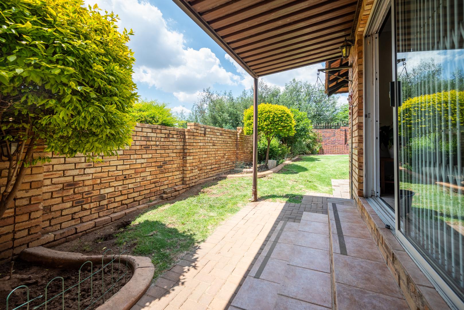 This unit with lounge and dining room and large garden is in Security Estate. This unit offers 2 sunny bedrooms with build-in-cupboards. There is a full bathroom with bath and shower. The kitchen offer place for appliance and is open plan to living area. The one garage is converted into an extra living area. The living area leads onto patio and large garden. There is a garage and double carport. This unit is in Security Estate with excellent security. There is a play park for children. This is a must view unit. Phone today to view!!!!