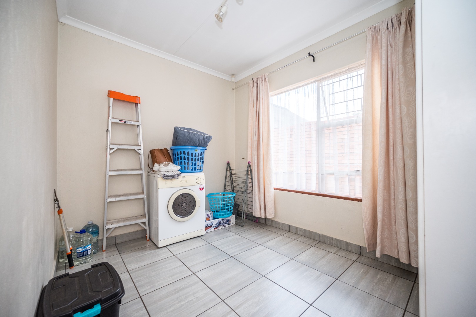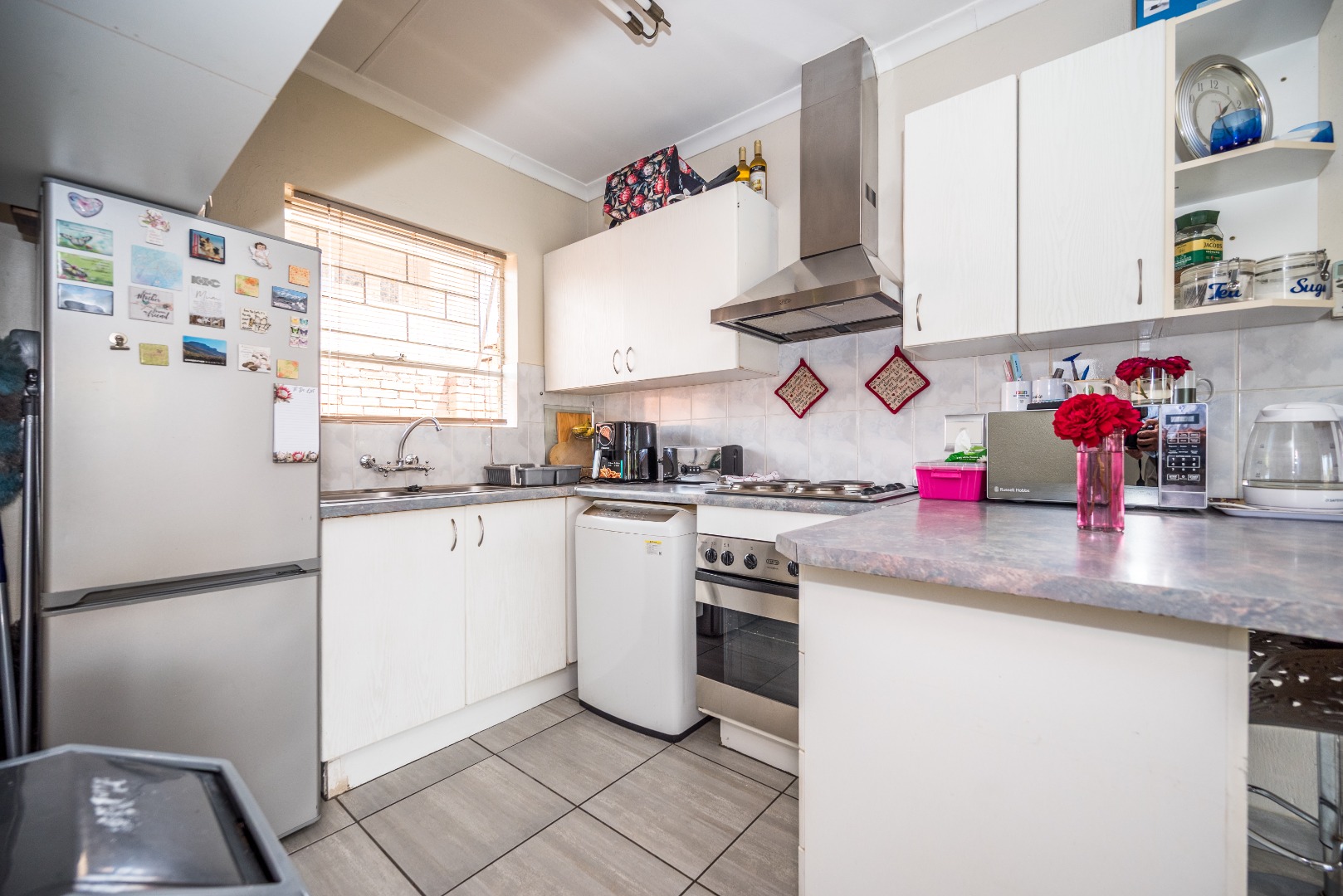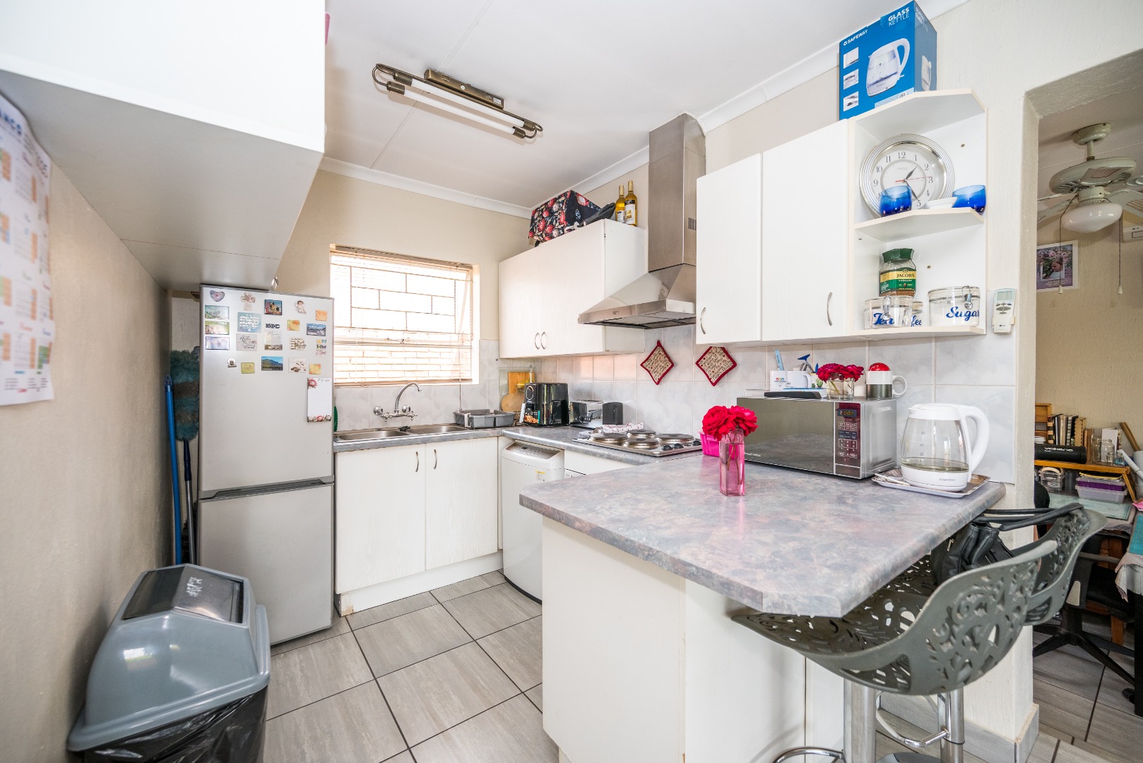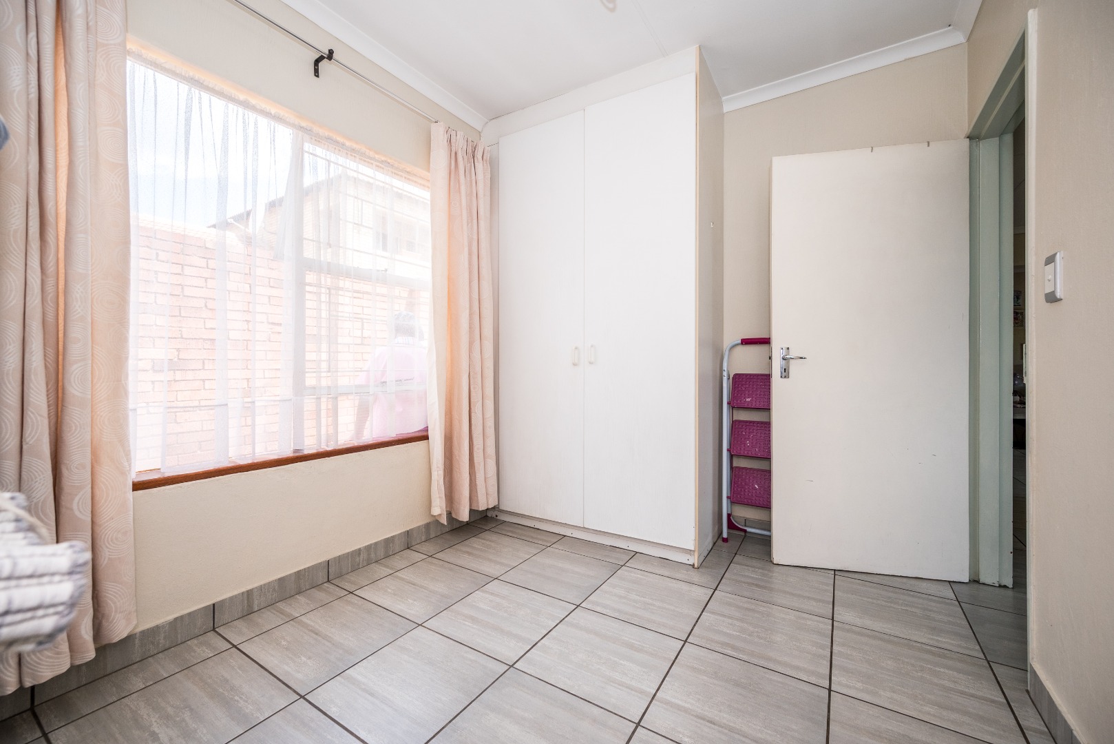 This unit with lounge and dining room and large garden is in Security Estate. This unit offers 2 sunny bedrooms with build-in-cupboards. There is a full bathroom with bath and shower. The kitchen offer place for appliance and is open plan to living area. The one garage is converted into an extra living area. The living area leads onto patio and large garden. There is a garage and double carport. This unit is in Security Estate with excellent security. There is a play park for children. This is a must view unit. Phone today to view!!!!