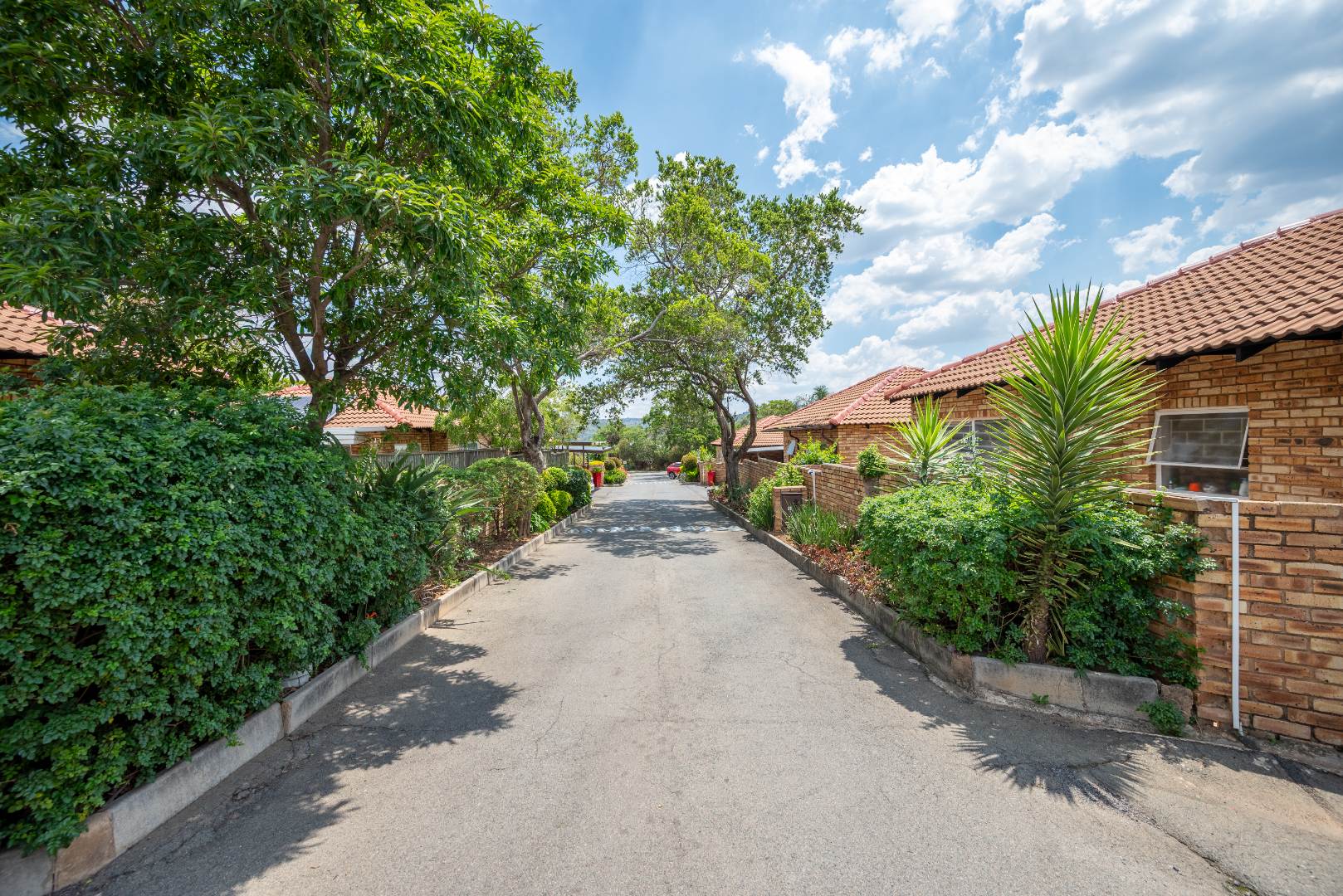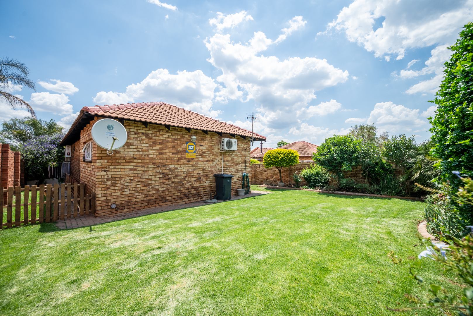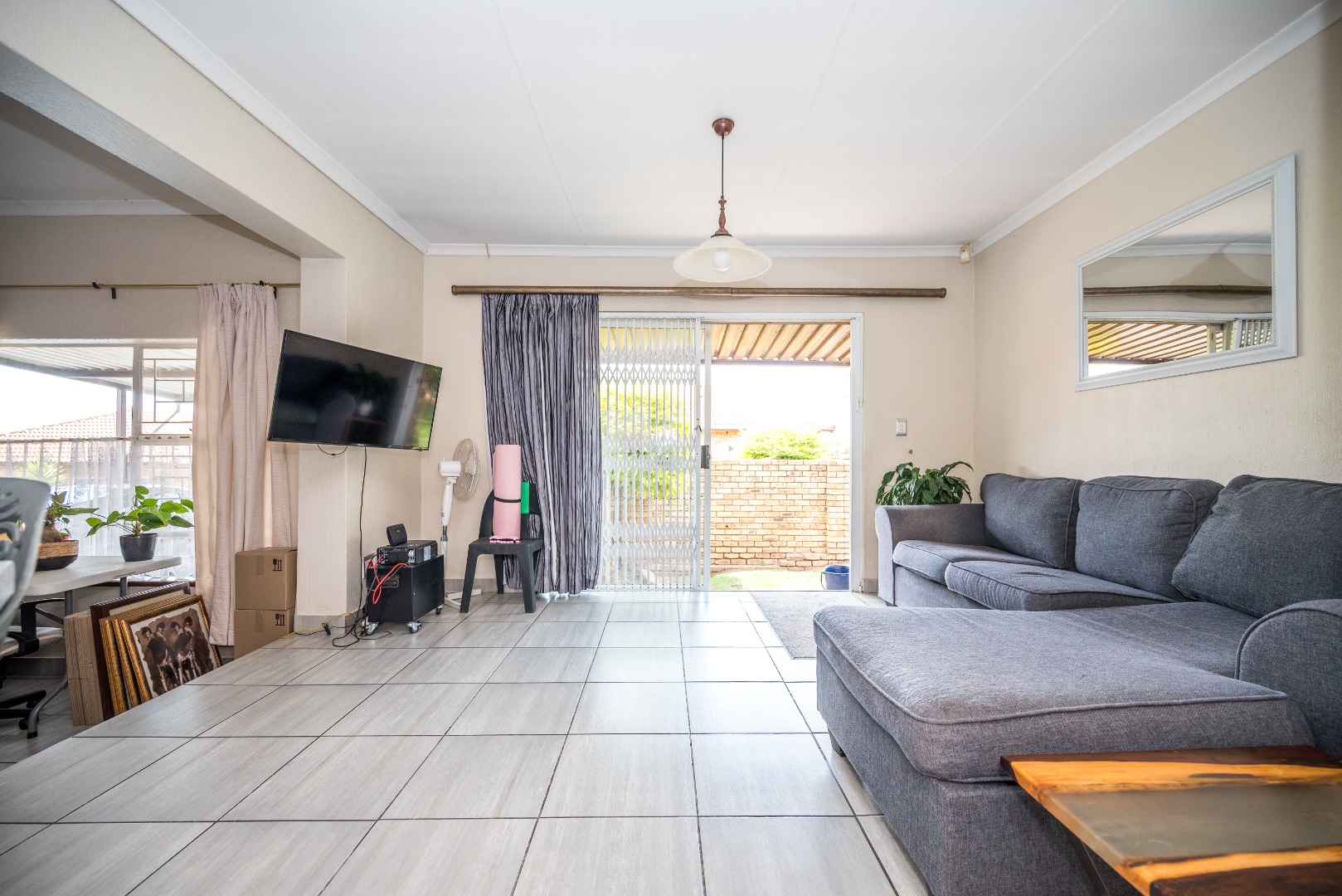 This unit with lounge and dining room and large garden is in Security Estate. This unit offers 2 sunny bedrooms with build-in-cupboards. There is a full bathroom with bath and shower. The kitchen offer place for appliance and is open plan to living area. The one garage is converted into an extra living area. The living area leads onto patio and large garden. There is a garage and double carport. This unit is in Security Estate with excellent security. There is a play park for children. This is a must view unit. Phone today to view!!!!