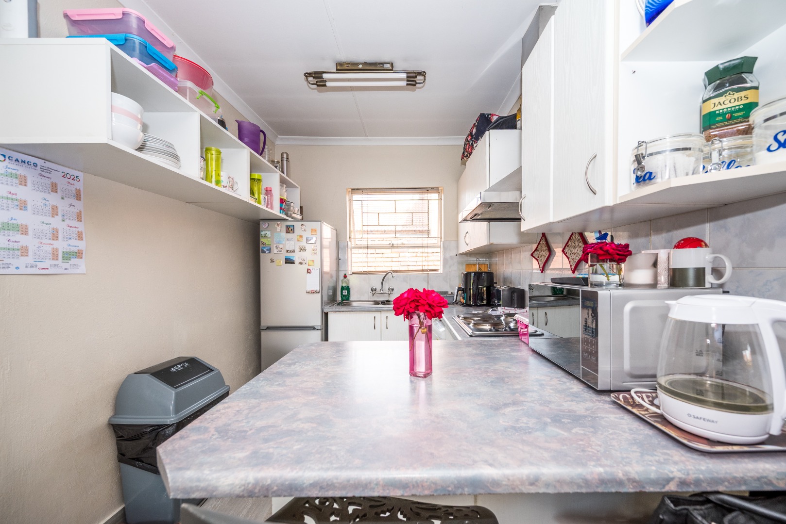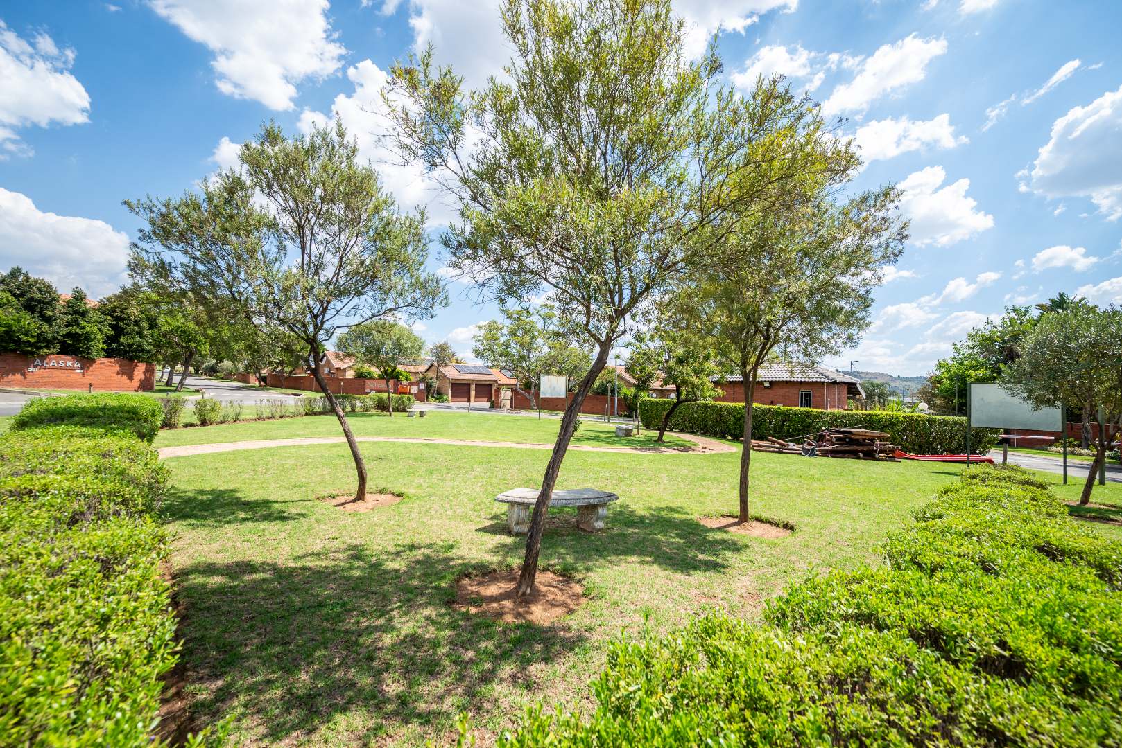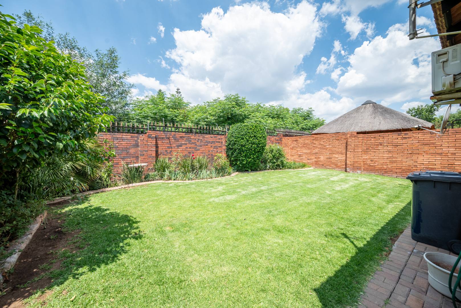 This unit with lounge and dining room and large garden is in Security Estate. This unit offers 2 sunny bedrooms with build-in-cupboards. There is a full bathroom with bath and shower. The kitchen offer place for appliance and is open plan to living area. The one garage is converted into an extra living area. The living area leads onto patio and large garden. There is a garage and double carport. This unit is in Security Estate with excellent security. There is a play park for children. This is a must view unit. Phone today to view!!!!
