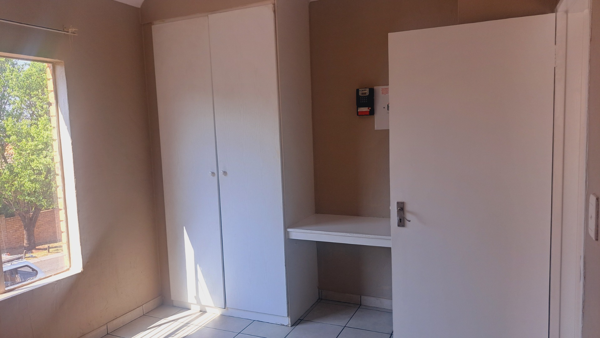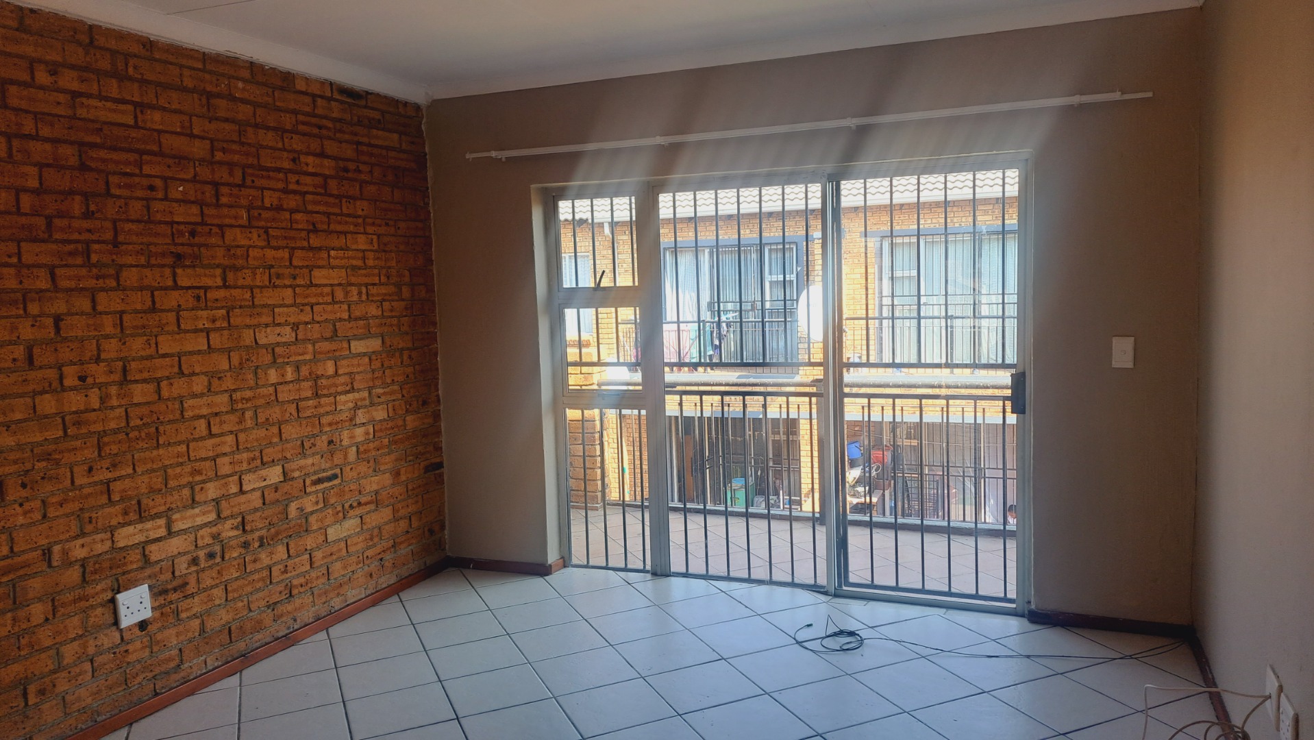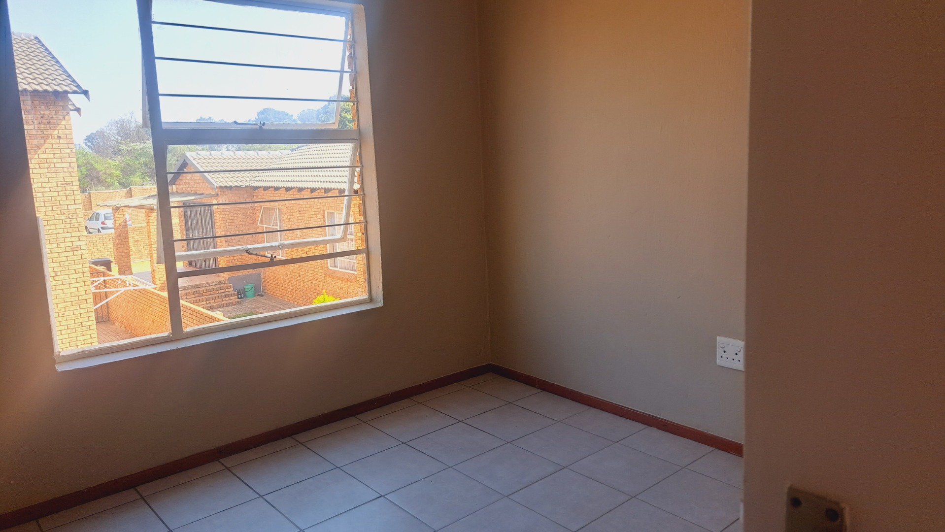 Both bedrooms are designed for comfort, featuring neutral wall colours and continued tiled flooring. The main bedroom includes a spacious built-in wardrobe, offering ample storage solutions. The single bathroom serves both bedrooms efficiently. Security is enhanced with security bars on windows and a security gate on the exterior door, complemented by the complex's 24-hour security and access gate, ensuring a secure environment for residents.