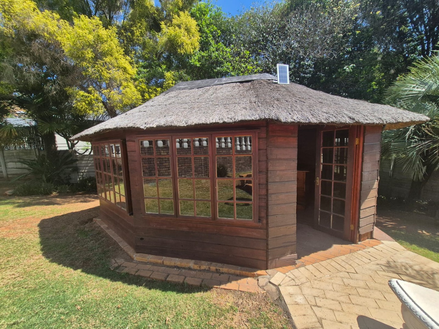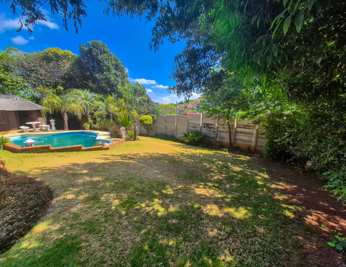 Step outside to a private oasis designed for outdoor enjoyment. The property includes a lovely garden, perfect for children and pets, complemented by a refreshing swimming pool and a lapa, providing an ideal setting for leisure and entertaining guests. A spacious patio offers an excellent spot for outdoor dining or simply unwinding. Practical features such as two garages, additional parking for four vehicles, and convenient paving enhance the property's functionality. Furthermore, the inclusion of staff quarters or domestic rooms adds to the home's versatility.
